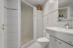 Soveværelset er rummeligt med en god skabsvæg og direkte adgang til en skøn altan, hvor du kan nyde solen i rolige omgivelser. Badeværelset er lyst og indrettet med en god bruseniche.
