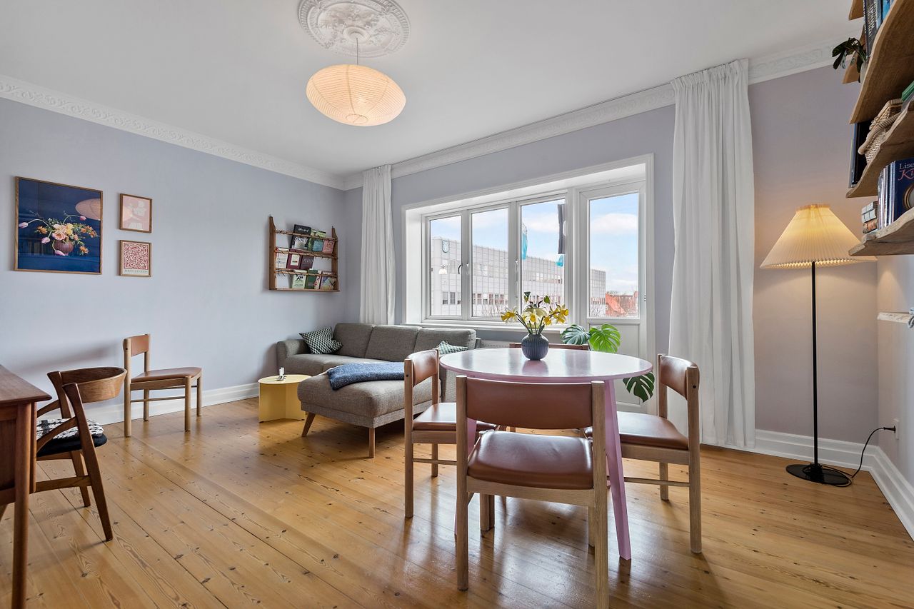 Den højloftede stue imponerer med klassiske stuklofter og smukke rosetter, og her er der plads til både spisebord og sofagruppe. Fra stuen har du en fredelig udsigt over rådhuset, som giver en helt særlig stemning.