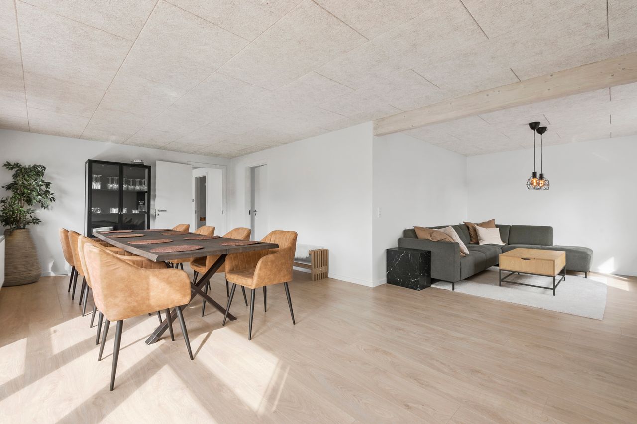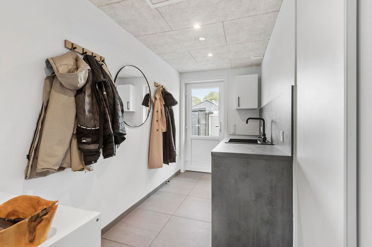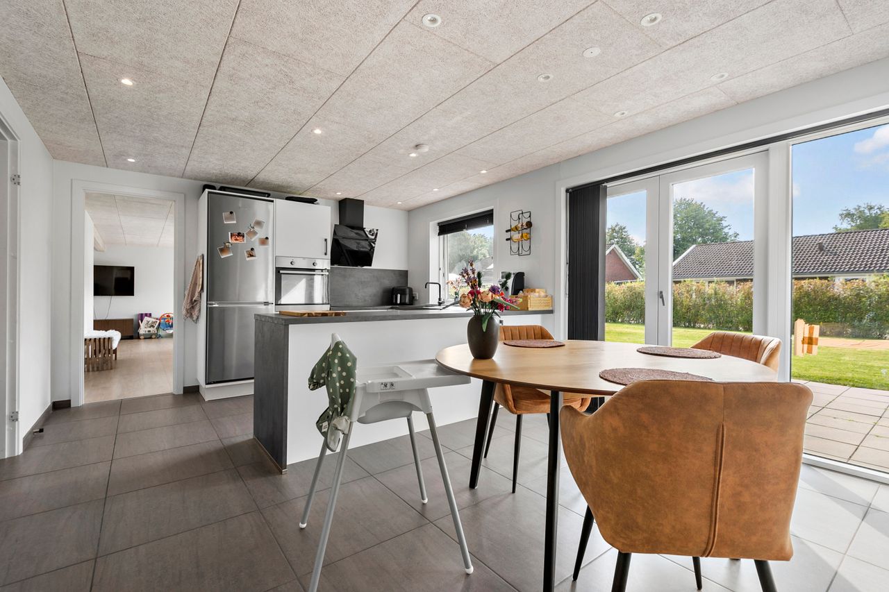 Det centrale hjerte i hjemmet er det lækre køkken/alrum, hvor lyset strømmer ind gennem store vinduer og skaber en indbydende atmosfære. Her er der rig mulighed for både madlavning og hyggelige stunder med familie og venner.