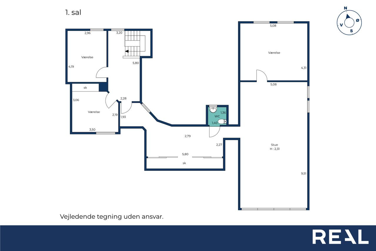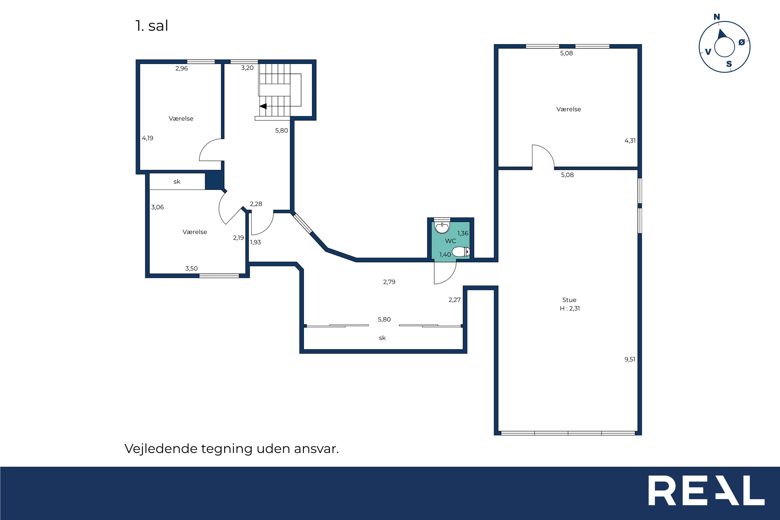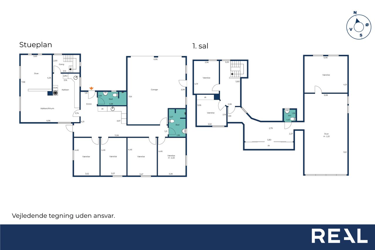 På førstesalen venter yderligere tre rummelige værelser, et ekstra toilet og et stort multirum – perfekt til hjemmeerhverv, hobby, hjemmebiograf eller måske et poolbord?