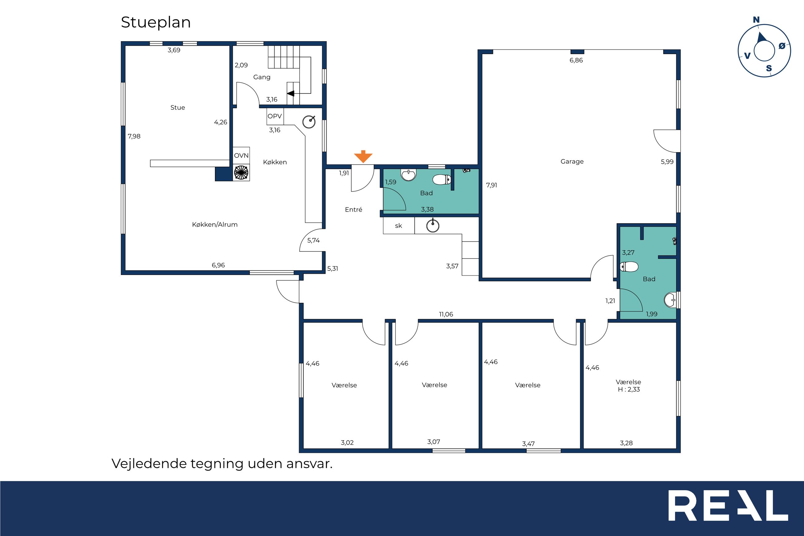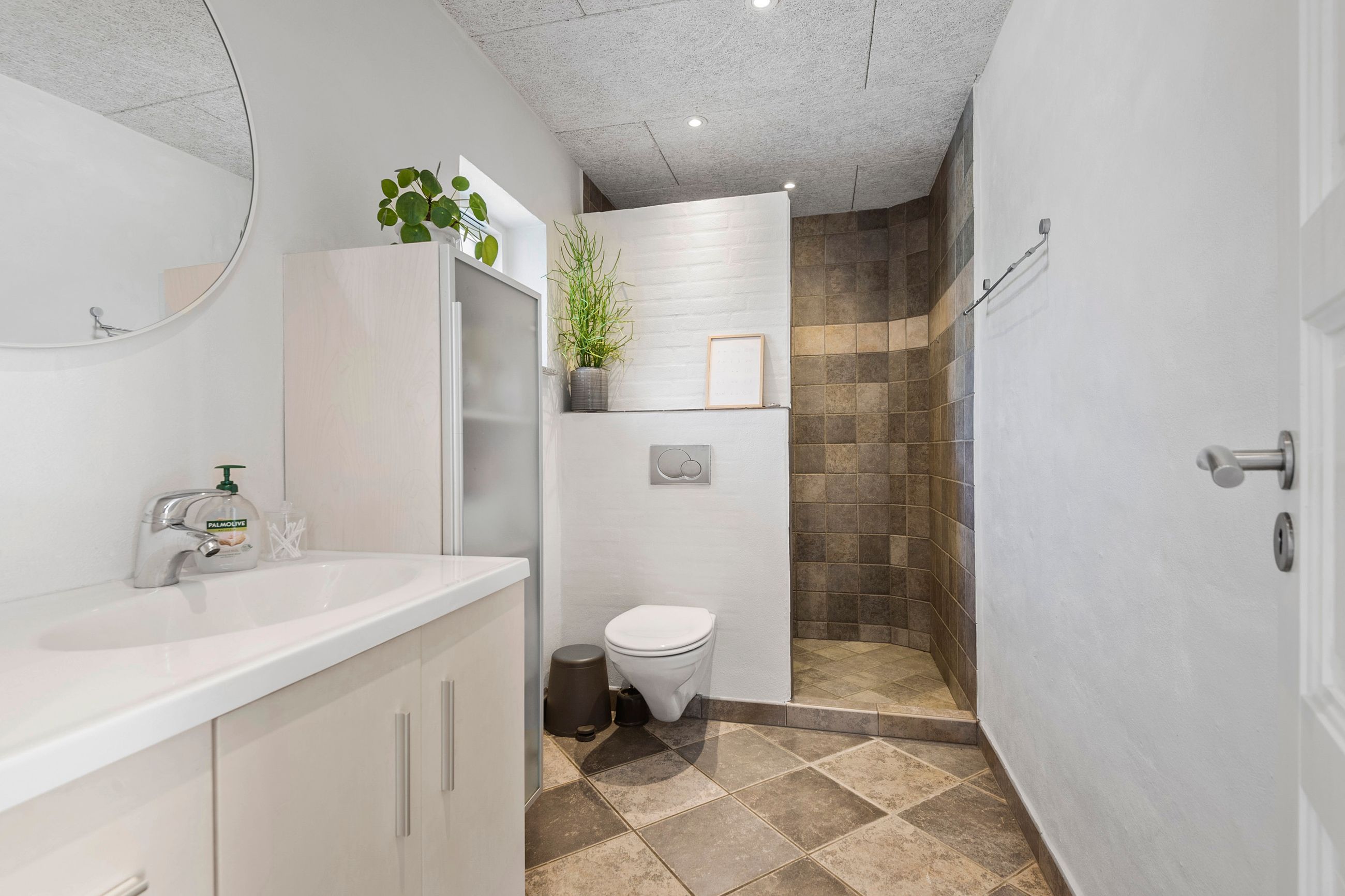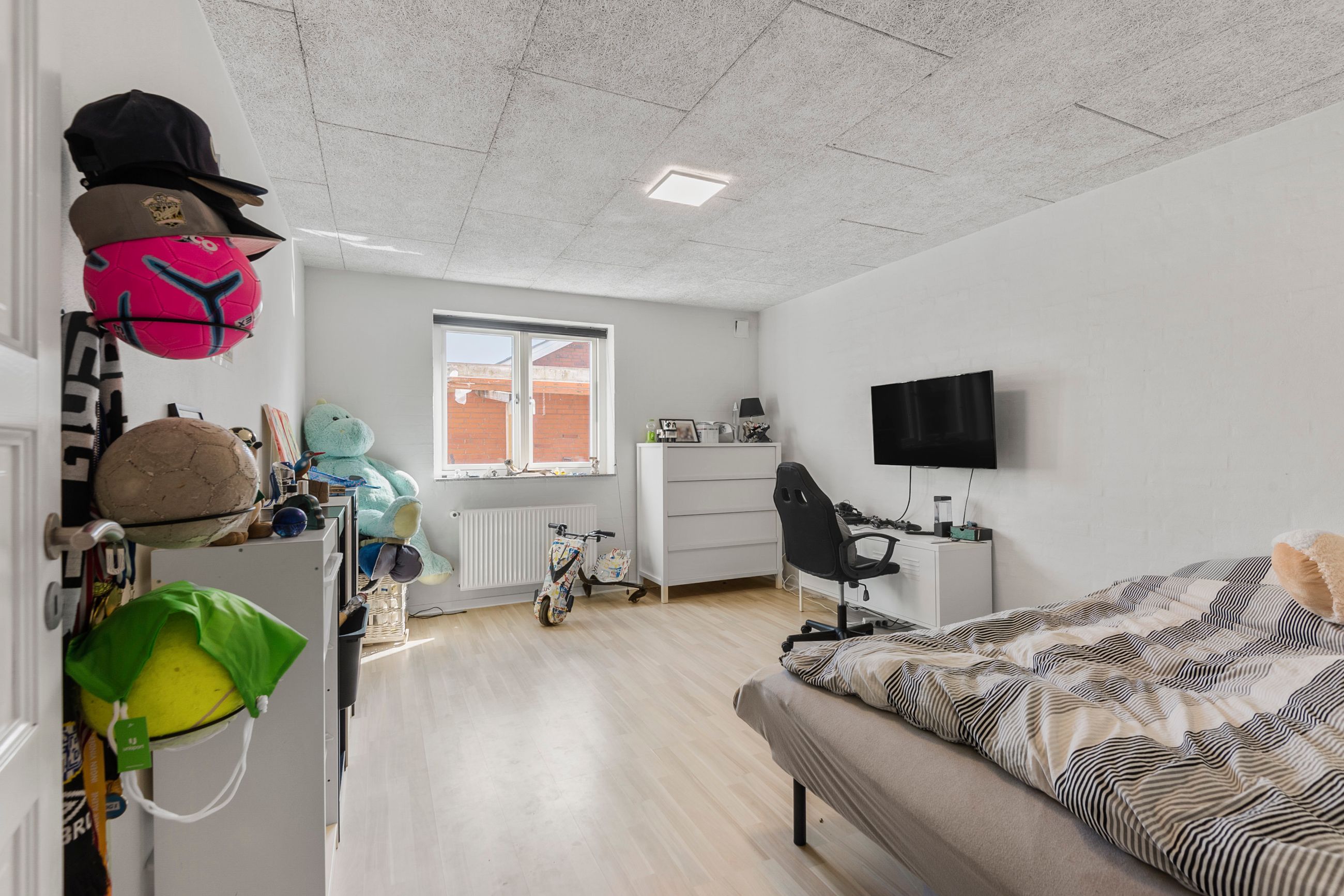 Indenfor bydes du velkommen af en stor entré, der giver adgang til to flotte badeværelse og fire store værelser – oplagt til børneværelser, kontor eller gæsteværelser.