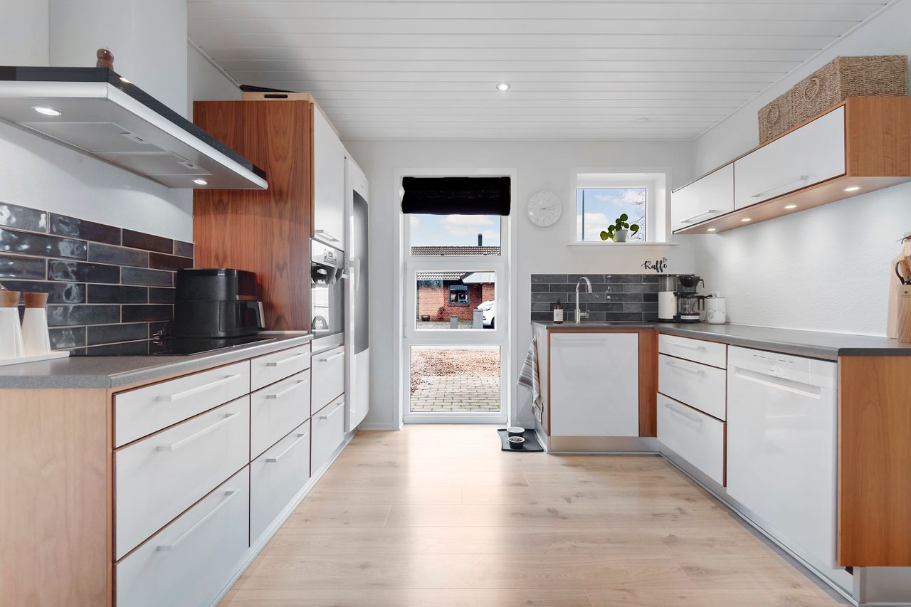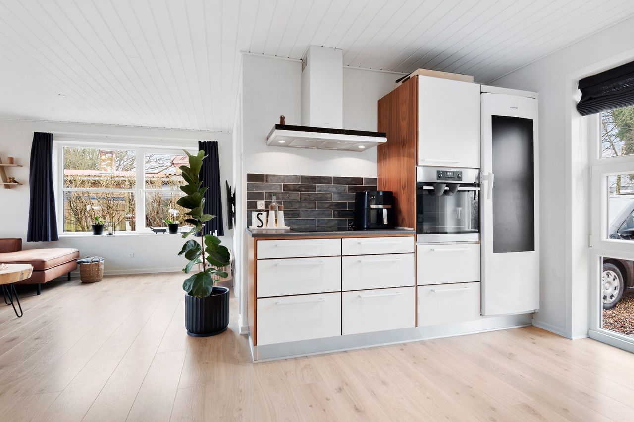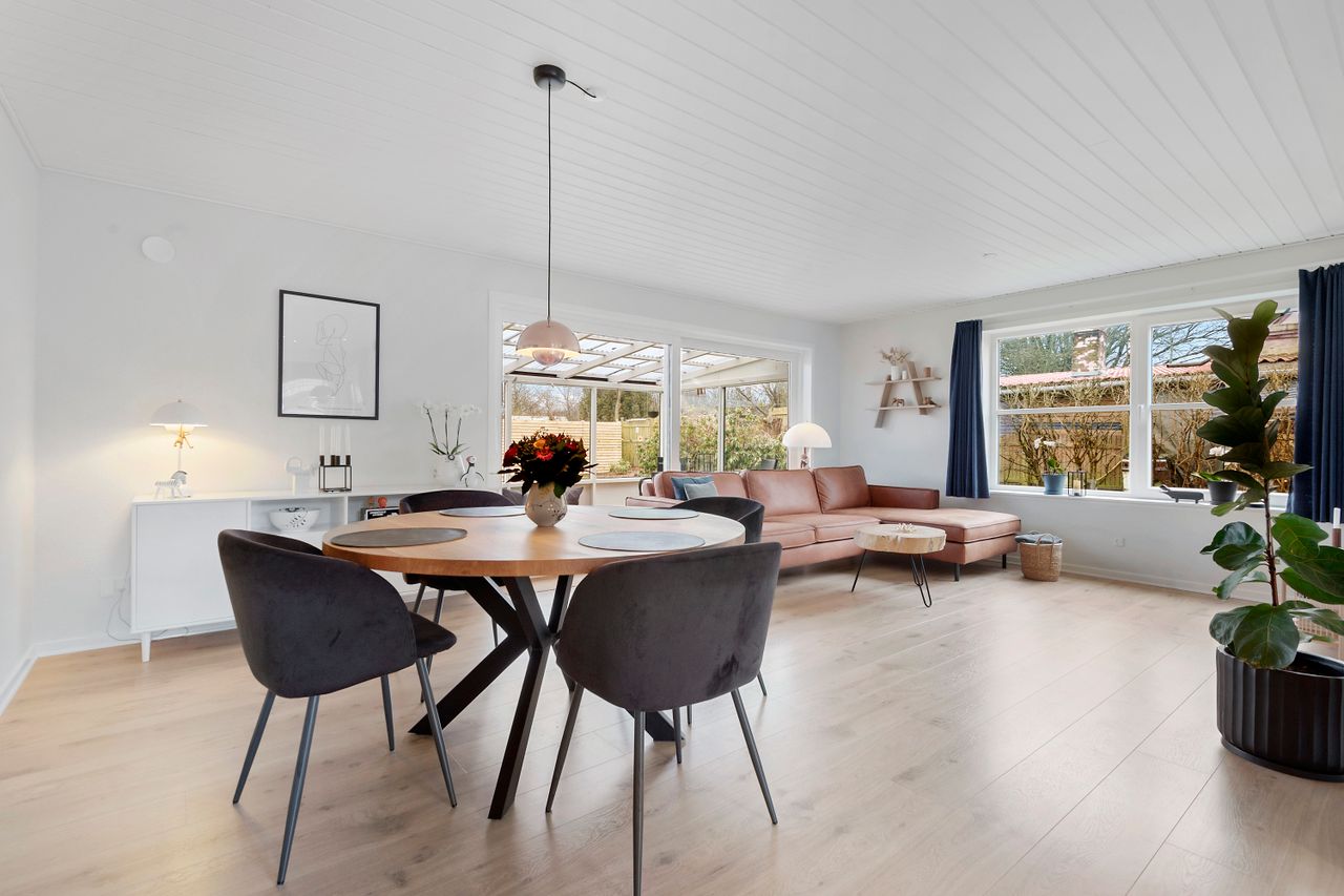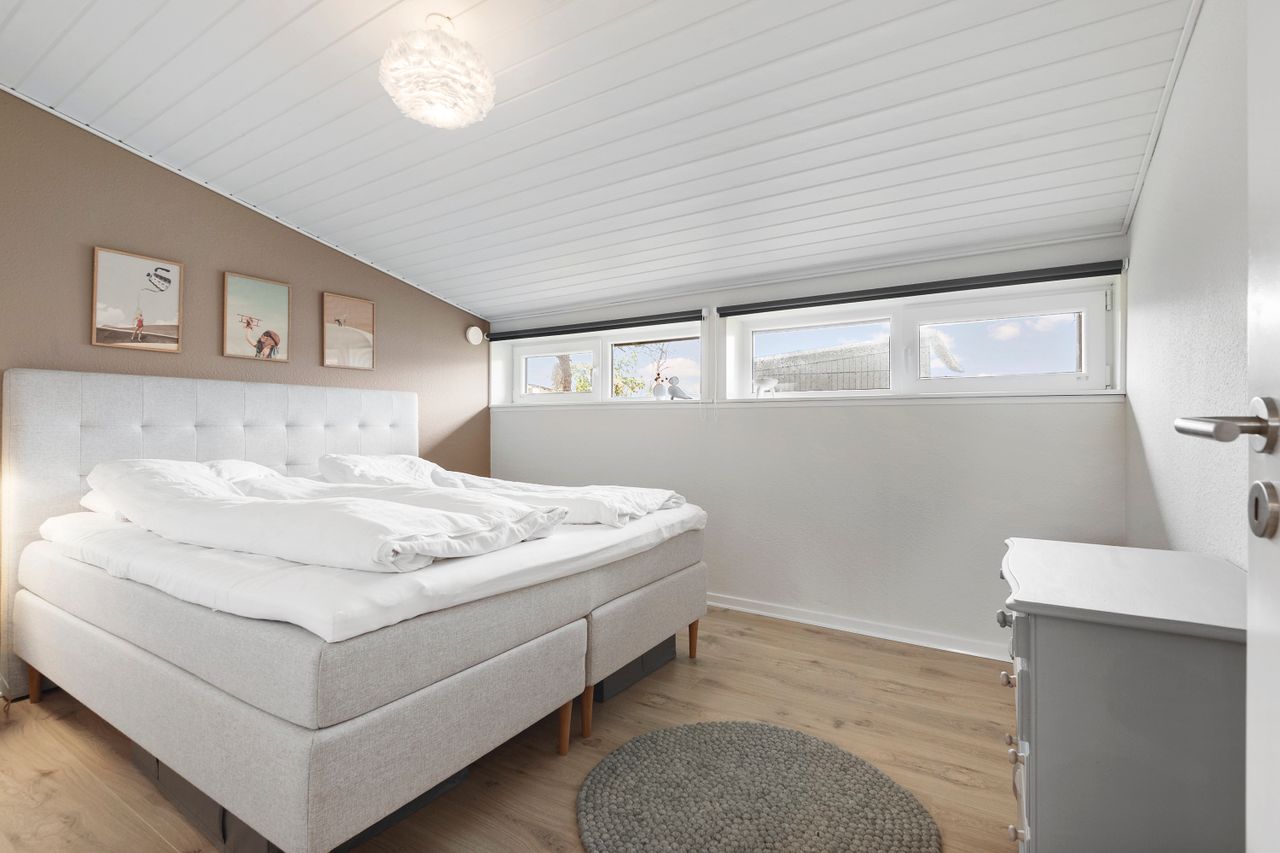 Indvendigt rummer boligen 3 rummelige værelser, som giver mulighed for både børneværelser, hjemmekontor eller gæsteværelser. Det åbne køkken/alrum og stuen i ét skaber en dejlig og lys opholdszone, hvor hele familien kan samles. Det tidløse badeværelse er lyst og funktionelt med moderne indretning, og der er et praktisk bryggers til opbevaring og vask.