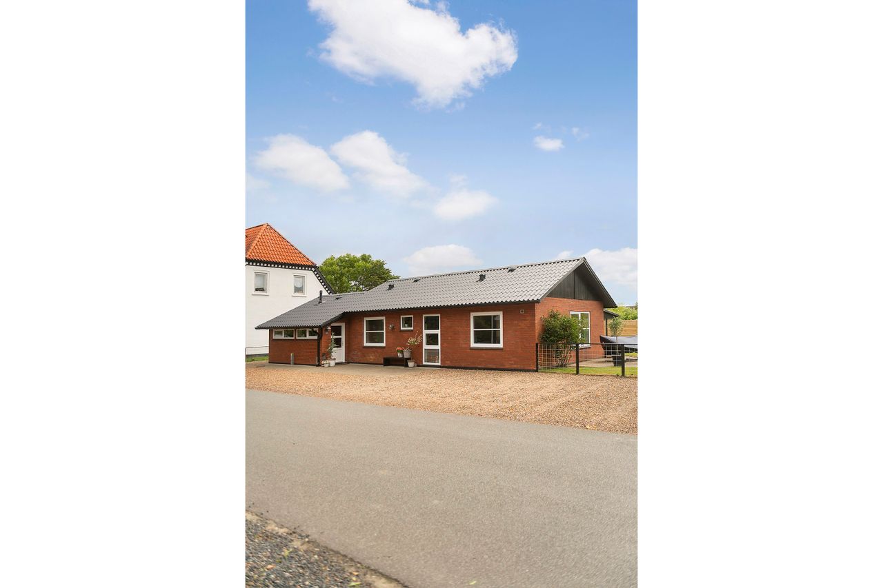 Ejendommen ligger i et roligt og naturskønt område med kort afstand til vidtstrakte grønne områder, der indbyder til udendørsaktiviteter. Samtidig er der kun få minutters kørsel til hverdagens nødvendigheder som skole og fremtidige indkøbsmuligheder, hvilket gør det praktisk at bo i området.