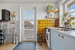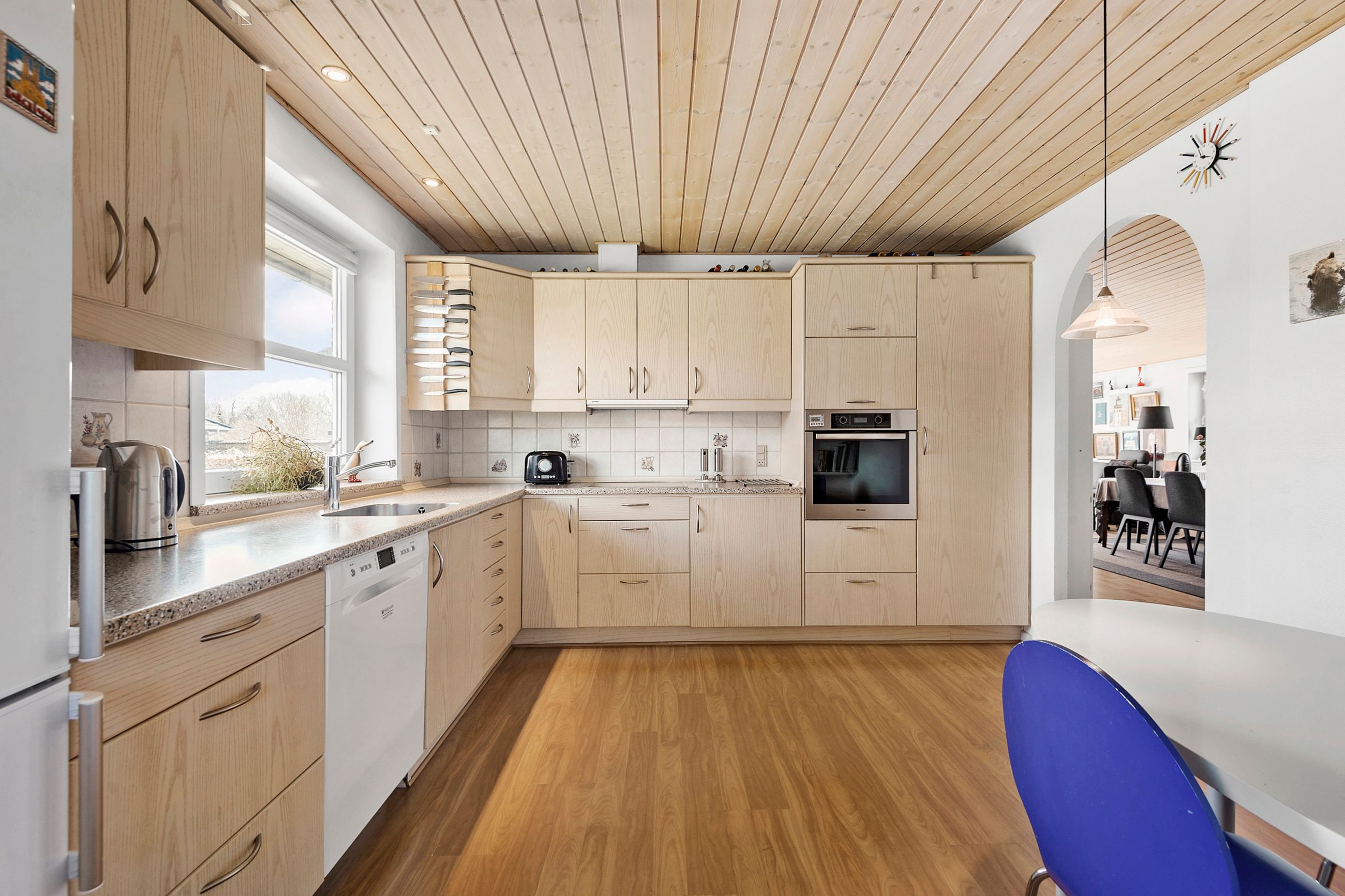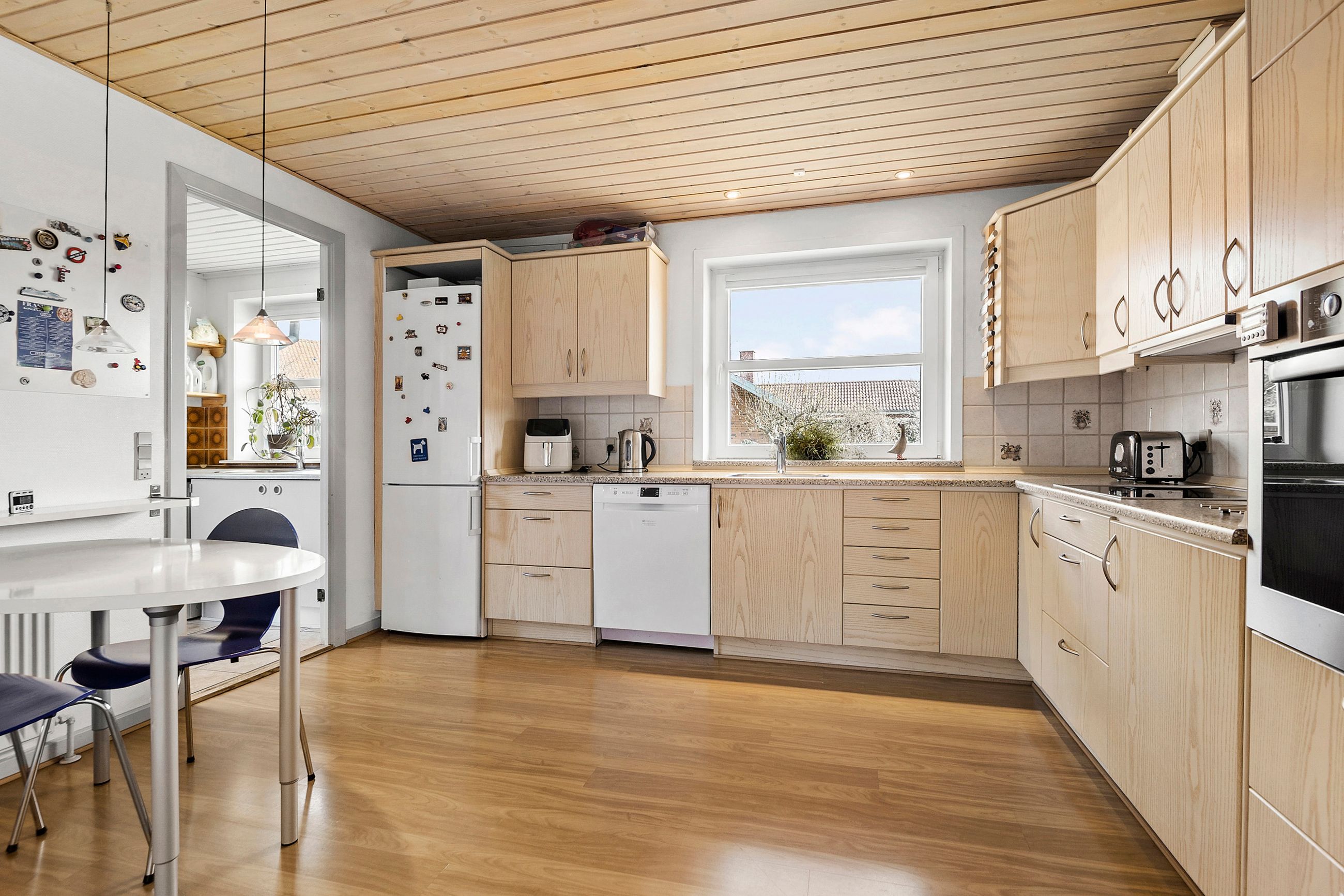 Husets hjerte er det pæne og funktionelle køkken, der ligger i åben forbindelse med den lyse spisestue og opholdsstue – et indbydende samlingspunkt for hele familien. Herfra er der også adgang til husets 2. indgang, hvor der også er et funktionelt badeværelse.