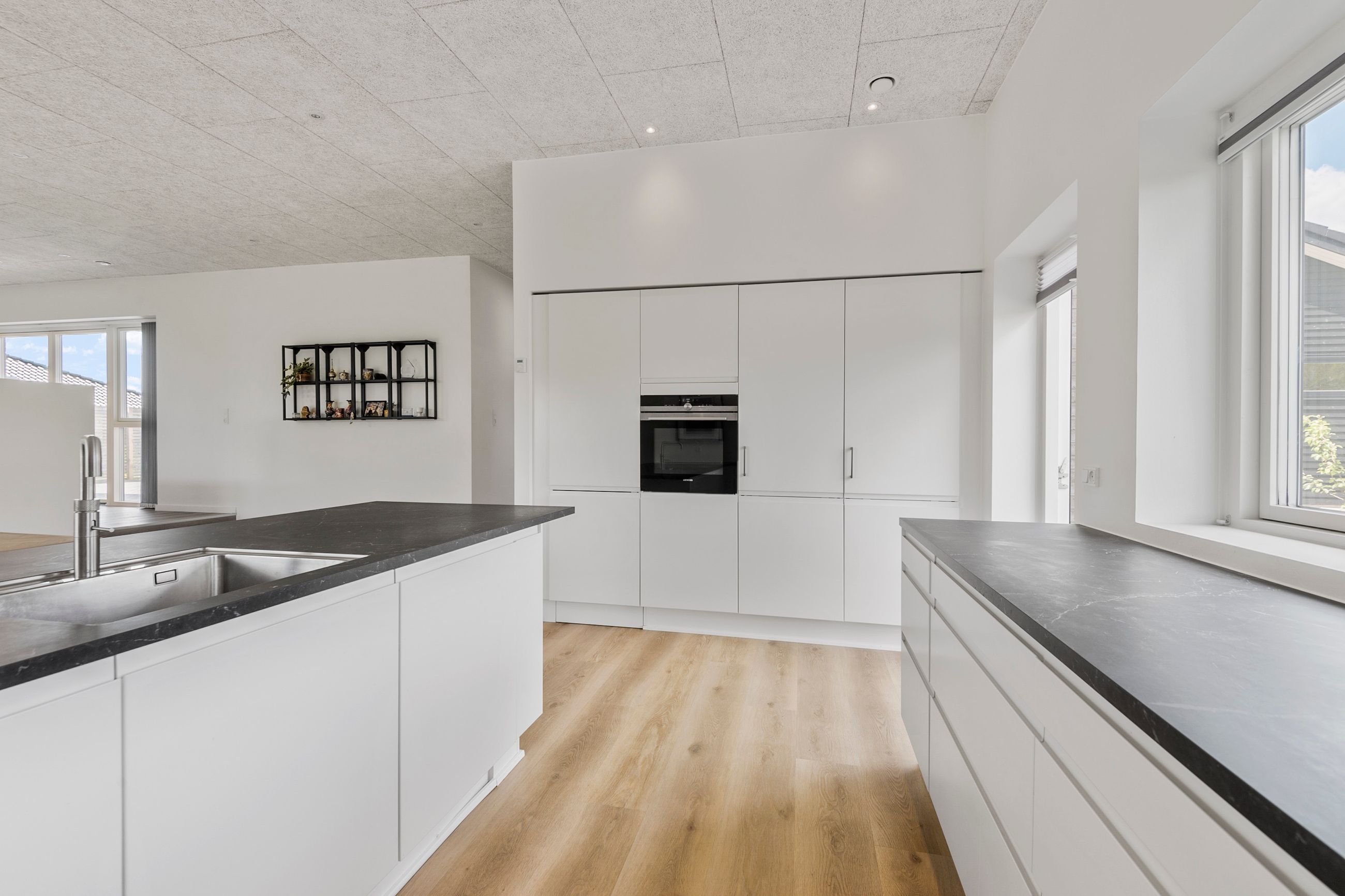 Boligens hjerte er det lyse og hyggelige opholdsområde, som består af stue og køkken/alrum med en let niveauforskel, der skaber en naturlig opdeling og giver karakter til rummet. Køkkenet er moderne og funktionelt indrettet og har desuden et praktisk viktualierum med god opbevaringsplads.