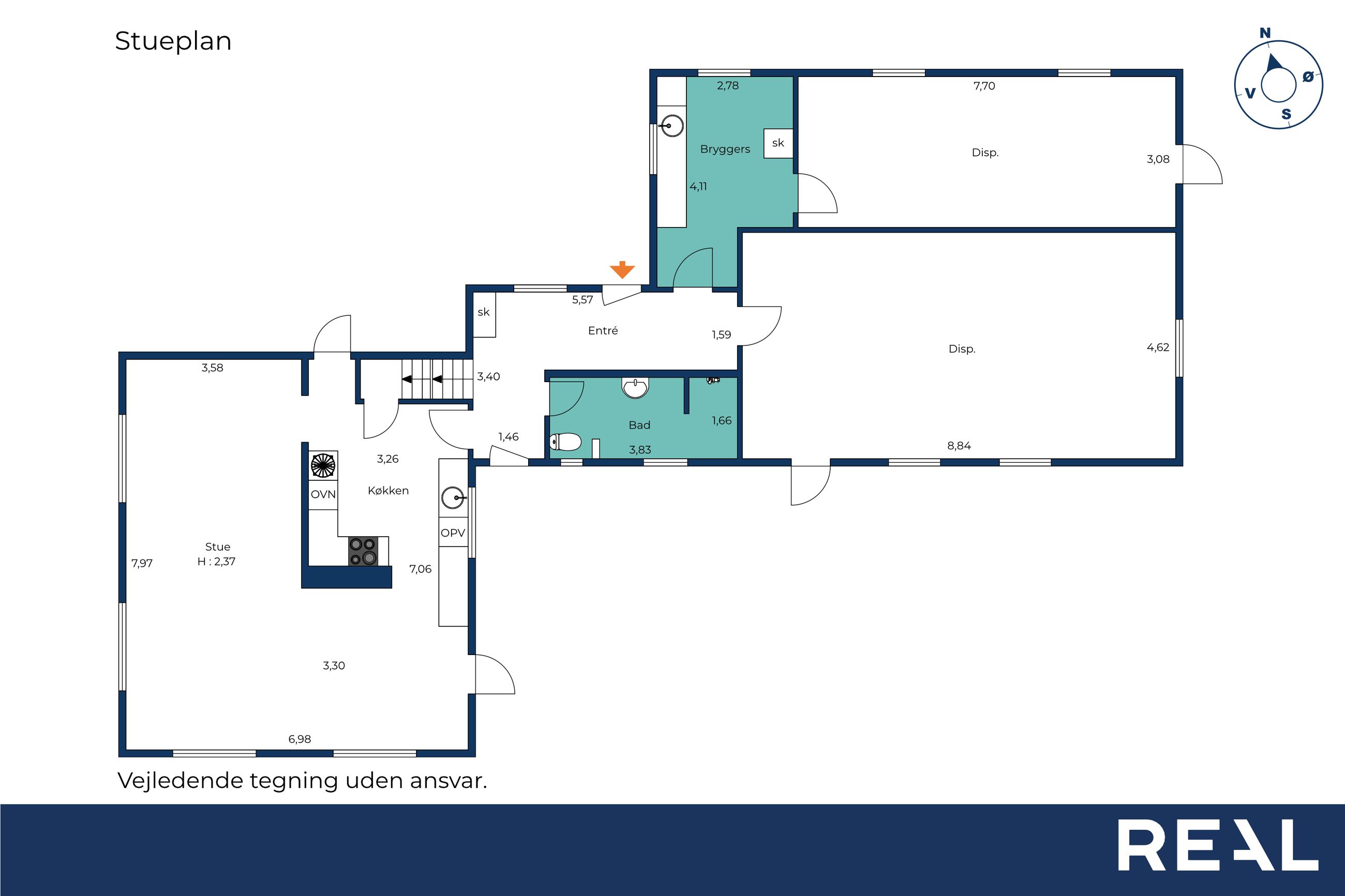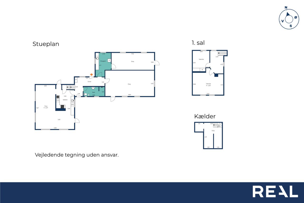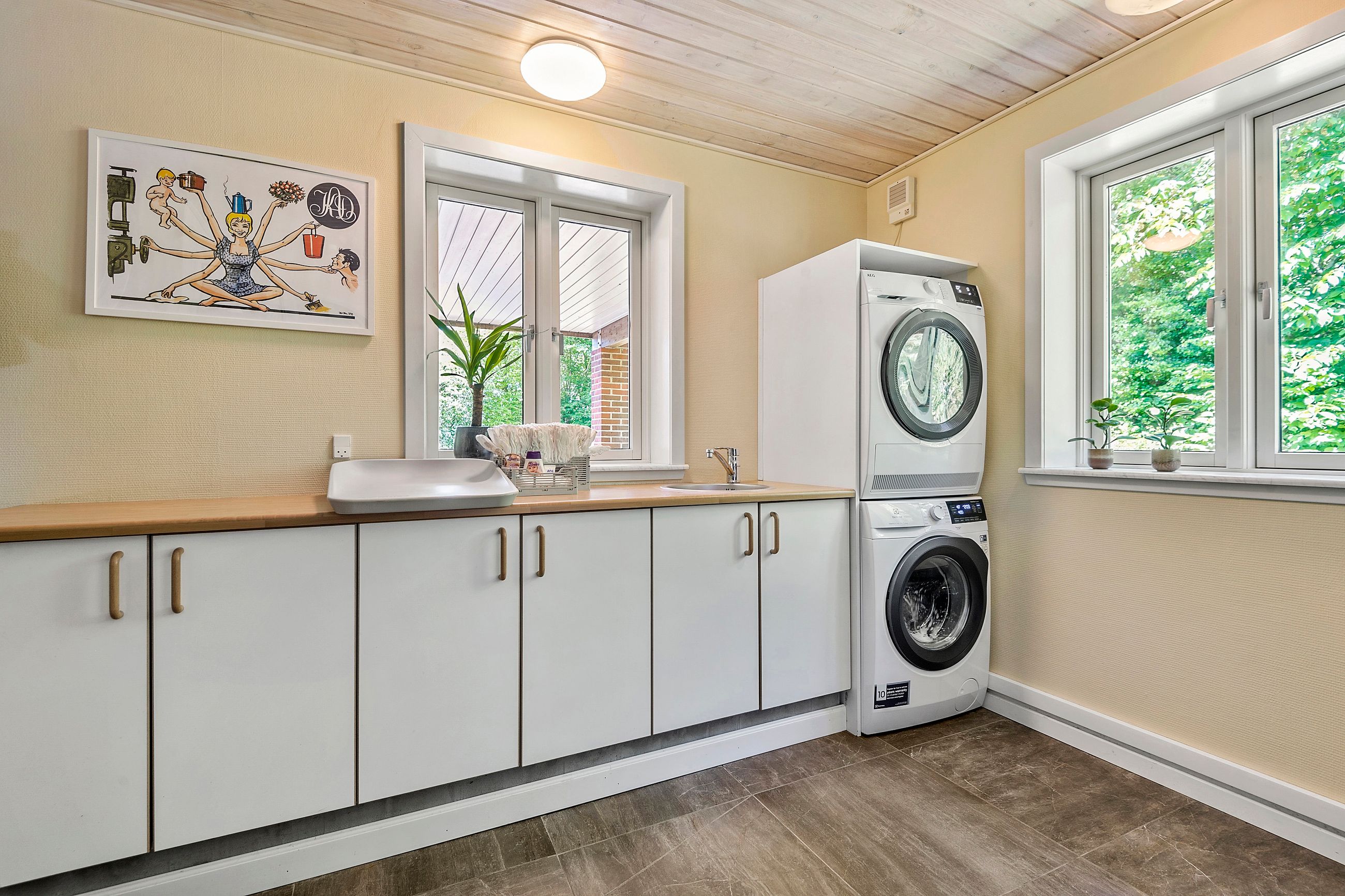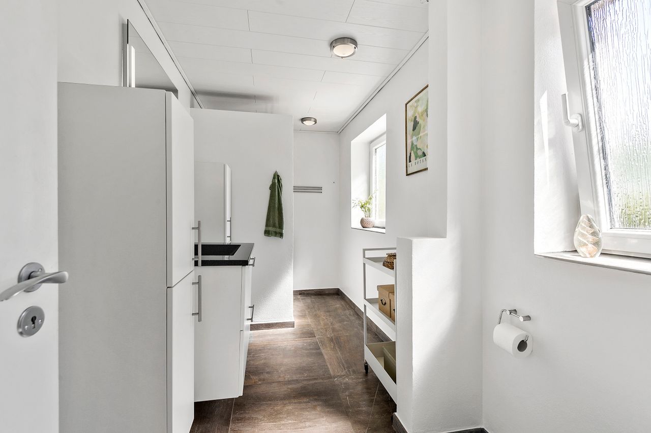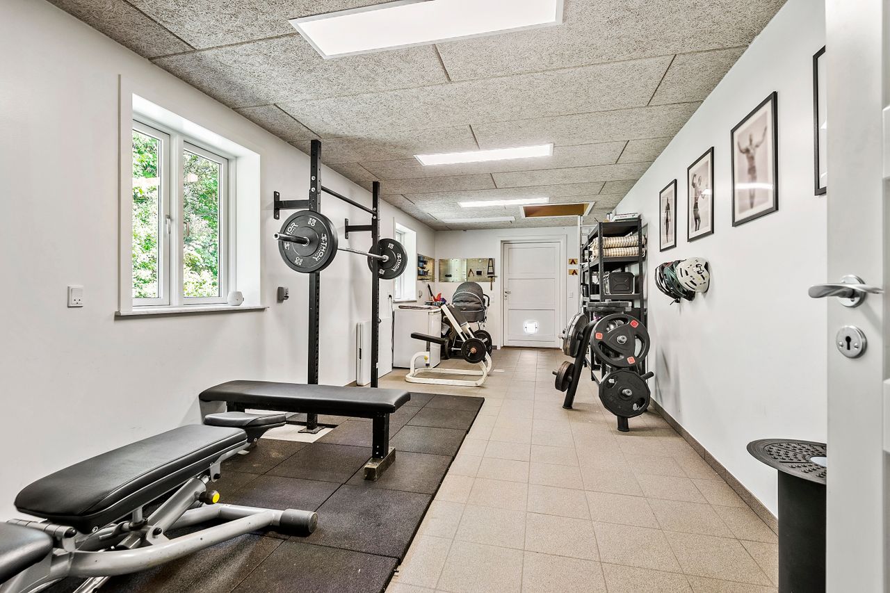 Stort bryggers med adgang til et ekstra disponible rum – i dag indrettet som træningsrum