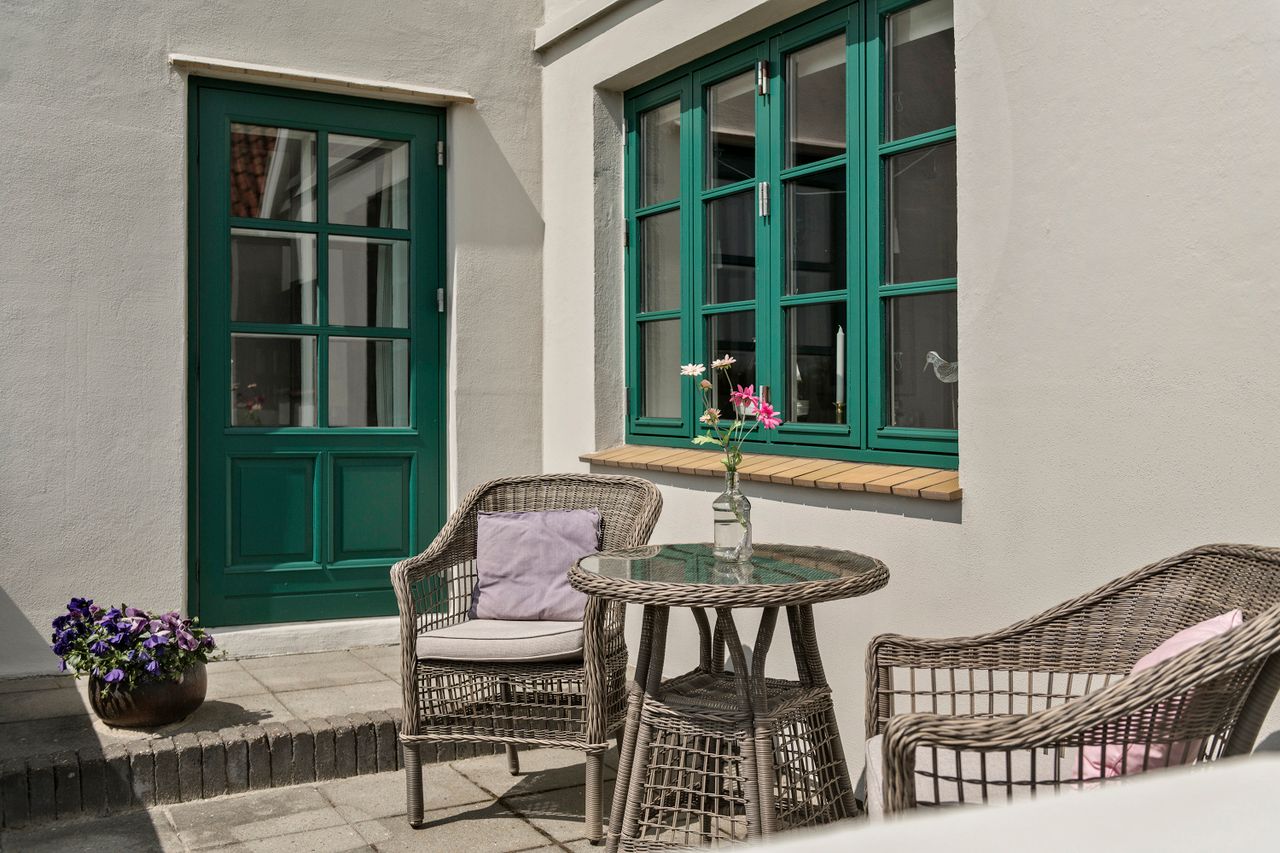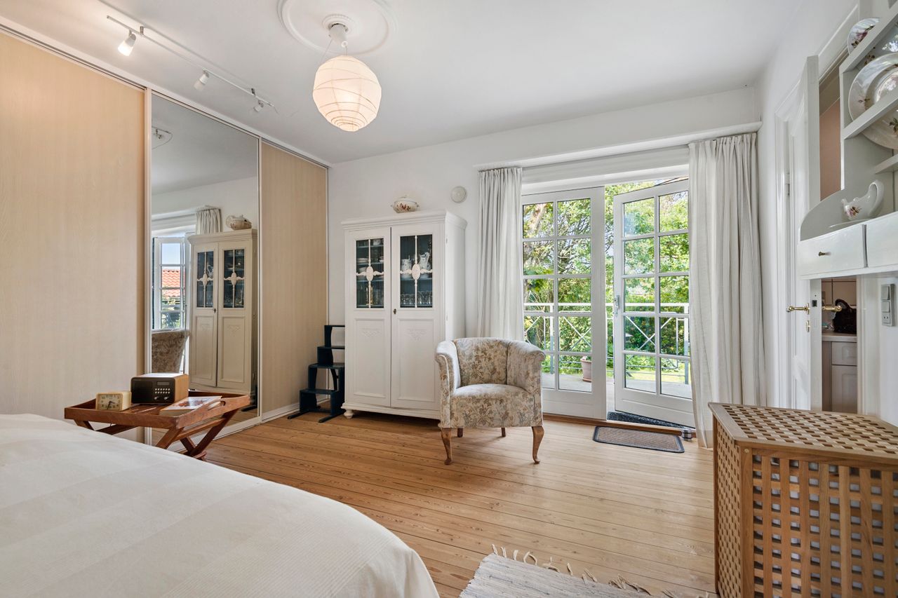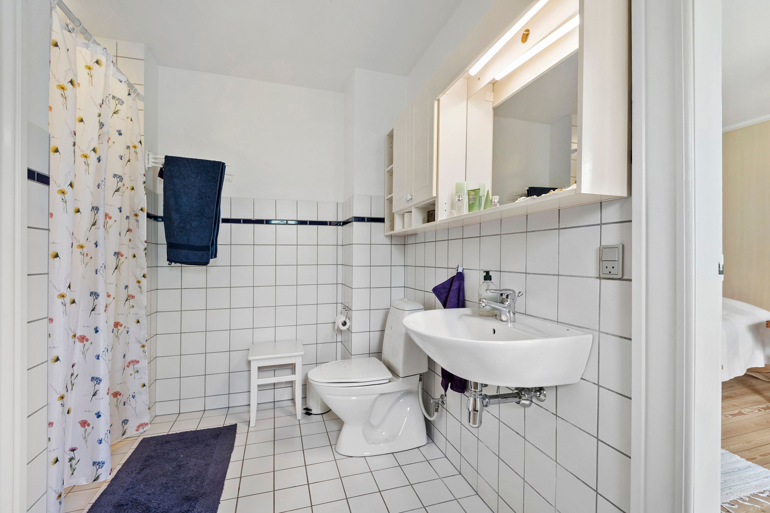 I stueplan finder du desuden et rummeligt soveværelse med skabsvæg og udgang til en privat terrasse mod haven. Herfra er der direkte adgang til et lyst og moderne badeværelse, som skaber en oplagt forældreafdeling med både komfort og privatliv.