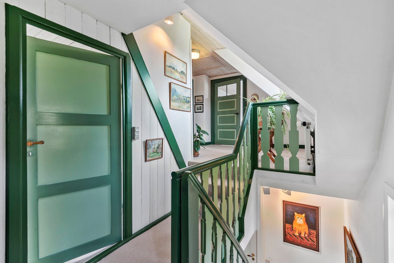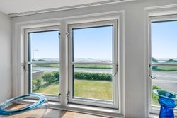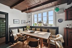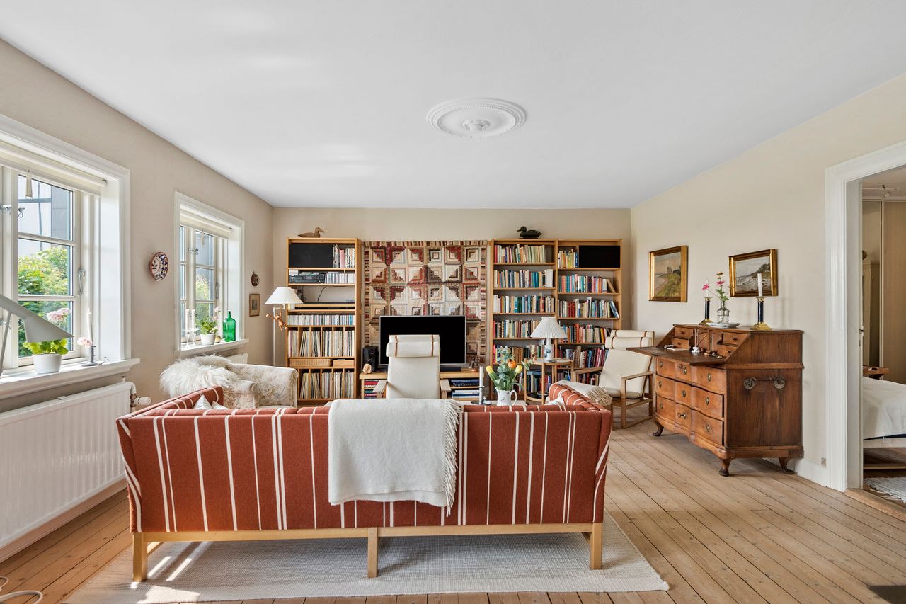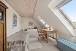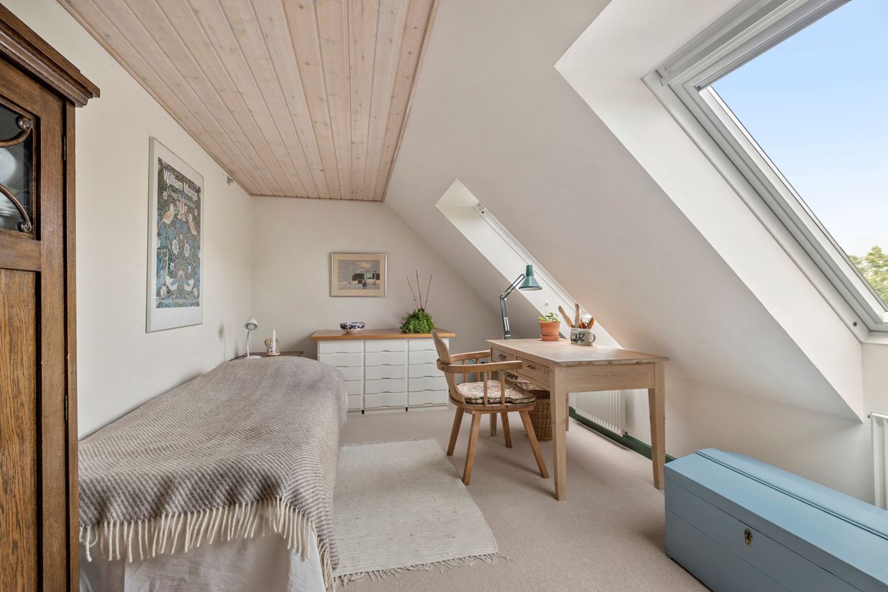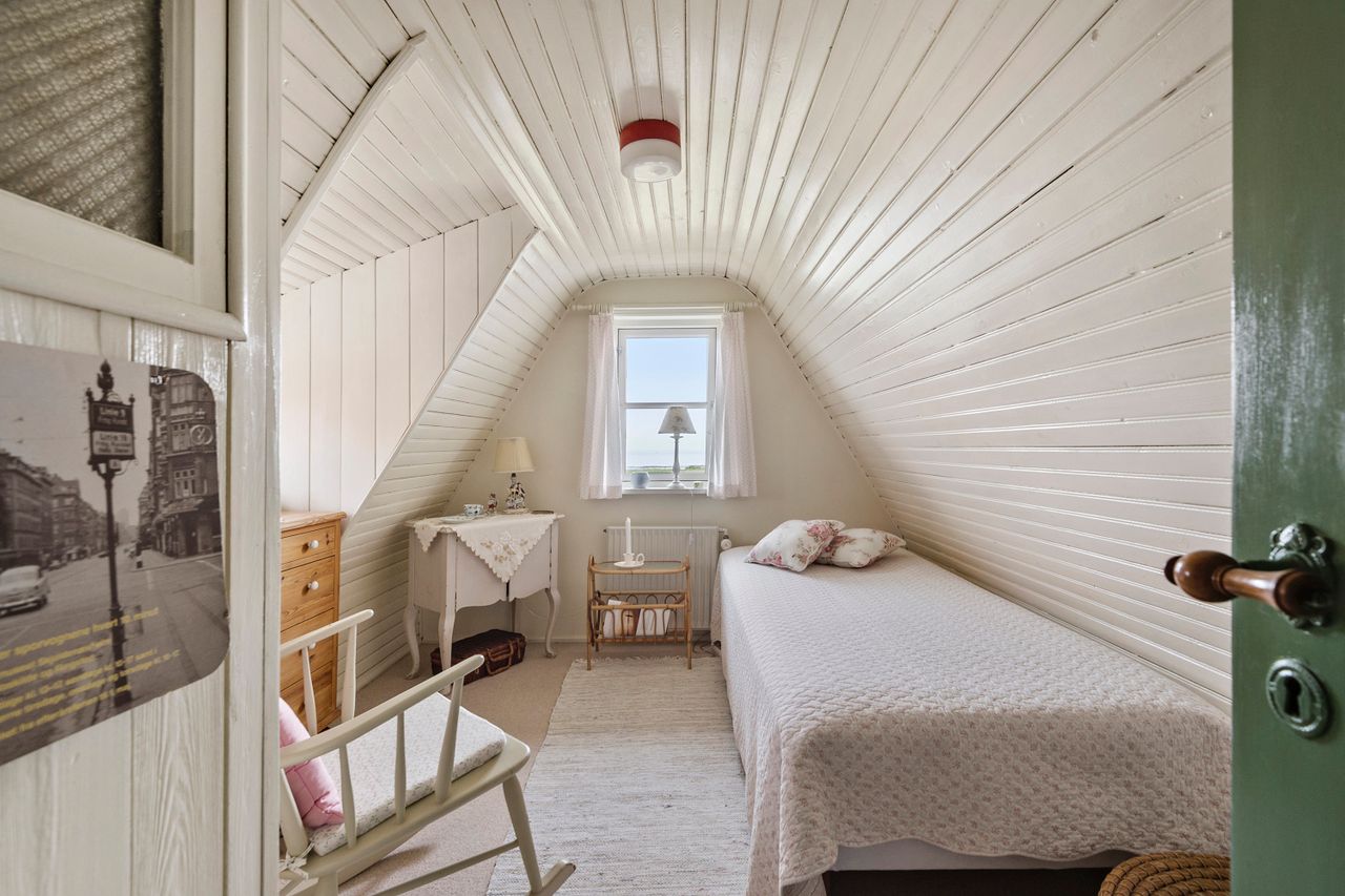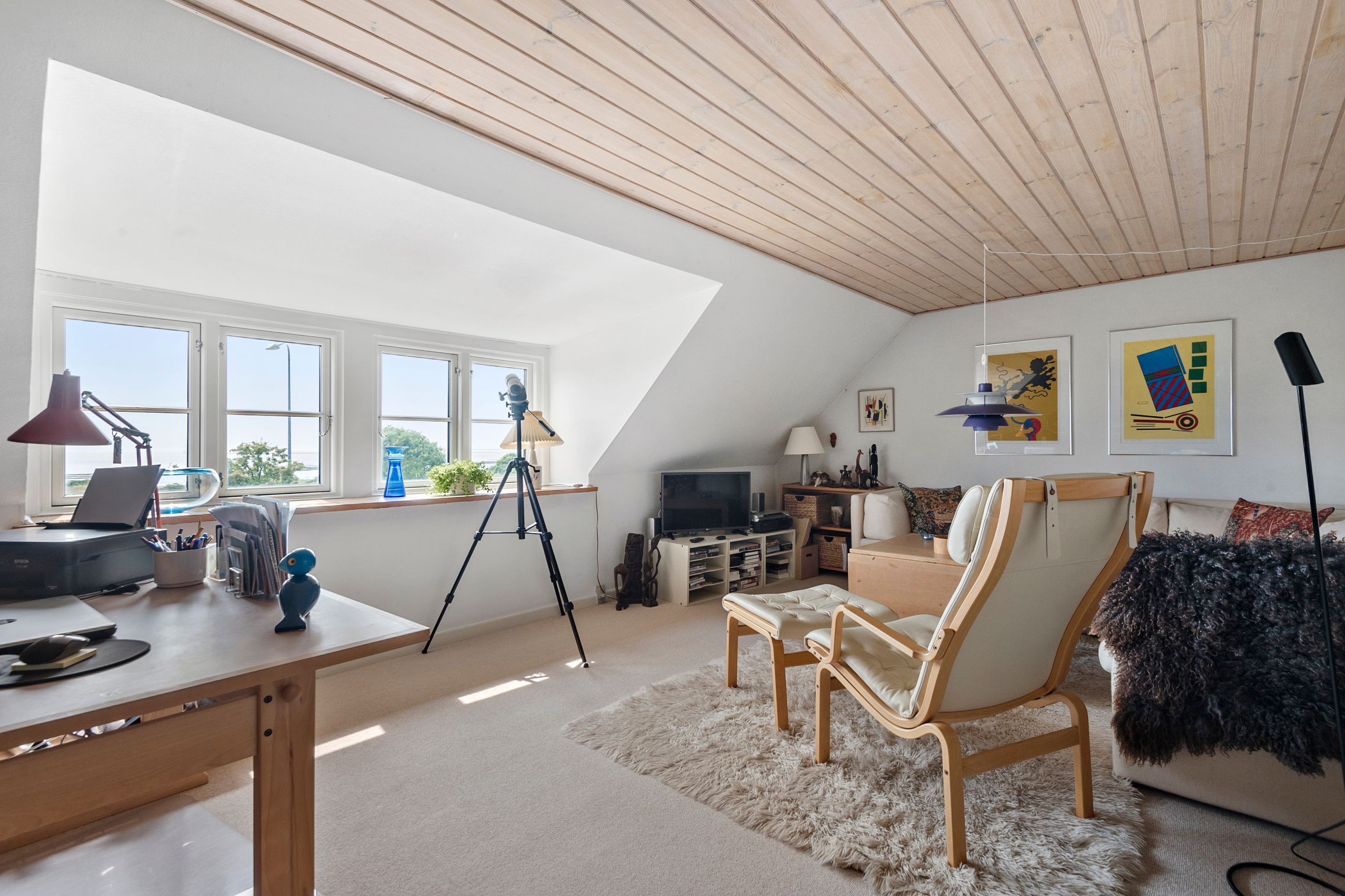 På førstesalen venter flere spændende muligheder. Et hyggeligt værelse egner sig perfekt som kontor eller gæsteværelse, mens et større værelse med Velux-vinduer giver en skøn og luftig atmosfære. Et tredje og endnu større værelse – eller ekstra stue – byder på en sjældent set, ugeneret udsigt over havet og kystlandskabet, der nærmest fungerer som et levende maleri i hjemmet.