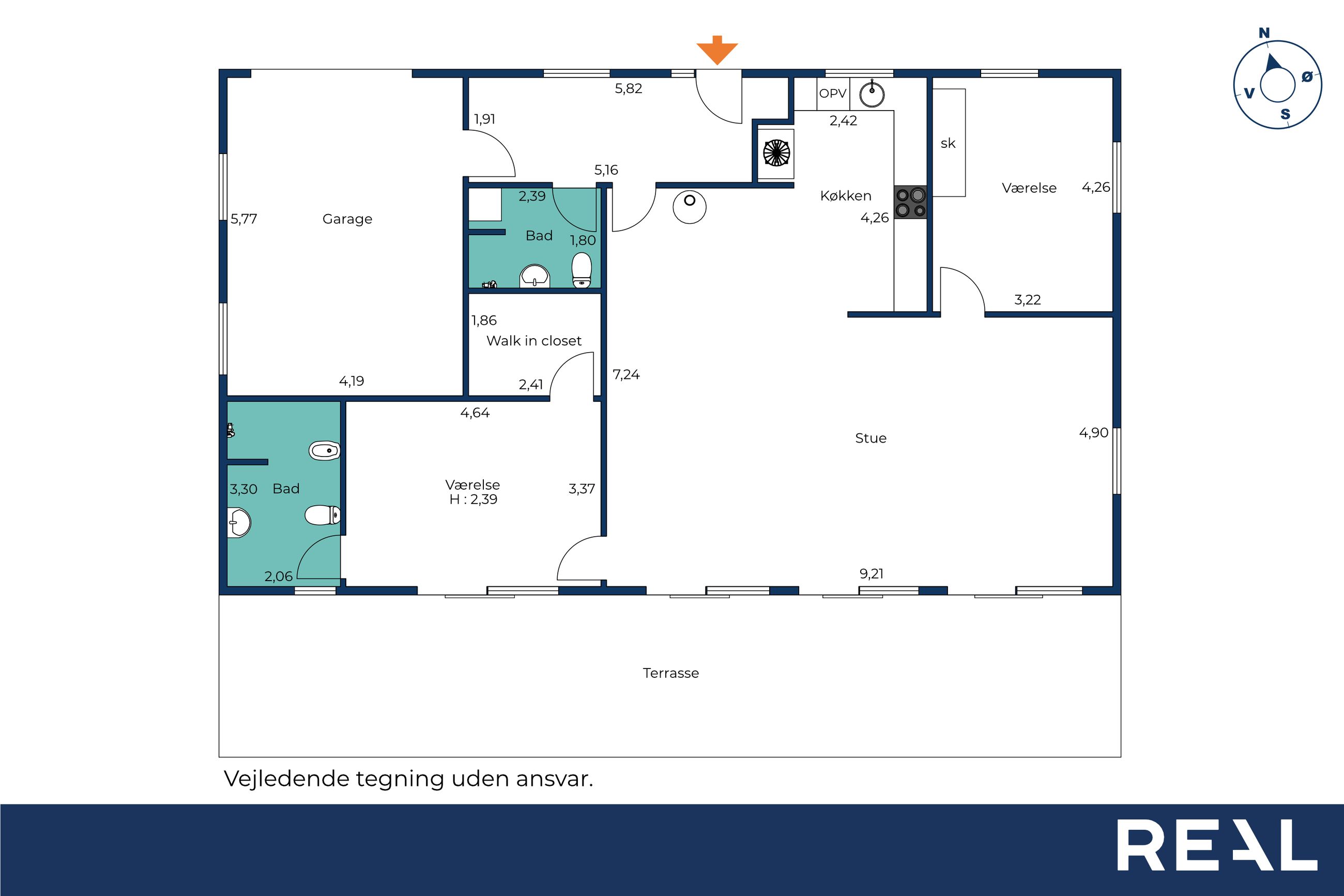 Til boligen hører en stor garage med el port og direkte adgang til boligen – ideelt til både opbevaring og praktisk hverdag.