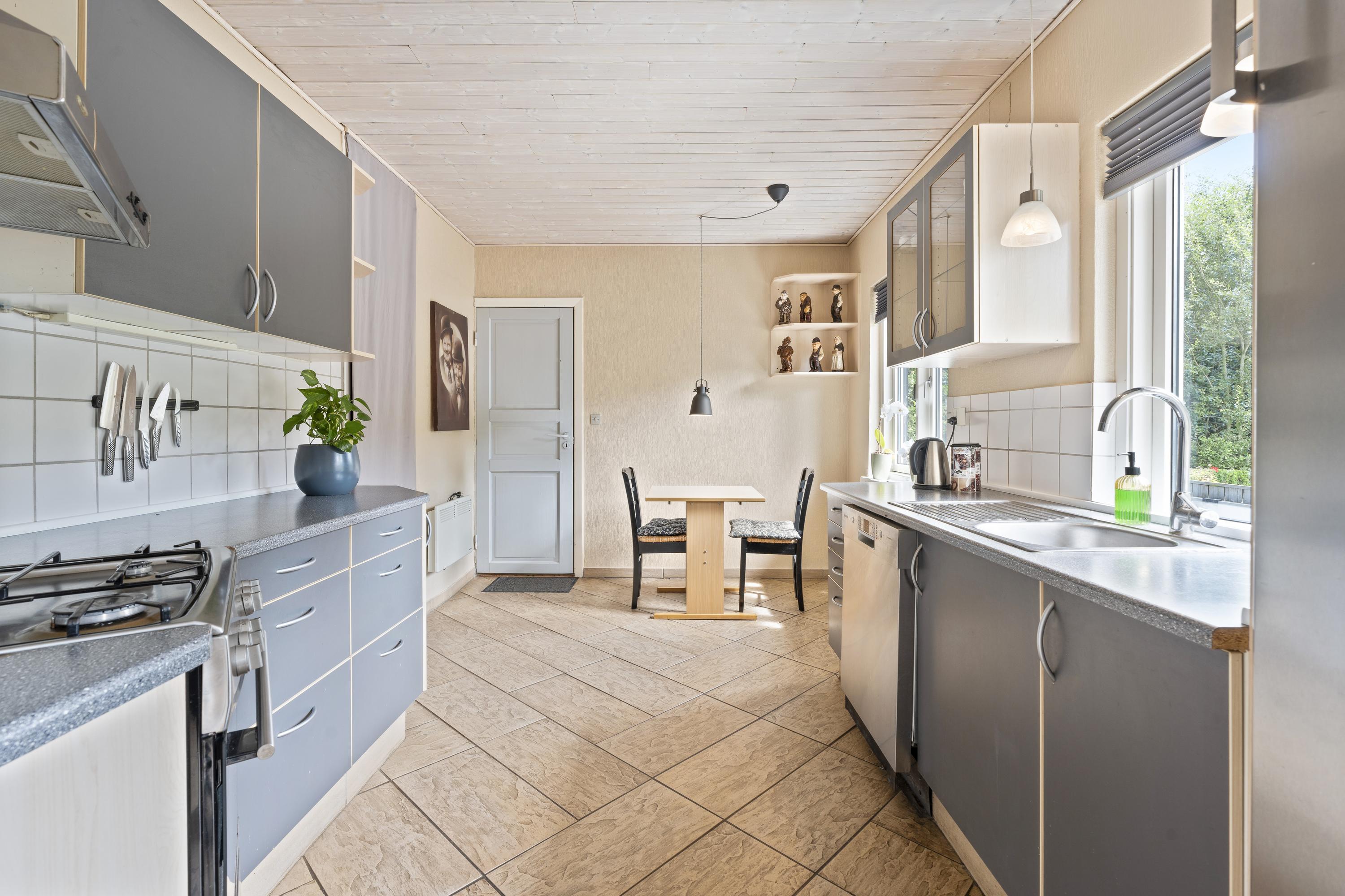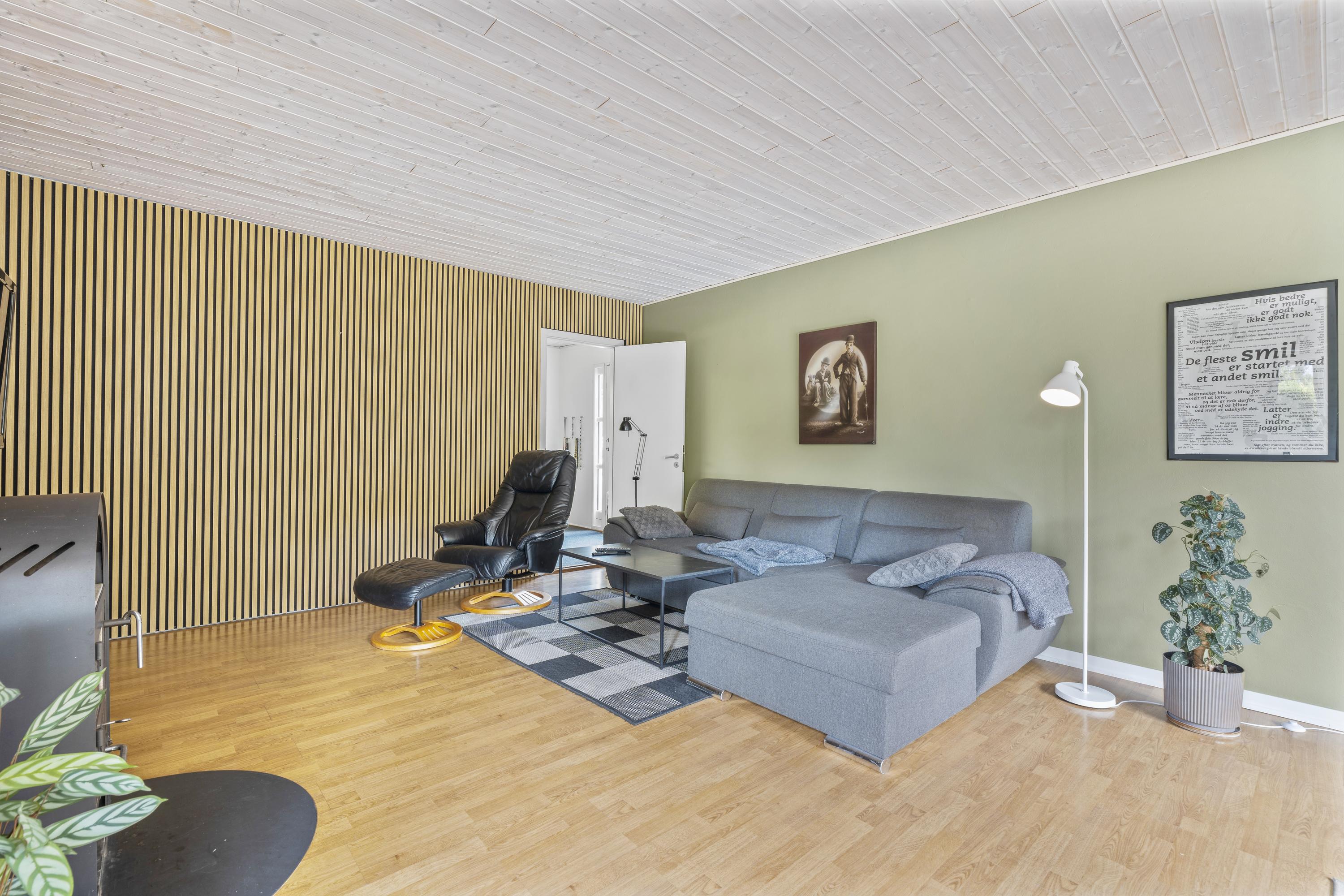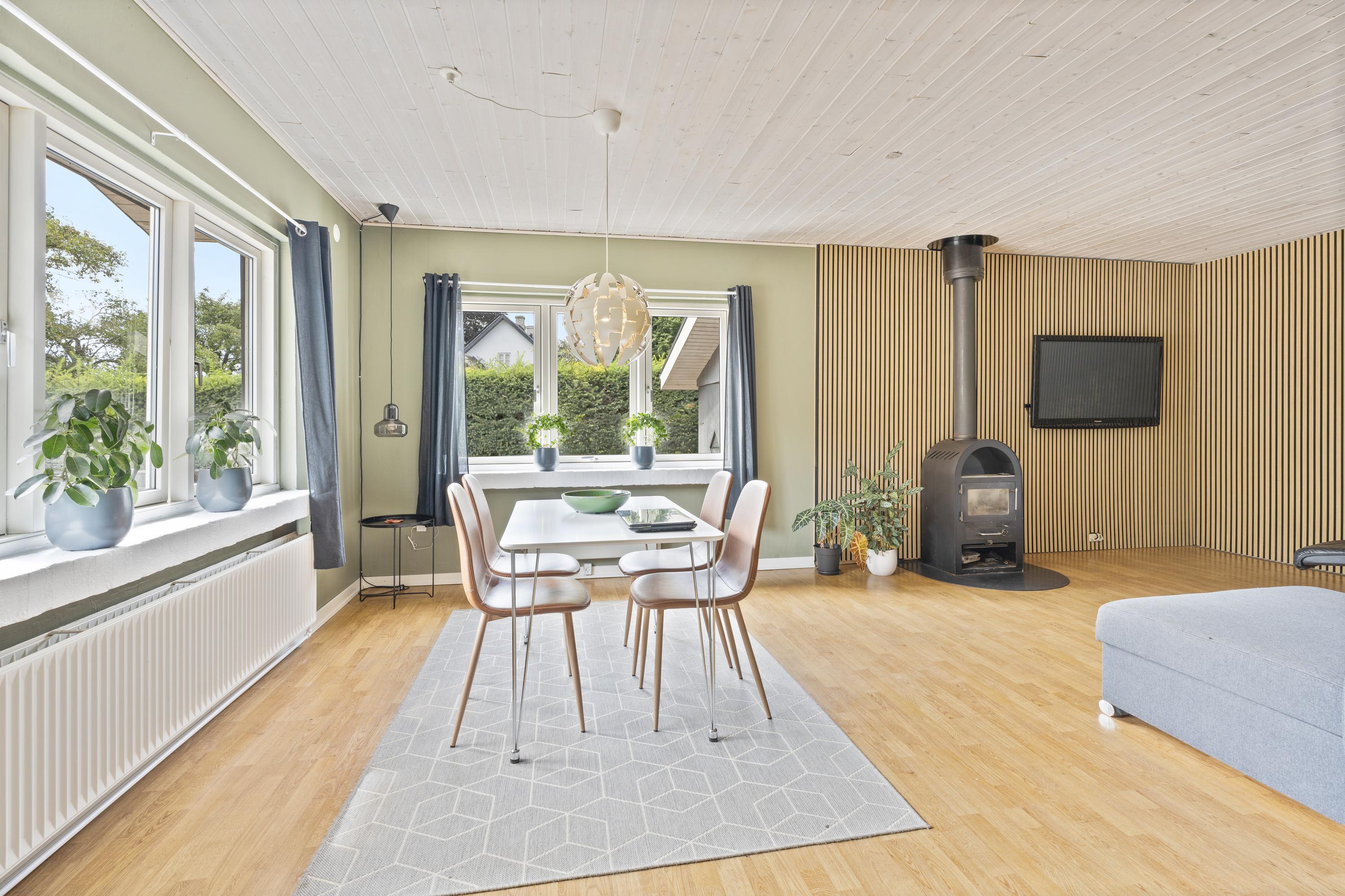 Villaen rummer 105 m2 fordelt på 3 værelser, et badeværelse, et lyst køkken med god plads til madlavning og en hyggelig stue, hvor brændeovnen spreder varme og stemning. Planløsningen er