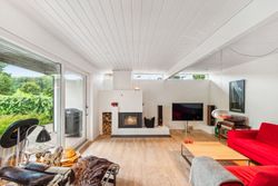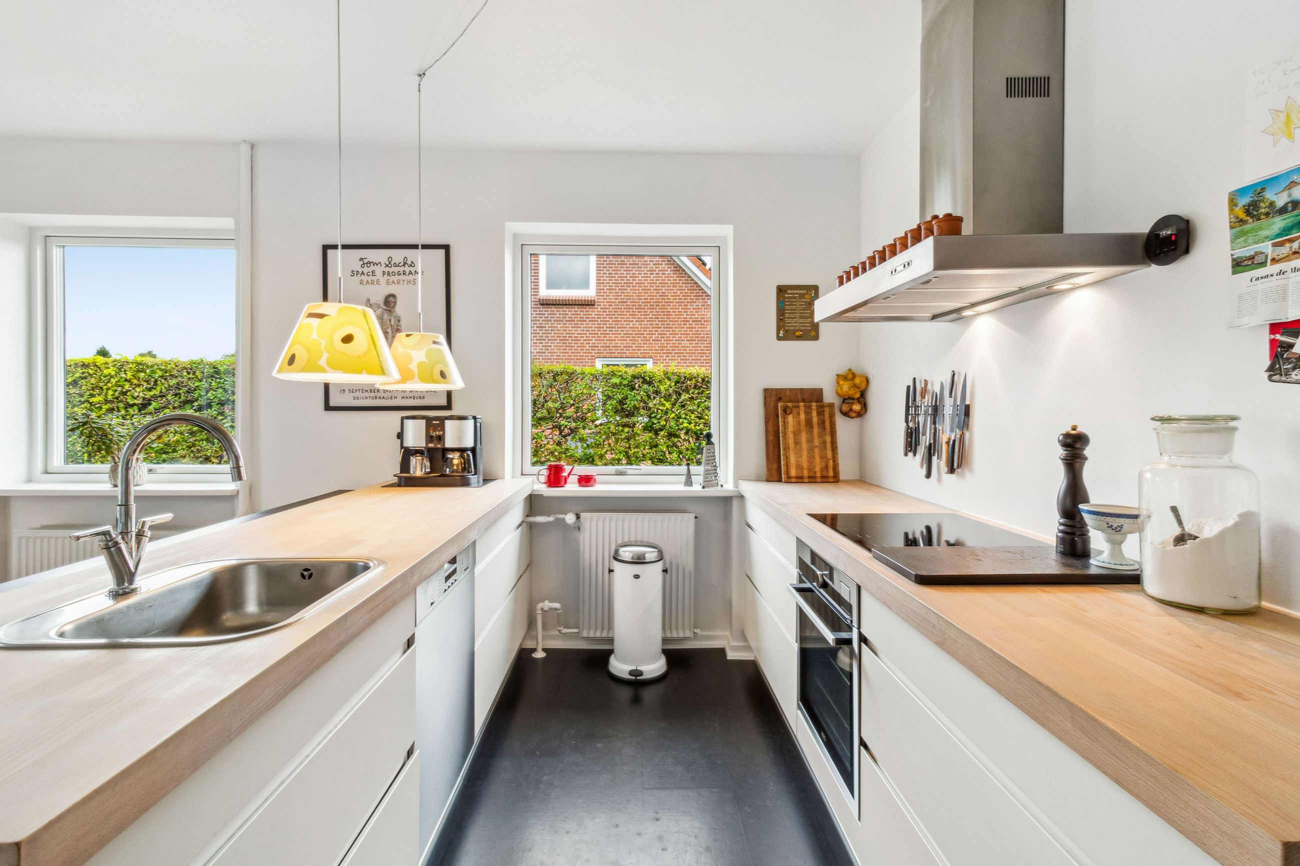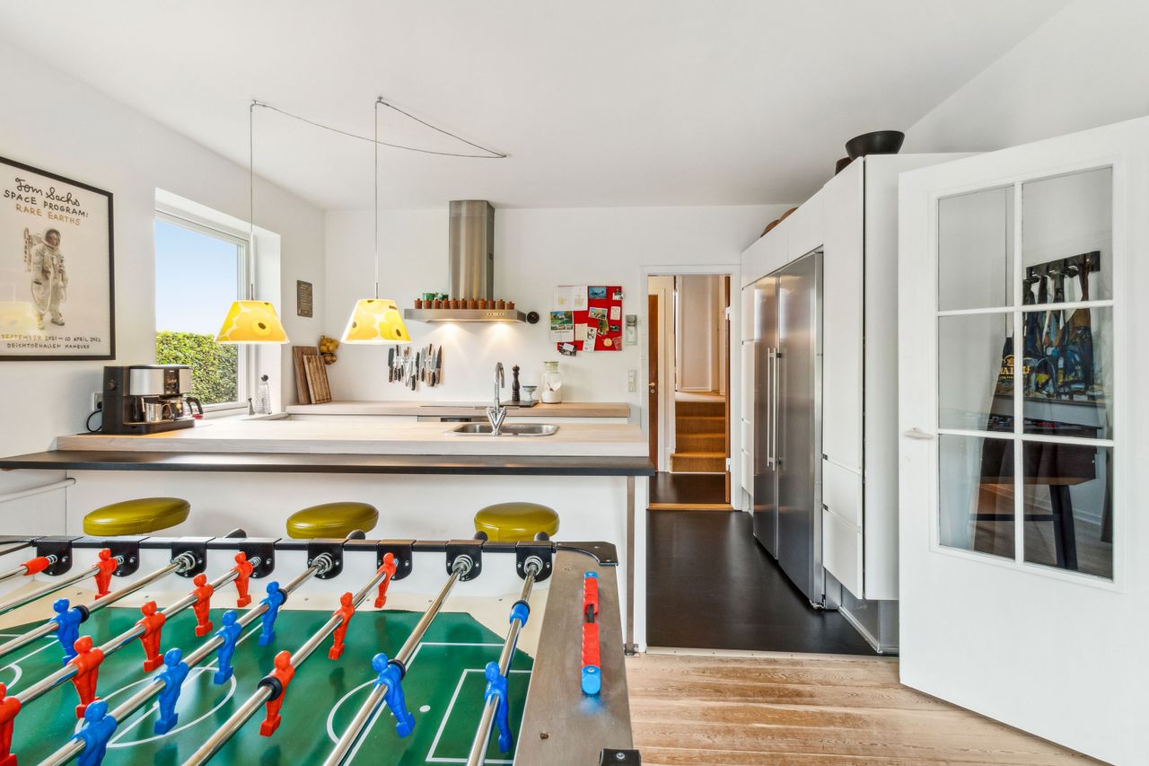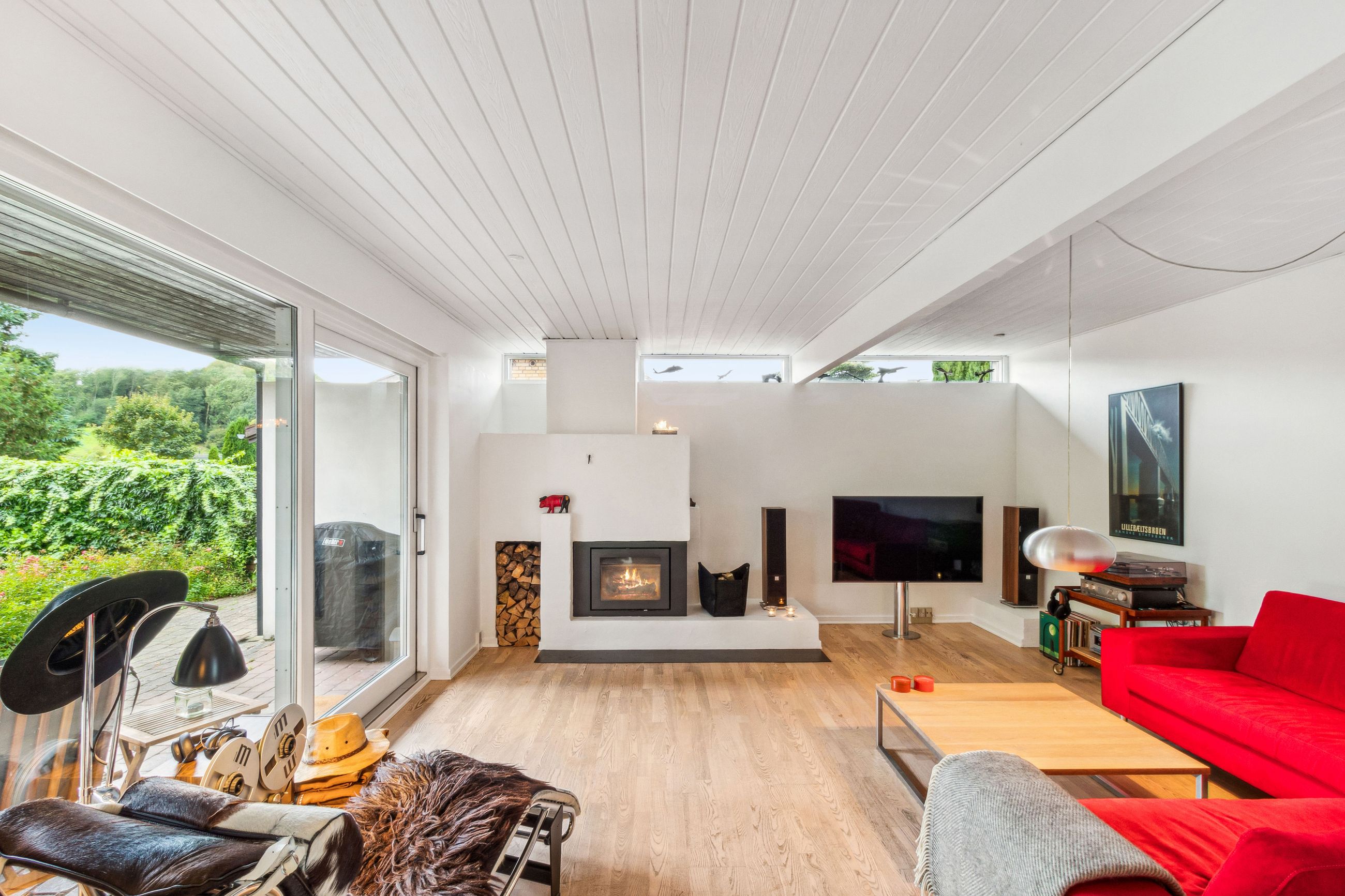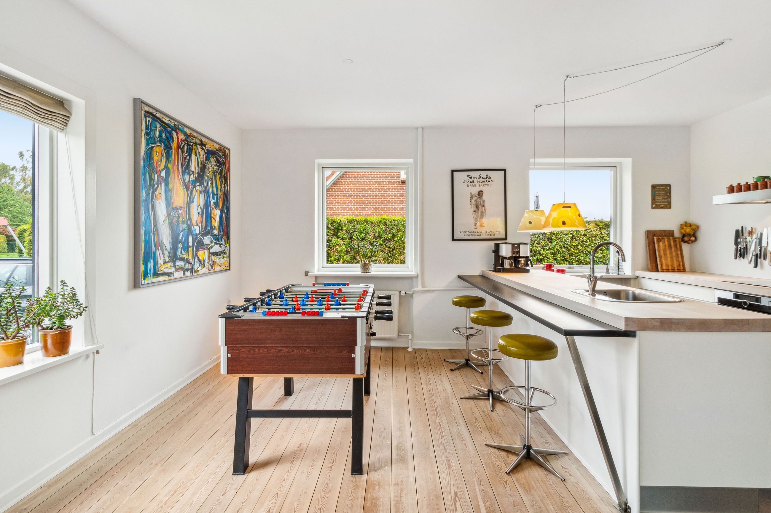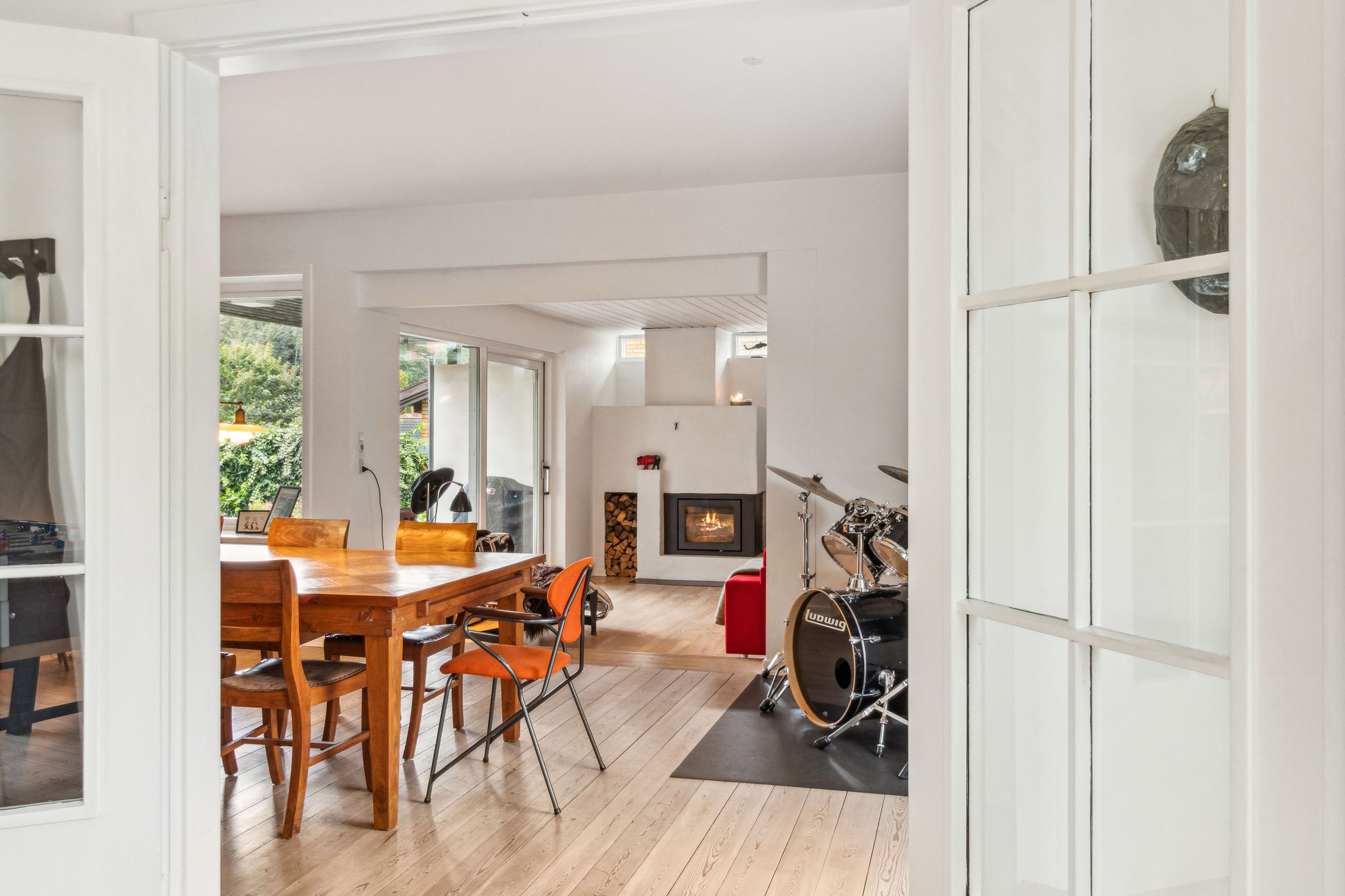 Fra den indbydende entré træder man ind i et lyst og rummeligt køkken-alrum, hvor der er god plads til både madlavning og samvær. Køkkenet er stilrent og velindrettet med masser af skabsplads og bordplads. I det lille disponible rum, der bliver brugt som viktualierum, får man plads til ekstra opbevaring. Dobbeltdøre åbner op til spisestuen, hvor et stort spisebord kan samle familie og venner til hyggelige middage. Herfra ledes man videre ned i den charmerende stue med pejs, der skaber en varm og indbydende atmosfære. Store vinduespartier sørger for et skønt lysindfald, og fra stuen er der direkte udgang til en skøn overdækket terrasse, hvor man kan nyde en uforstyrret udsigt over de naturskønne omgivelser.