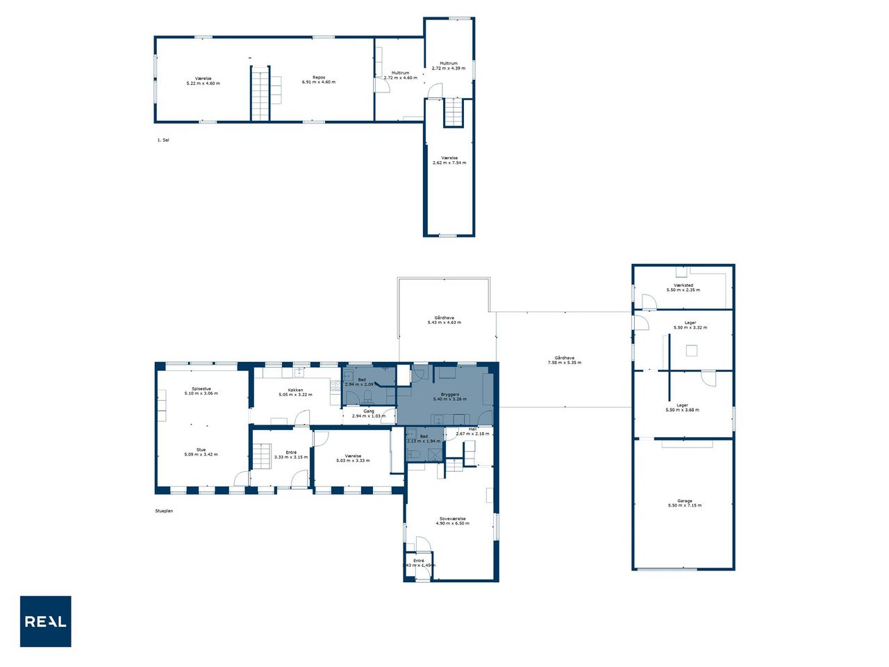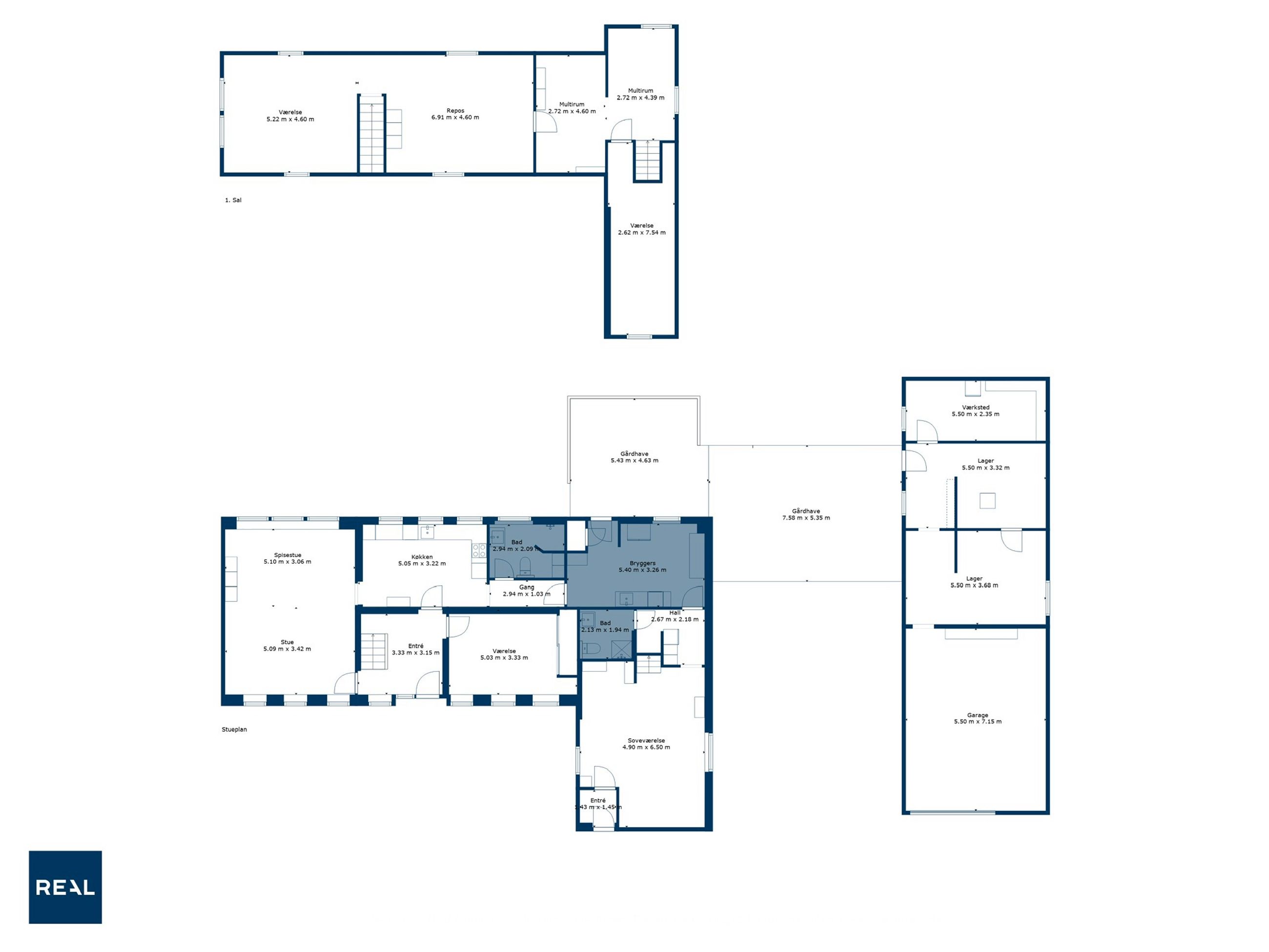 Førstesalen er ideel til børnene eller gæsterne og består af to meget store værelser, et repos og et multirum, der nemt kan tilpasses efter behov. Multirummet giver mulighed for at etablere yderligere værelser, hvis det ønskes, og åbner op for mange anvendelsesmuligheder.
