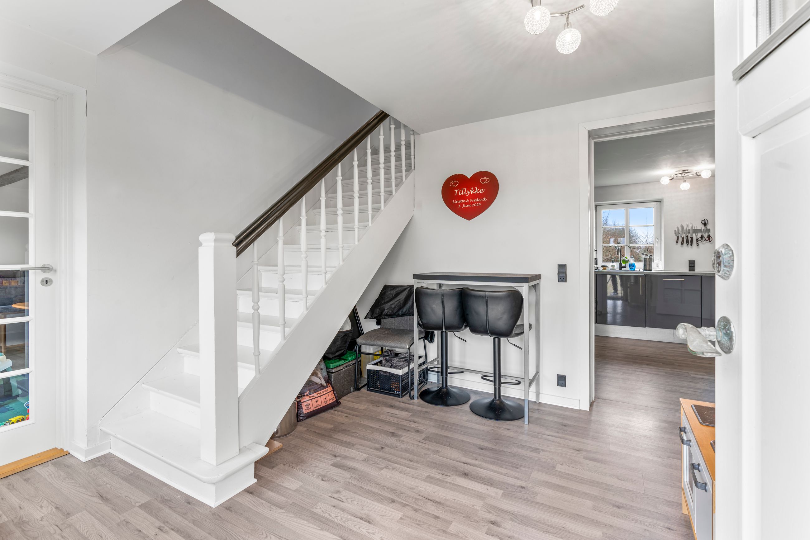Når du træder ind, bydes du velkommen i en lys og rummelig entré, som skaber et indbydende førstehåndsindtryk. Herfra er der direkte adgang til en skøn kombineret stue og spisestue, der imponerer med sin størrelse og lysindfald. Rummet giver mulighed for både et stort spisebord og et hyggeligt sofahjørne, hvor familien kan samles. Køkkenet er velindrettet og rummeligt med masser af skabs- og bordplads, som gør madlavningen til en leg.