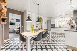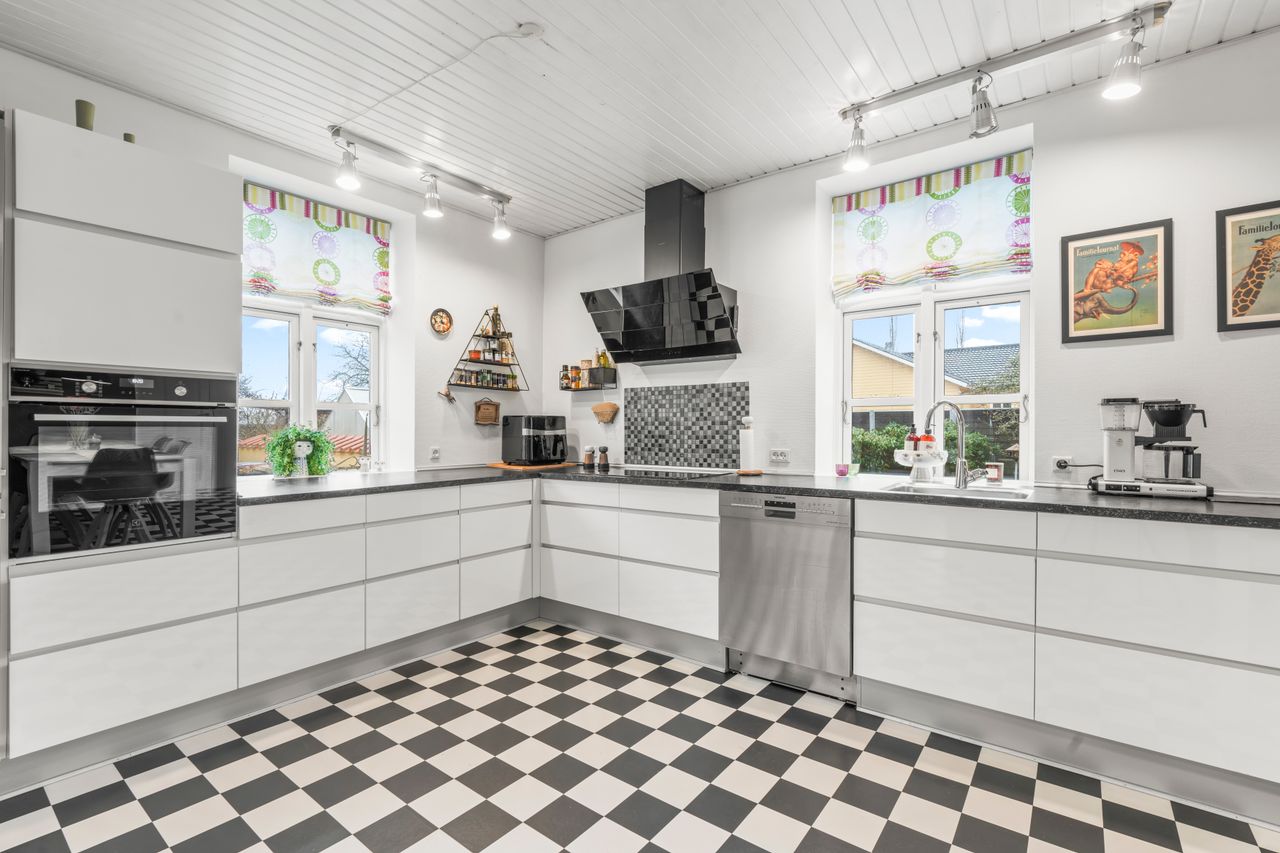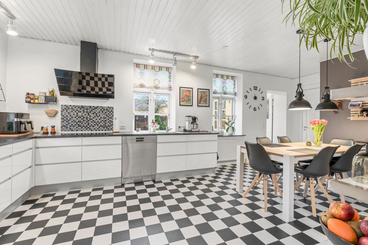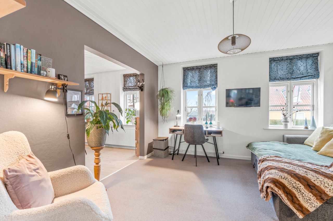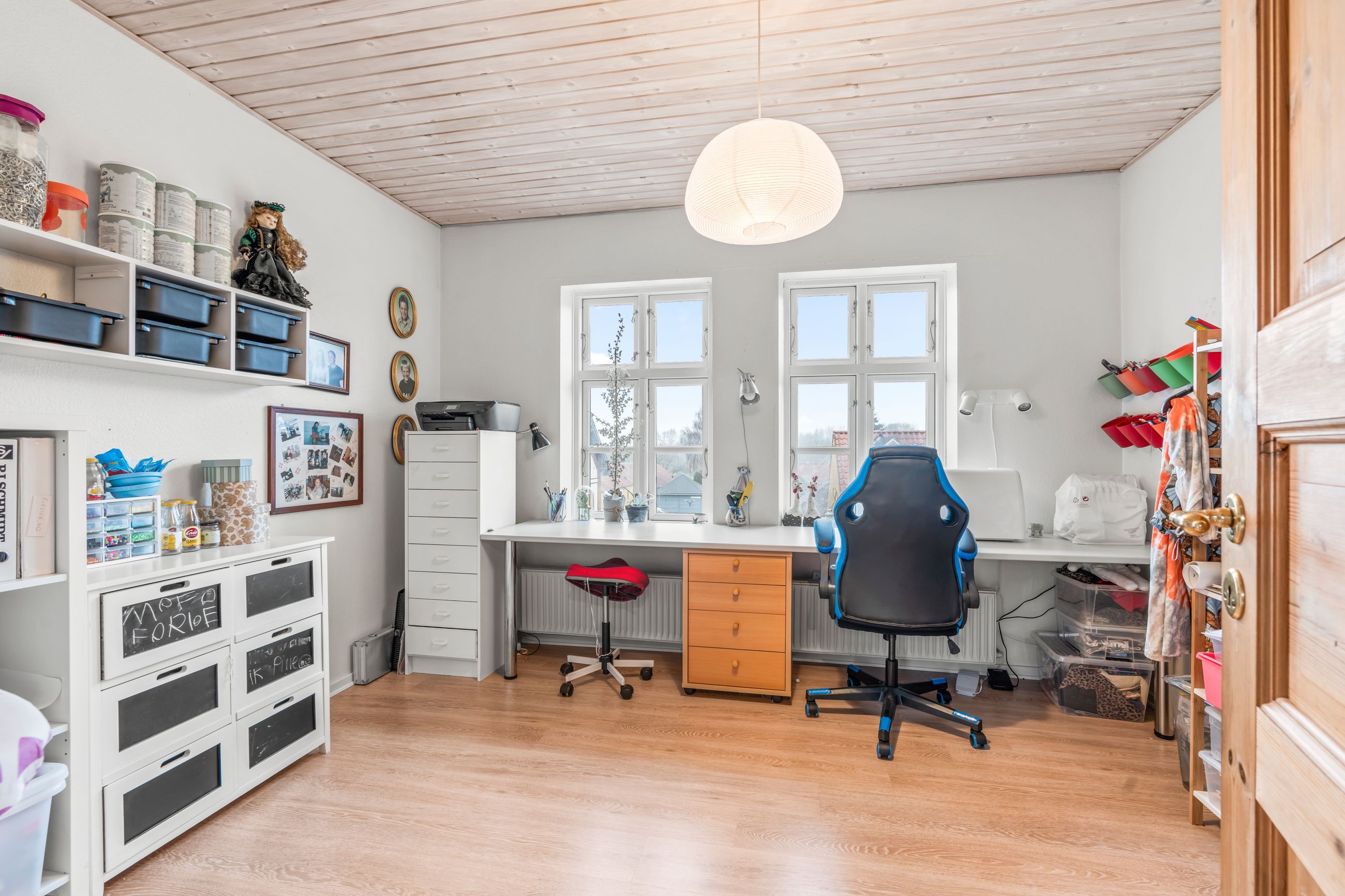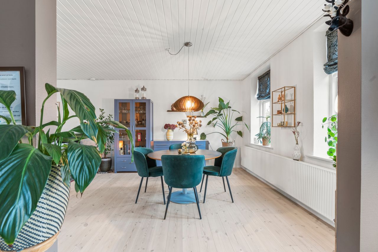 Fra entréen træder man ind i det store og moderne køkken, der fungerer som husets hjerte. Køkkenet er rummeligt og veludstyret med masser af bord- og skabsplads samt en hyggelig spiseplads, perfekt til både hverdagsstunder og sociale sammenkomster. Køkkenet fører videre til en rummelig stue, der også kan bruges som værelse, alt efter behov. Derudover er der to stuer ensuite, der imponerer med deres smukke trægulve og lyse atmosfære. Her er plads til både afslapning og samvær, og fra stuerne er der udgang til den hyggelige have.
