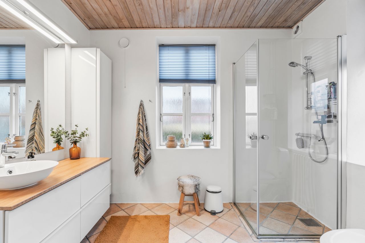 Du bydes velkommen i en flot entré med det smukkeste terrazzo gulv, der både er praktisk og æstetisk. Entréen har god plads til opbevaring og leder direkte videre til husets badeværelse, som er elegant indrettet med gulvvarme og tidløse materialer, der skaber en indbydende stemning.