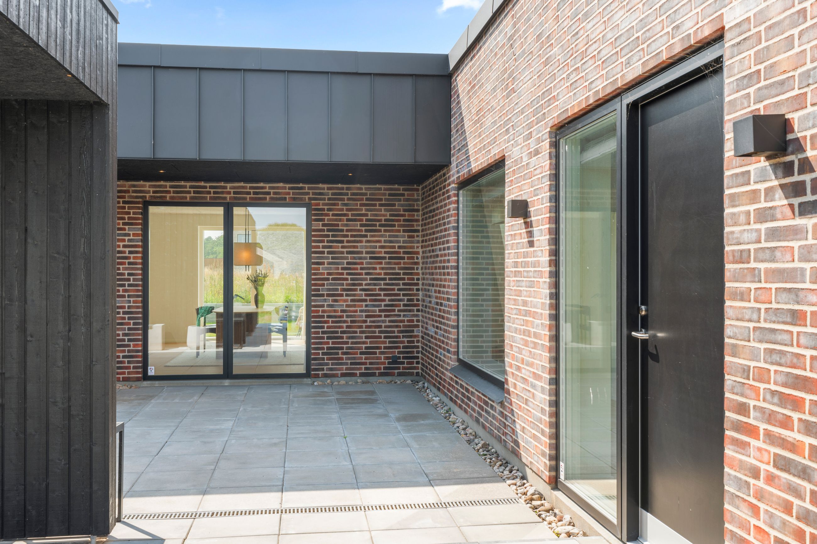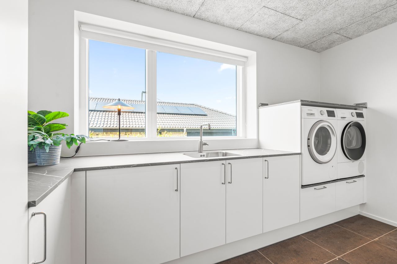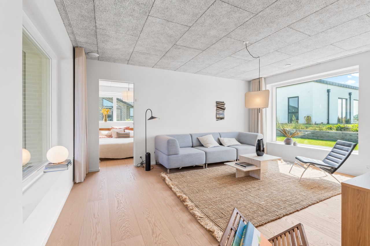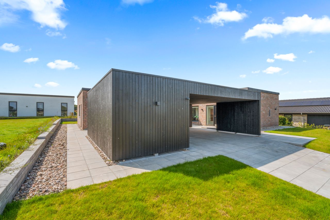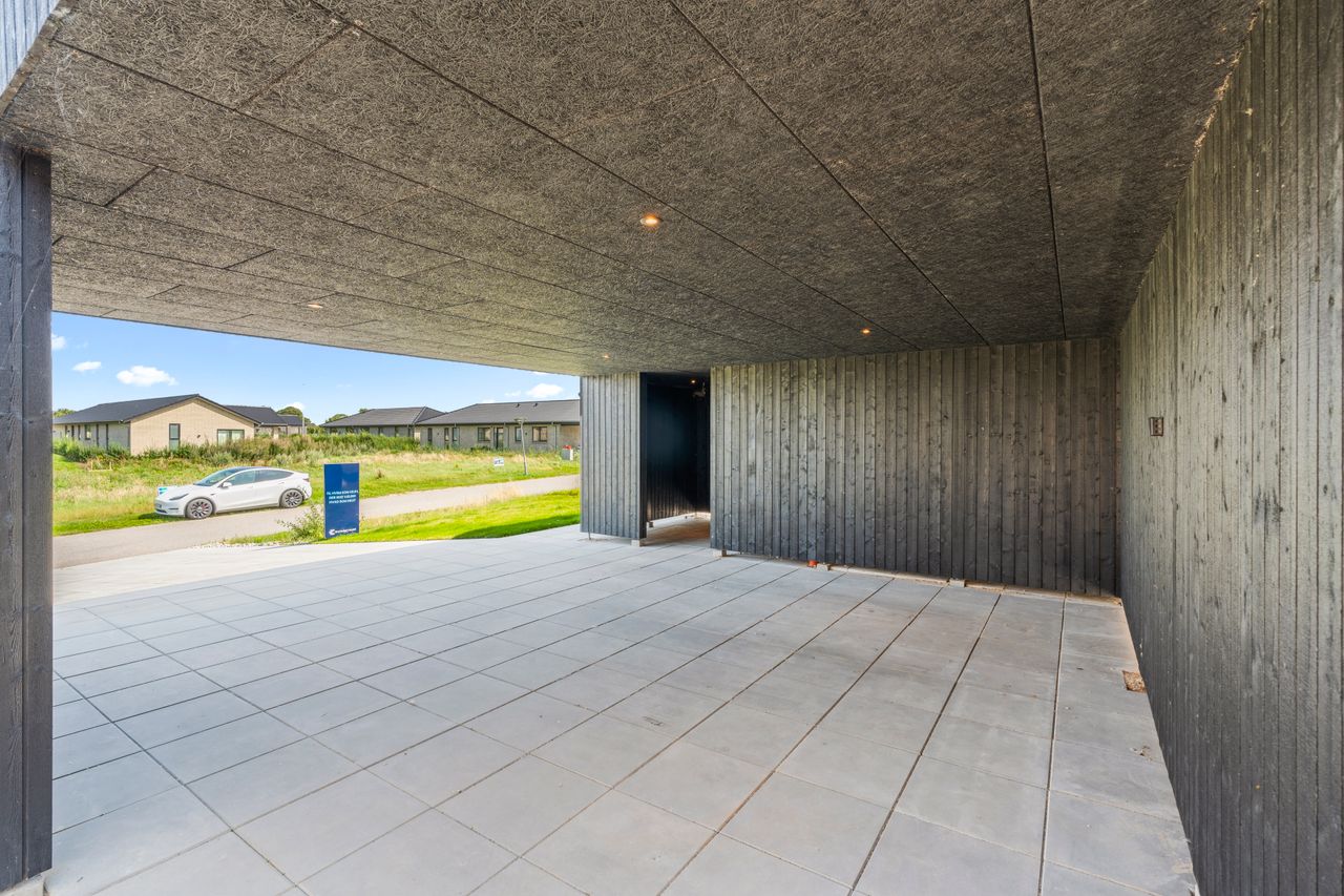 Praktiske løsninger er også tænkt ind: skjult depot og kaffestation i køkkenet, Quooker i rustfri stål, hvidevarer fra Siemens, Danfoss Icon gulvvarmestyring og en energieffektiv luft/vand varmepumpe fra Bosch. Udenfor får du en hyggelig gårdhave, en stor dobbeltcarport med sort træbetonlofter, forberedt ladestander til elbil samt dobbeltdøre fra køkken/alrum, der åbner ud til omgivelserne.