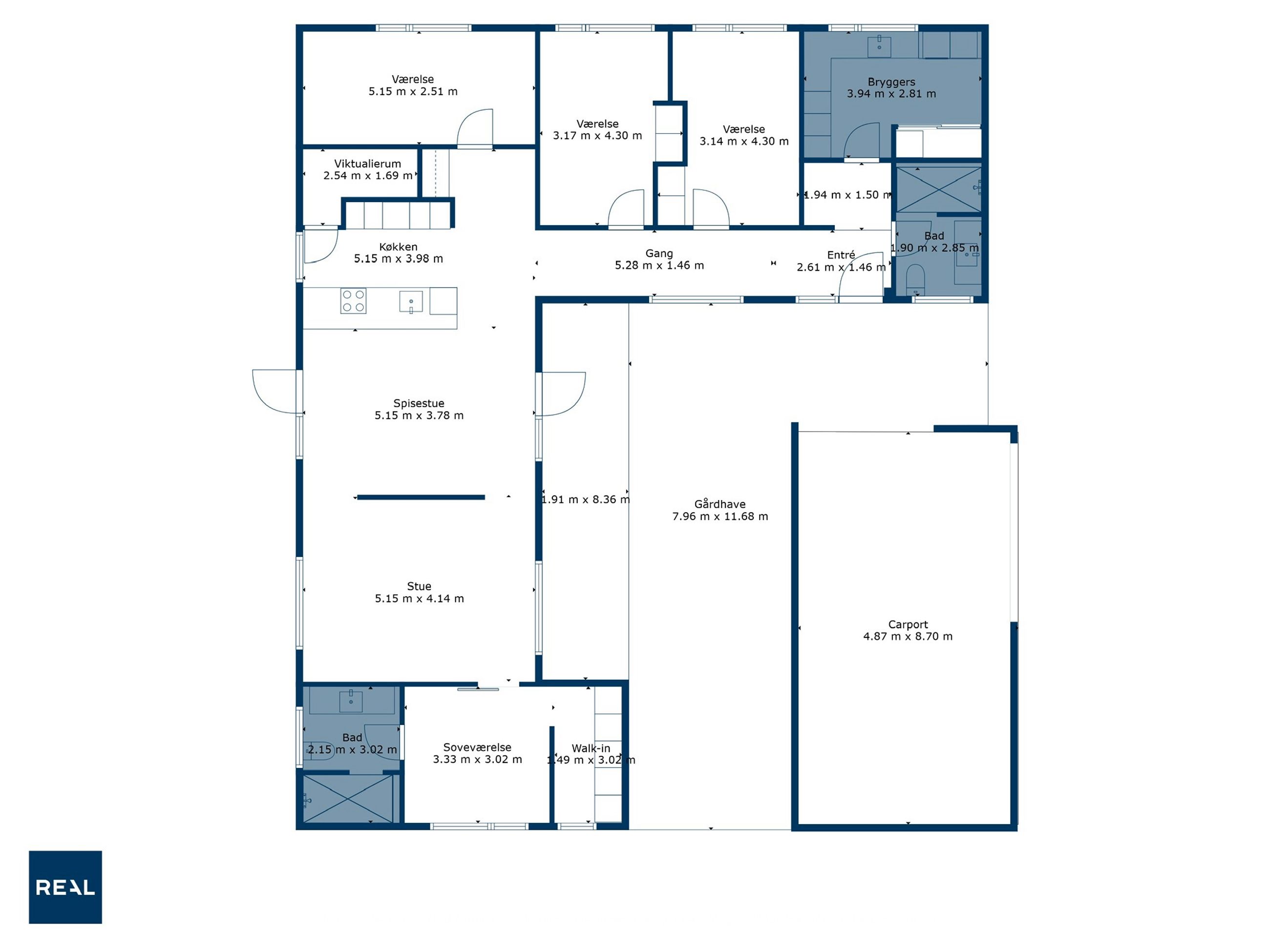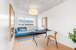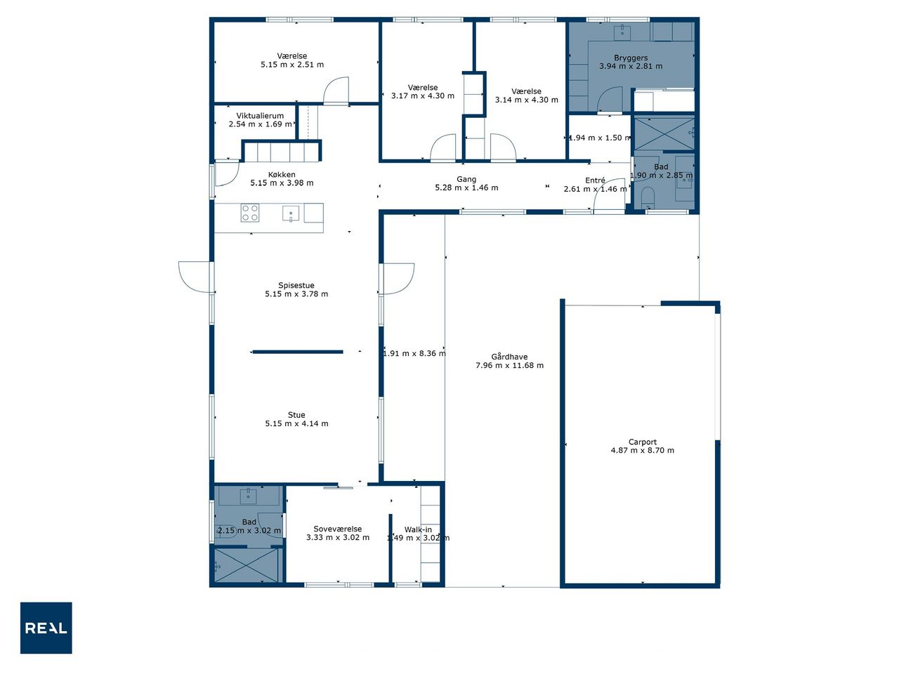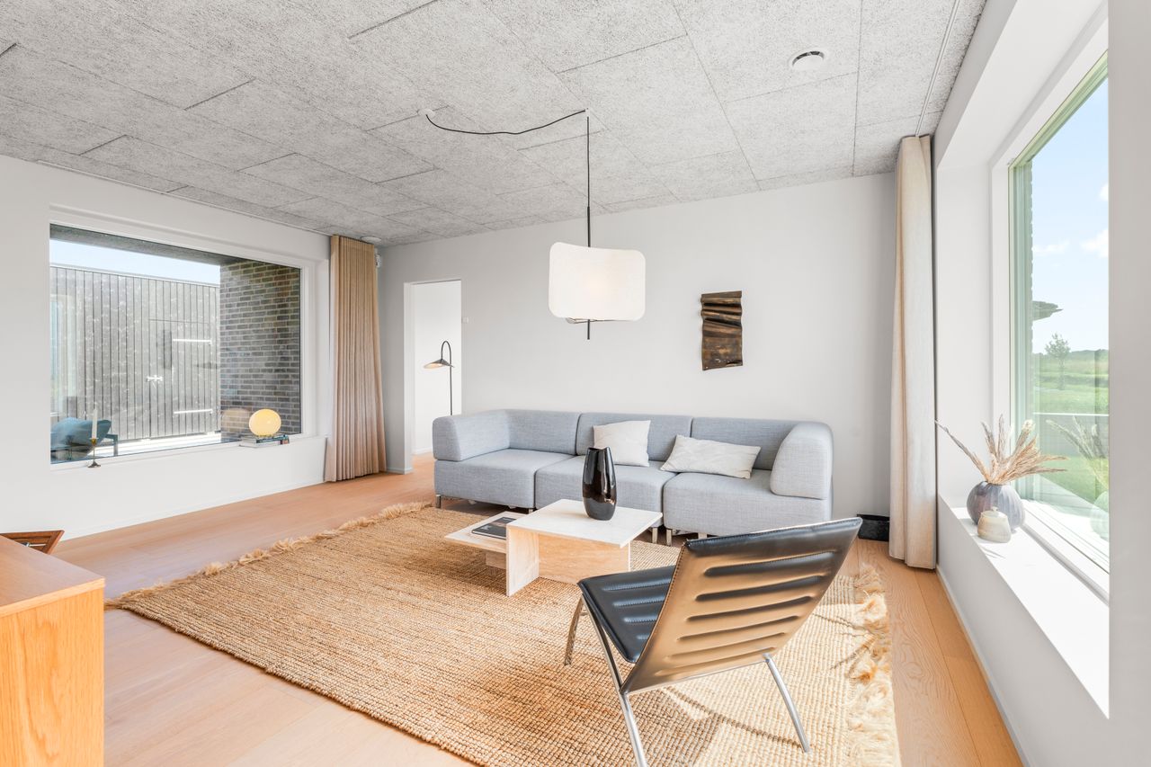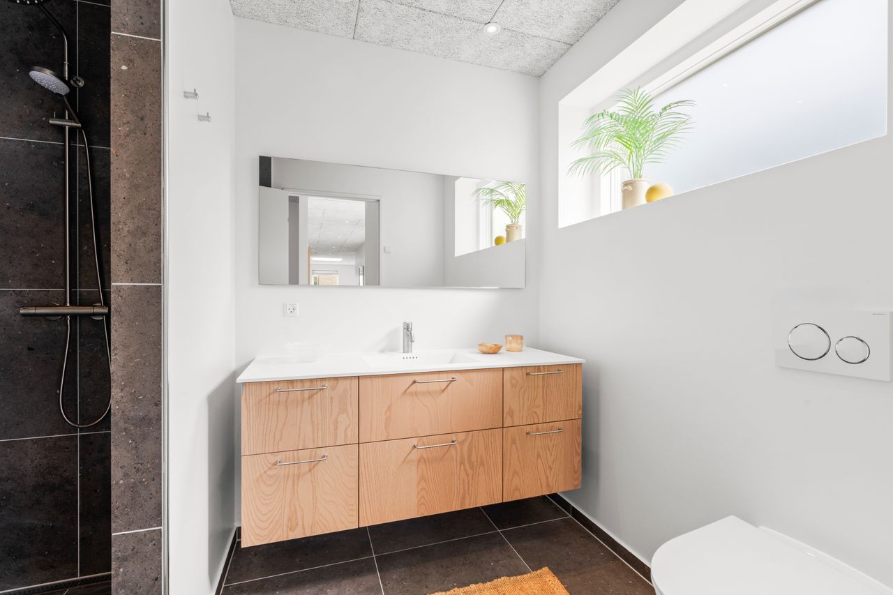 Praktiske løsninger er også tænkt ind: skjult depot og kaffestation i køkkenet, Quooker i rustfri stål, hvidevarer fra Siemens, Danfoss Icon gulvvarmestyring og en energieffektiv luft/vand varmepumpe fra Bosch. Udenfor får du en hyggelig gårdhave, en stor dobbeltcarport med sort træbetonlofter, forberedt ladestander til elbil samt dobbeltdøre fra køkken/alrum, der åbner ud til omgivelserne.