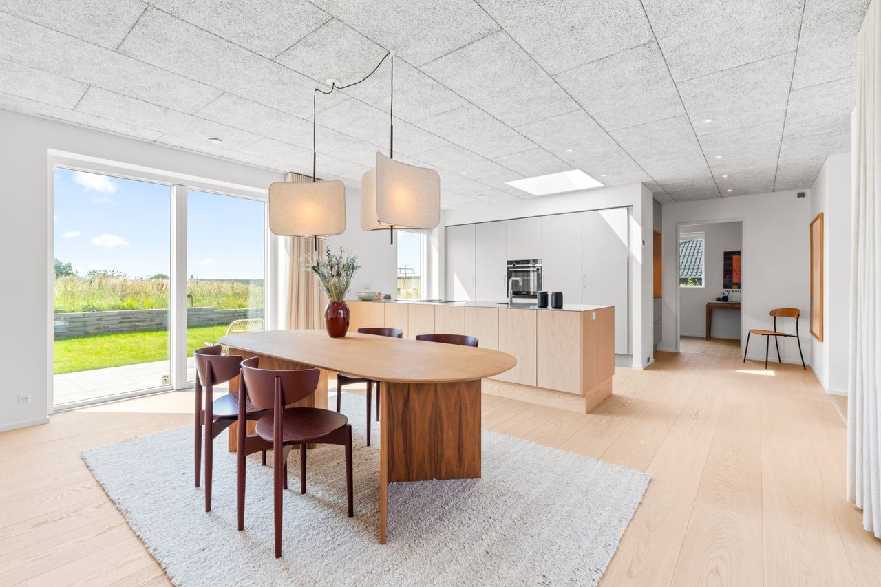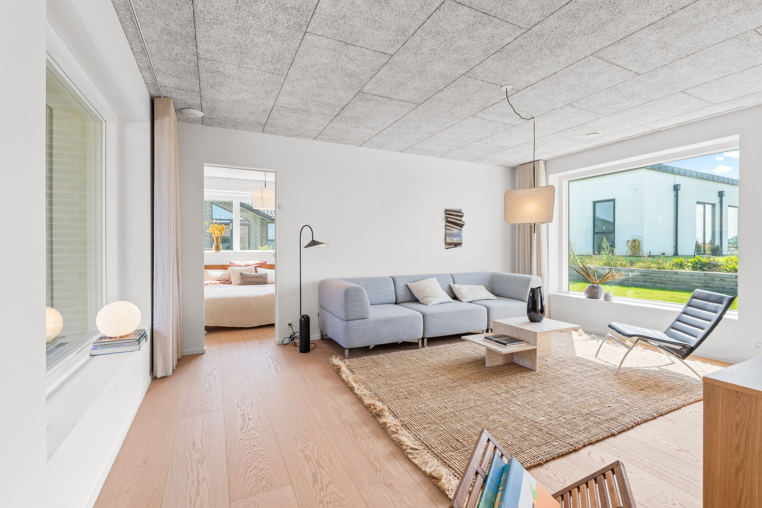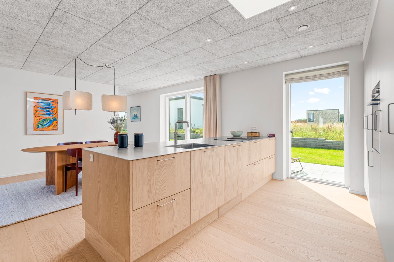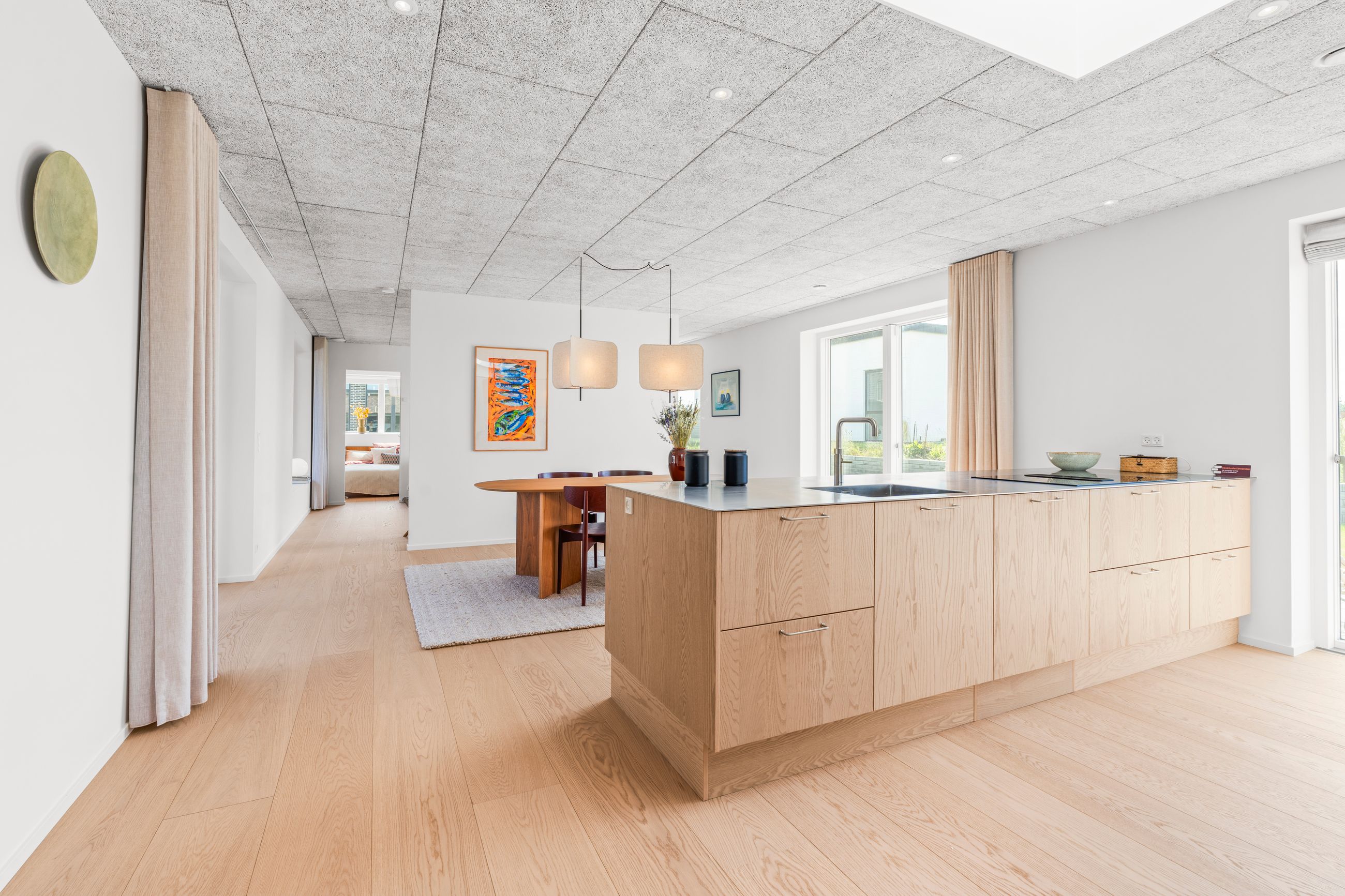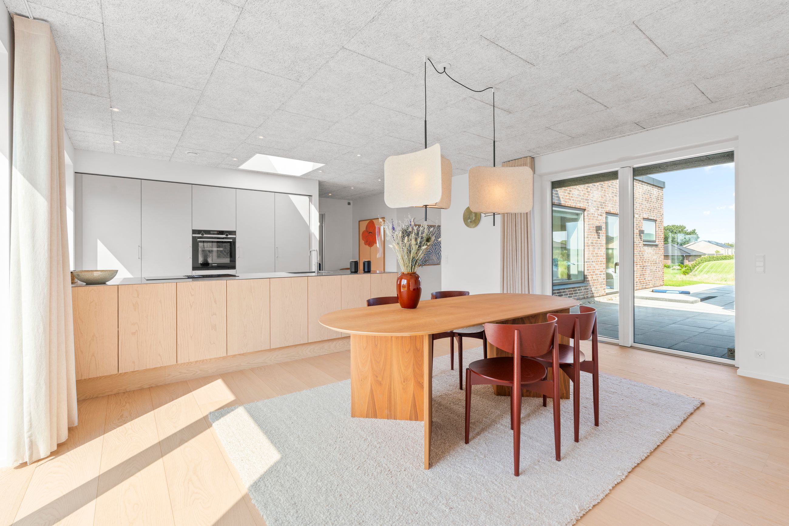 Boligen er opført med fokus på design og velvære. De elegante egetræsgulve tilfører varme og eksklusivitet, mens det gennemførte materialevalg skaber en rød tråd i hele hjemmet. Husets hjerte er det lyse køkken/alrum med smukt inventar i ask og en rå stålbordplade – perfekt til både gastronomiske udfoldelser og hyggelige stunder med familie og venner. En stilfuld væg opdeler køkken og stue, så rummene bevarer både åbenhed og hver sin atmosfære.