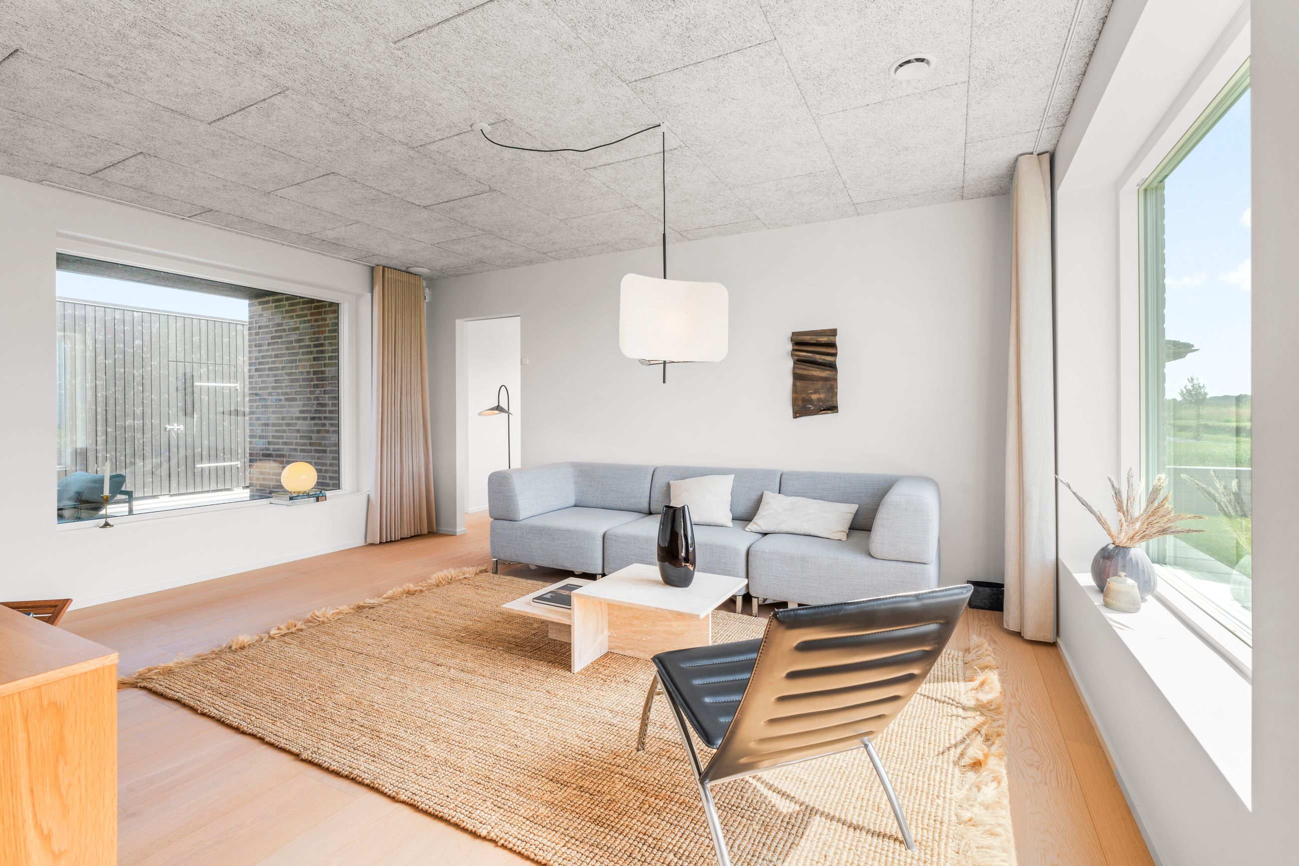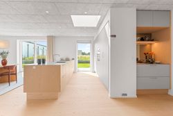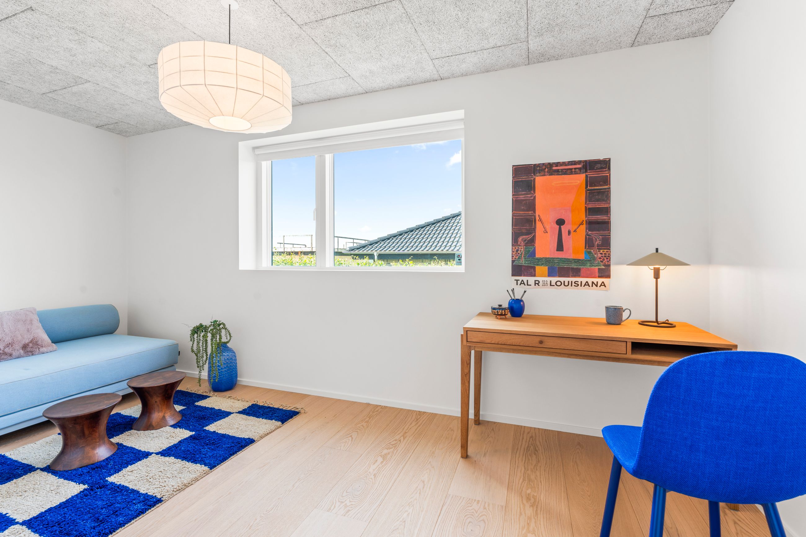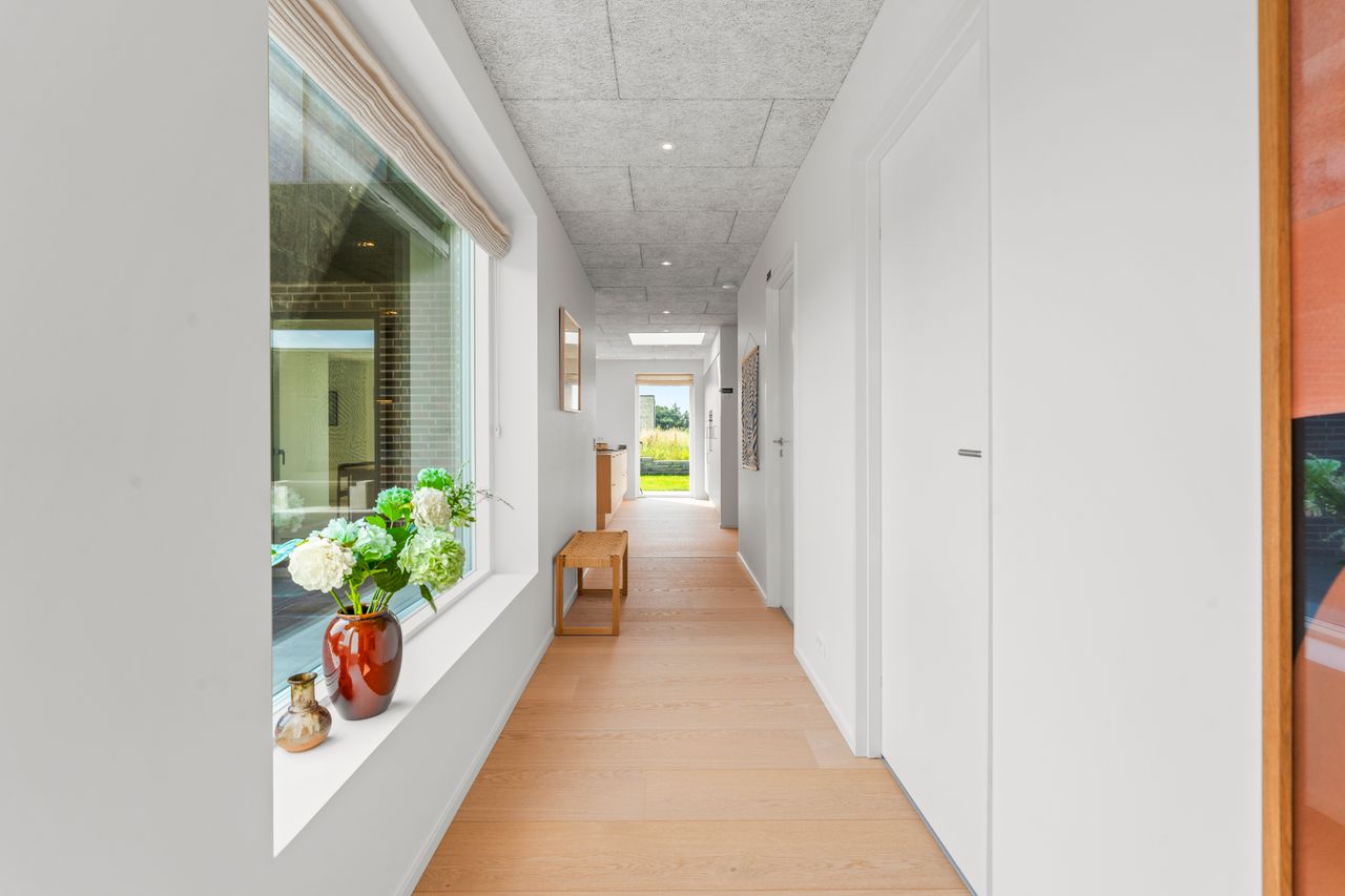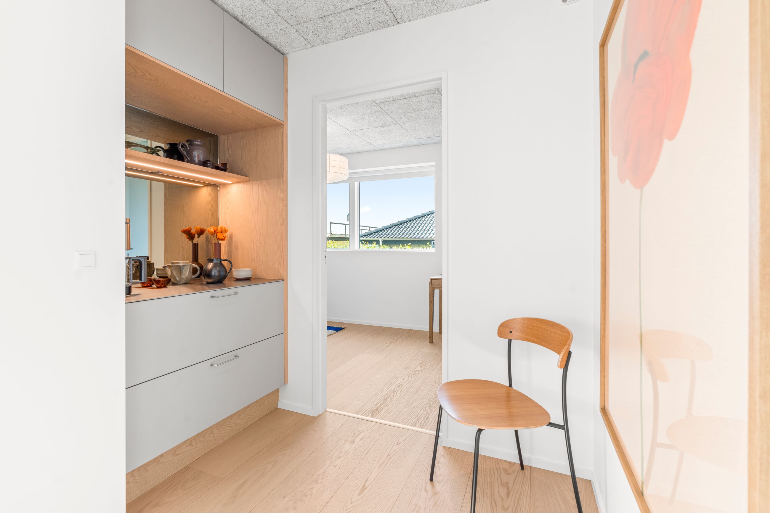 Boligen er opført med fokus på design og velvære. De elegante egetræsgulve tilfører varme og eksklusivitet, mens det gennemførte materialevalg skaber en rød tråd i hele hjemmet. Husets hjerte er det lyse køkken/alrum med smukt inventar i ask og en rå stålbordplade – perfekt til både gastronomiske udfoldelser og hyggelige stunder med familie og venner. En stilfuld væg opdeler køkken og stue, så rummene bevarer både åbenhed og hver sin atmosfære.