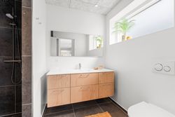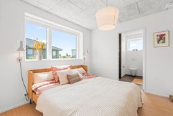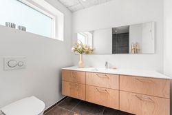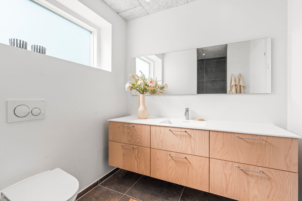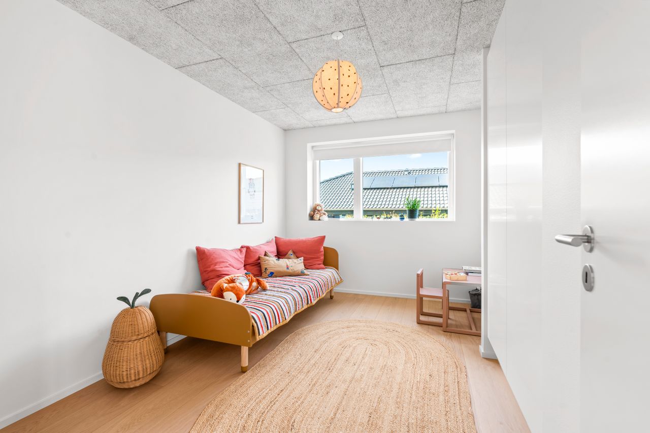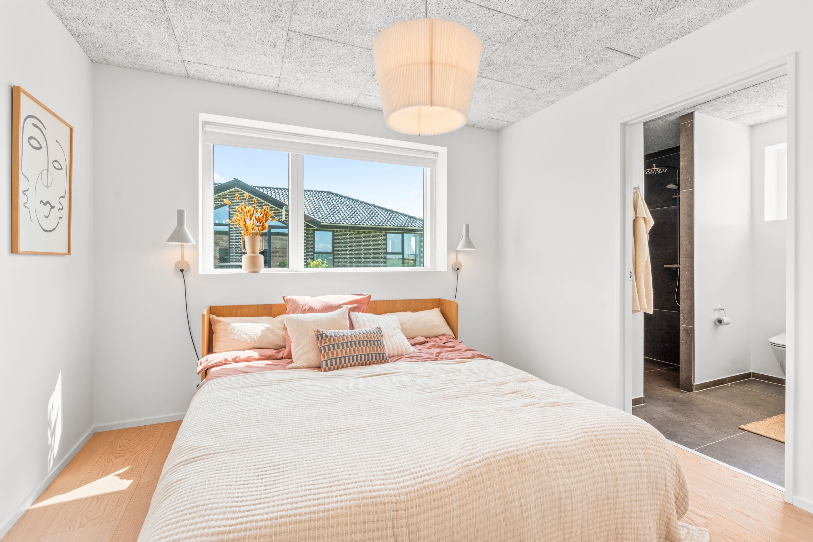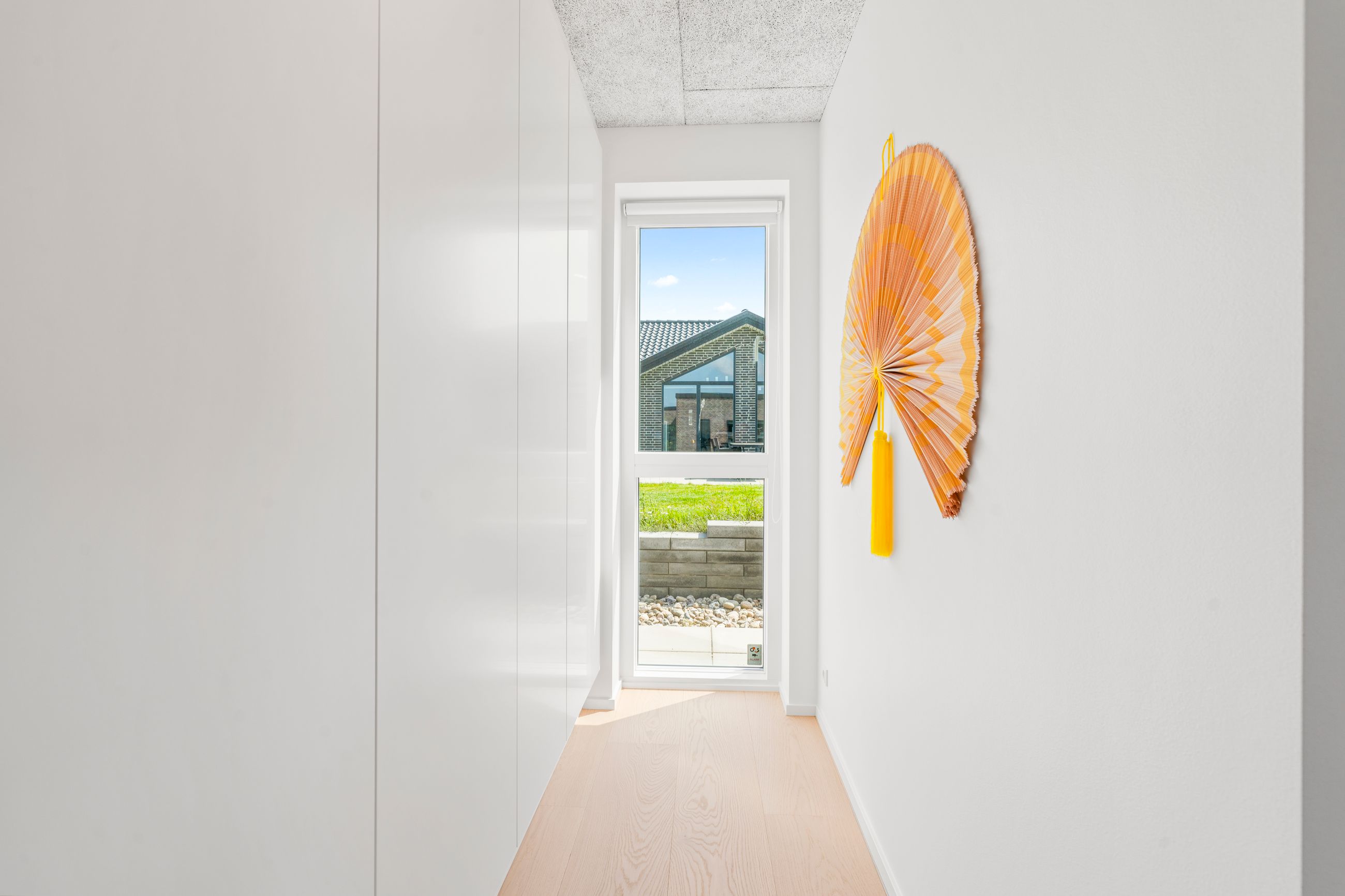 Planløsningen er gennemtænkt med tre rummelige værelser i den ene ende og en separat forældreafdeling i den anden, komplet med walk-in-closet. Begge badeværelser har integrerede shampoohylder, og der er kælet for detaljerne overalt – fra de massive døre til armaturer i rustfri stål og væghængte toiletter med skjult cisterne.