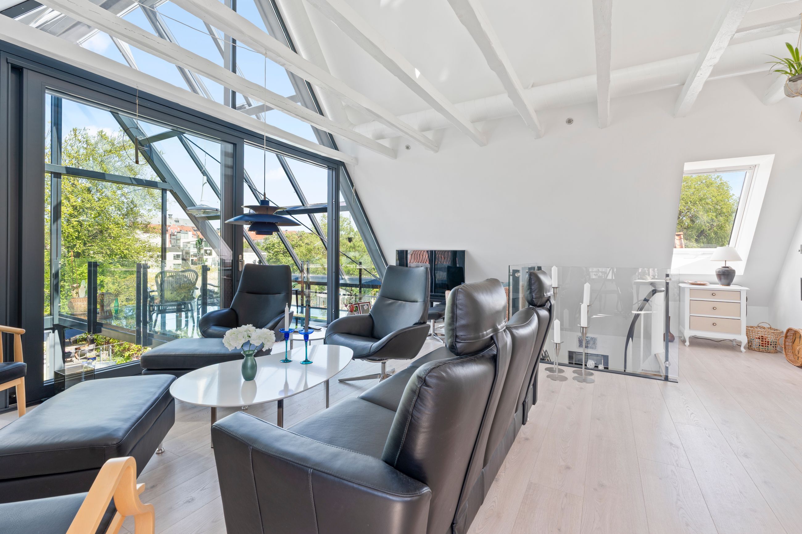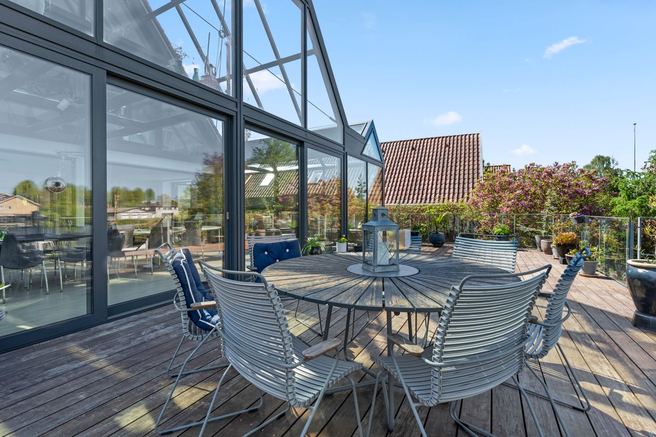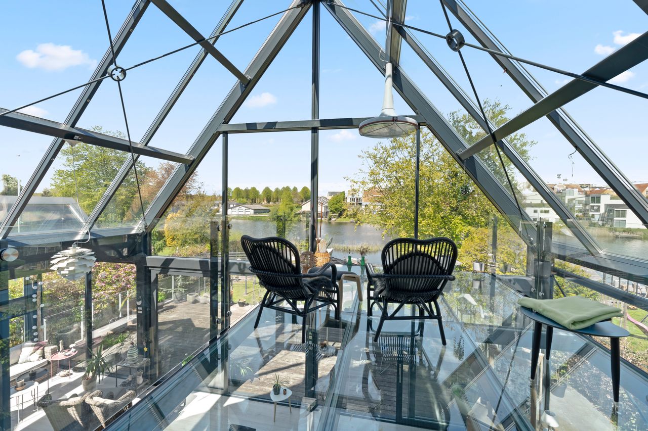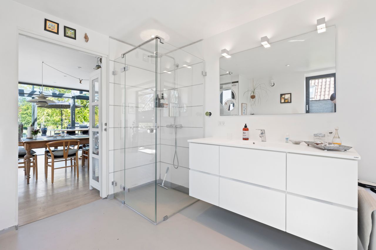 I stueplan findes desuden et elegant og stilfuldt badeværelse samt et soveværelse. Førstesalen rummer endnu et badeværelse, et soveværelse og en flot repos med adgang til en unik afdeling med glasgulv. Heroppe finder du også en kæmpestor hems med et utal af anvendelsesmuligheder – hvad end det er til leg, kontor, opbevaring eller kreative projekter.