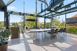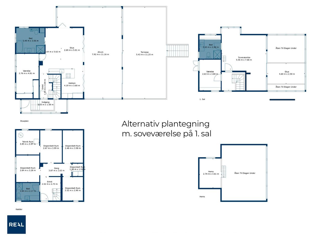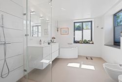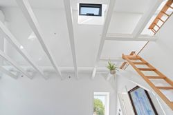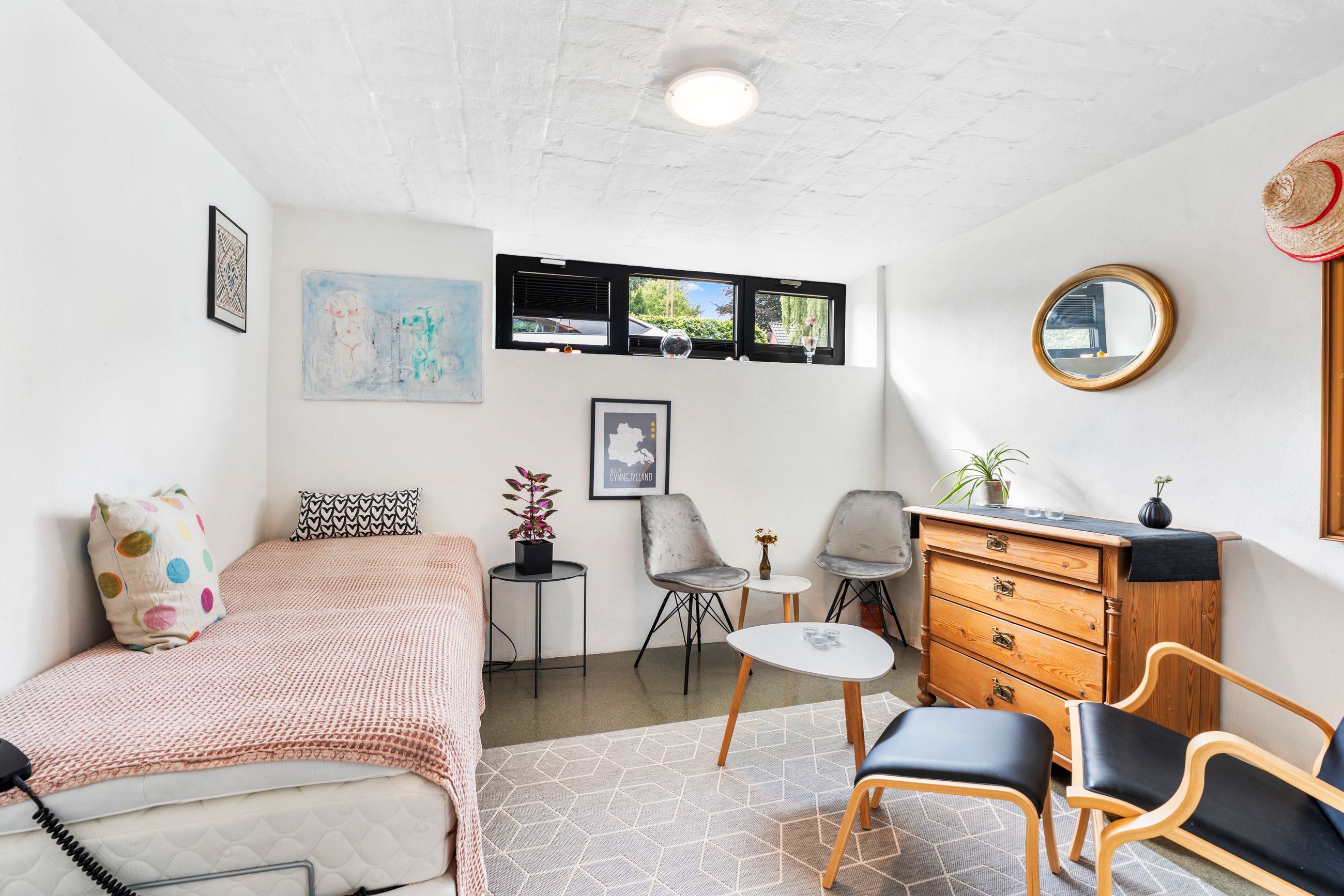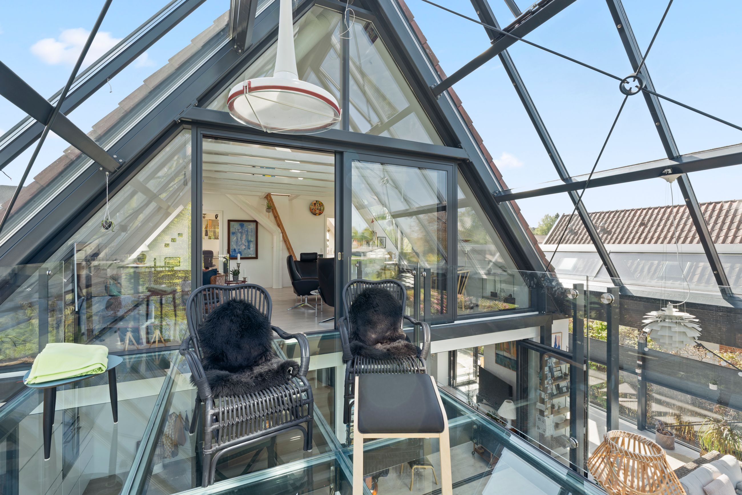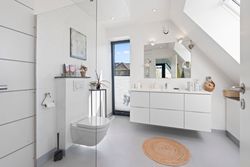I stueplan findes desuden et elegant og stilfuldt badeværelse samt et soveværelse. Førstesalen rummer endnu et badeværelse, et soveværelse og en flot repos med adgang til en unik afdeling med glasgulv. Heroppe finder du også en kæmpestor hems med et utal af anvendelsesmuligheder – hvad end det er til leg, kontor, opbevaring eller kreative projekter.