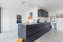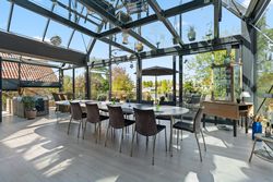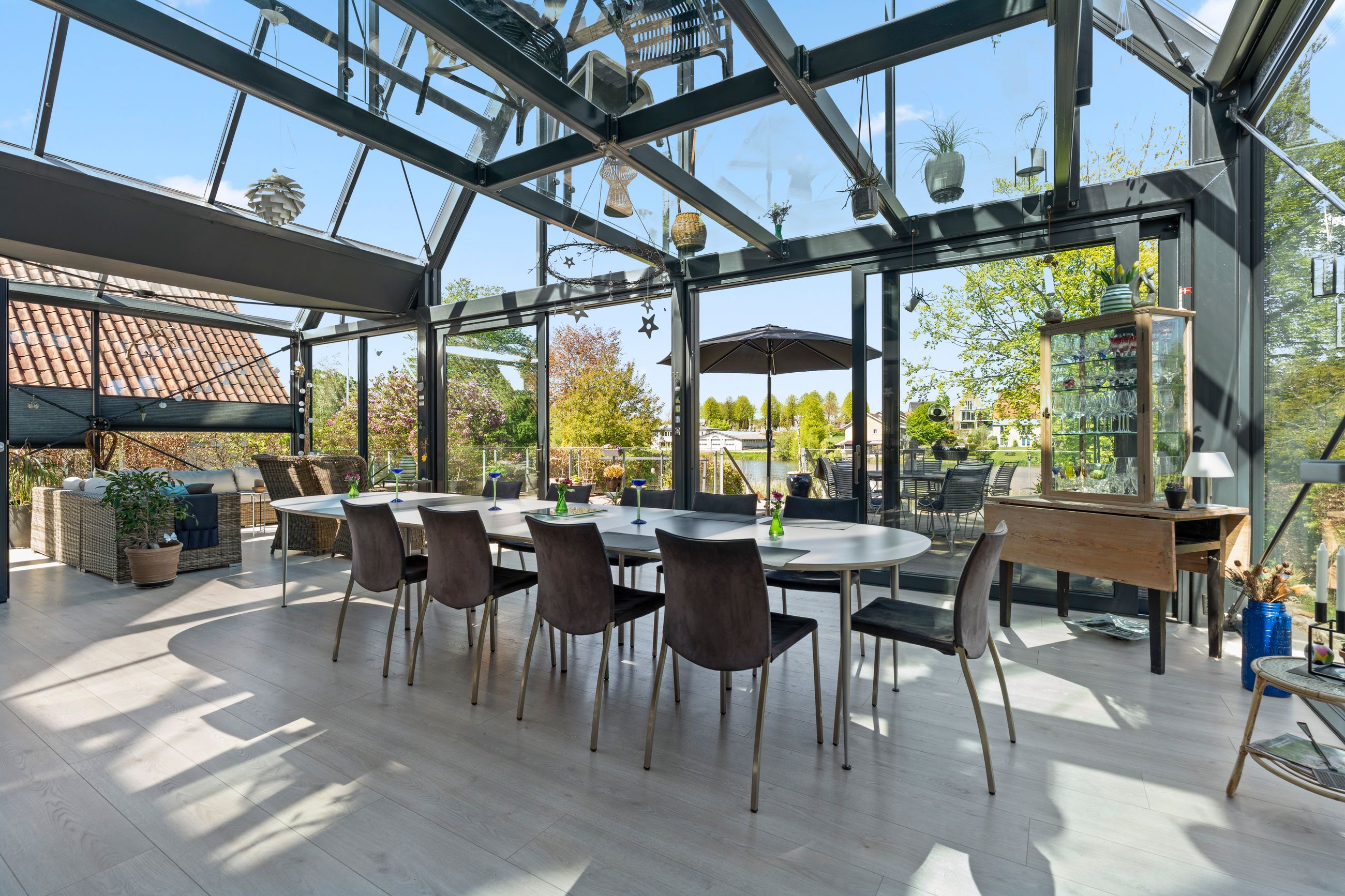 Du bydes velkommen i et smukt og indbydende vindfang, som leder videre til en lys og rummelig entré med god loftshøjde. Fra entréen tilgår du det store køkken-alrum, hvor glas-tilbygningen for alvor kommer til sin ret og giver en enestående følelse af at være ét med naturen. Rummet er intet mindre end spektakulært – et leverum i særklasse, hvor arkitektur og lys går op i en højere enhed. Her er der god plads til hele familien, til gæster, til fester og til hverdagsro. Store skydedøre giver mulighed for at åbne op til terrassen, så ude og inde smelter sammen.