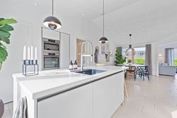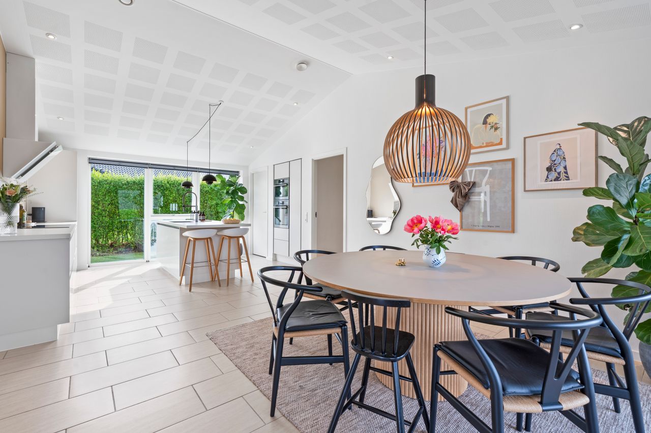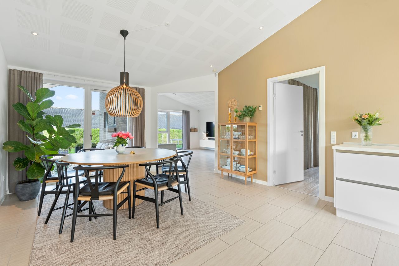 Det store køkken-alrum er hjemmets hjerte – et imponerende leverum med masser af naturligt lys, et lækkert køkken med indbygget viktualierum og rigelig plads til både hverdagsmåltider og store sammenkomster. Her er virkelig en atmosfære, der indbyder til samvær og liv.