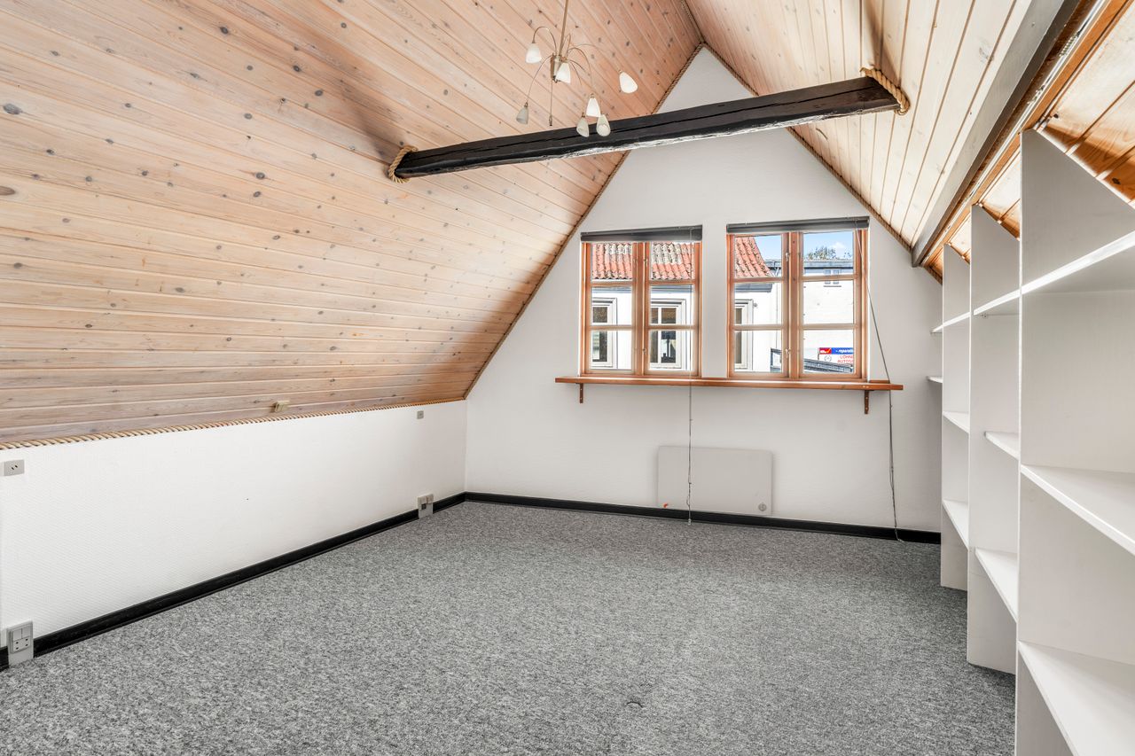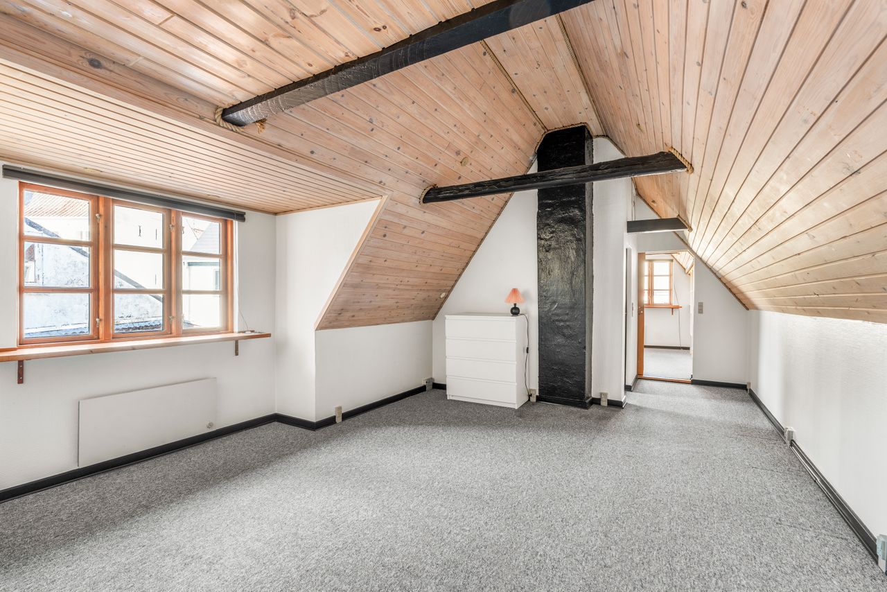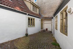 Udenfor er der en lille og overskuelig gårdhave, hvor man kan nyde eftermiddagssolen i fredelige omgivelser. Her får man en sjælden kombination af byliv og privatliv – med gågaden, indkøb, caféer og Damparken lige rundt om hjørnet, men stadig med følelsen af ro og tryghed i hverdagen. Et ideelt hjem for dem, der ønsker en bolig med karakter og mange muligheder.