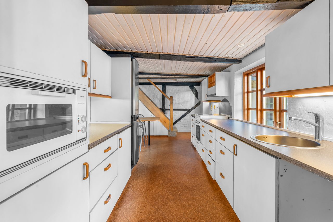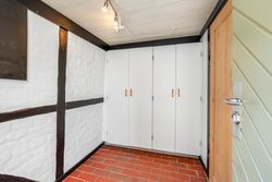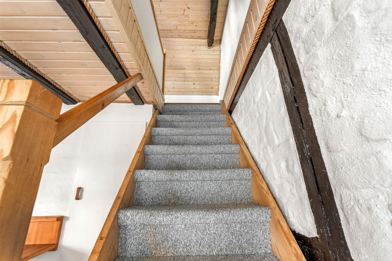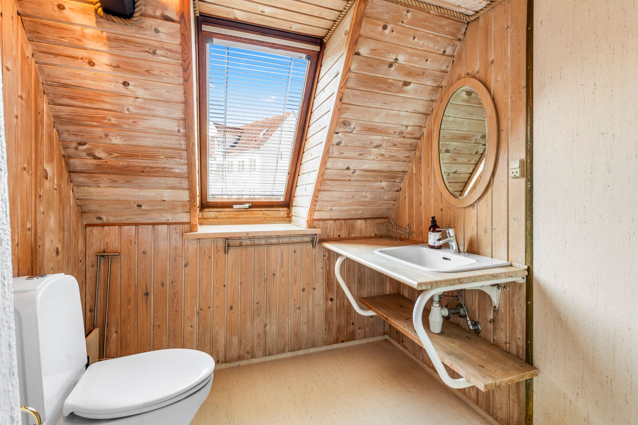 På førstesalen ligger det store soveværelse, et lyst badeværelse samt et rummeligt repos, der let kan indrettes til et ekstra værelse, hjemmearbejdsplads eller multirum. I udhuset er der desuden et ekstra toilet og endnu et disponibelt rum, som giver flere anvendelsesmuligheder – eksempelvis som opbevaring, vaskerum eller værksted.