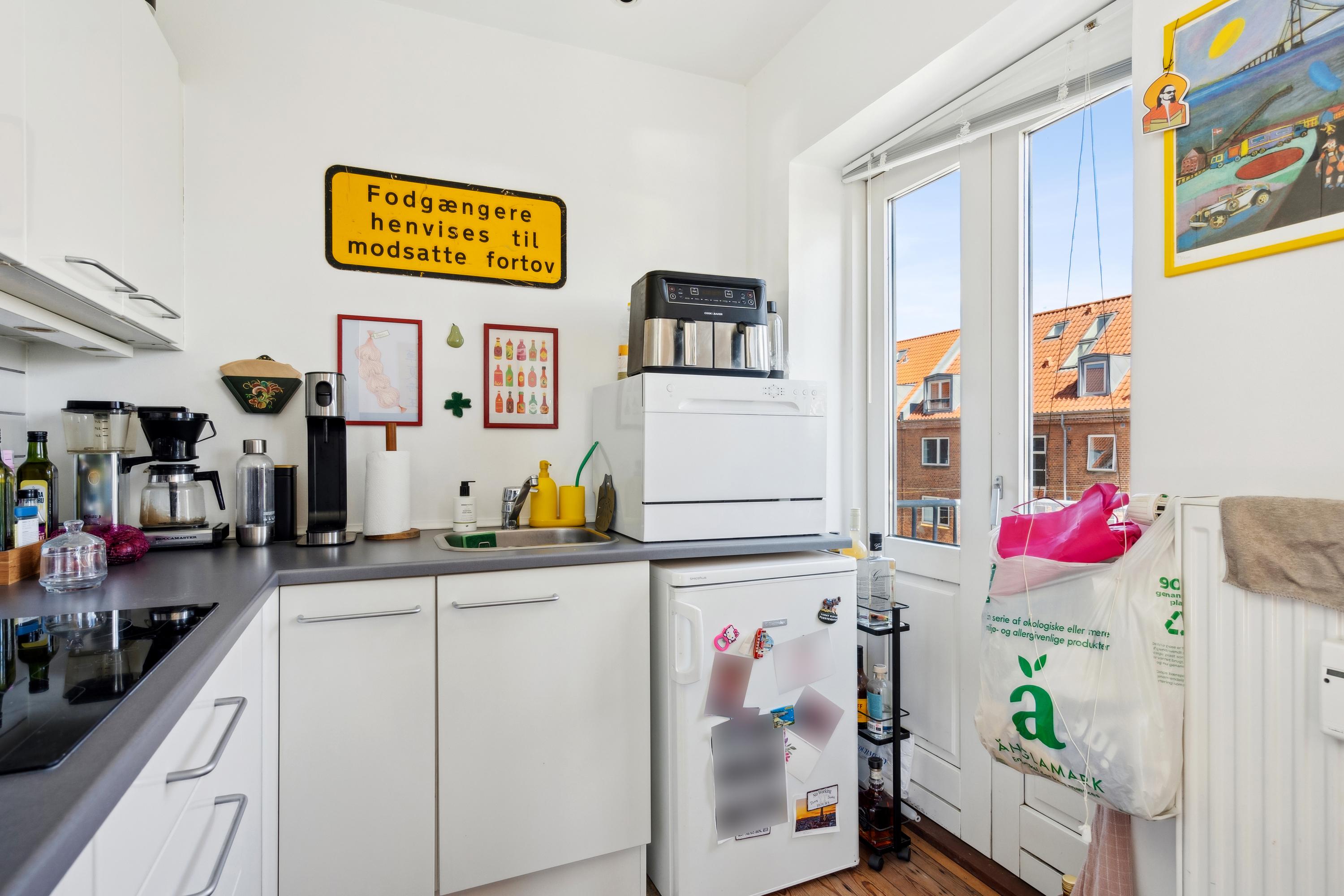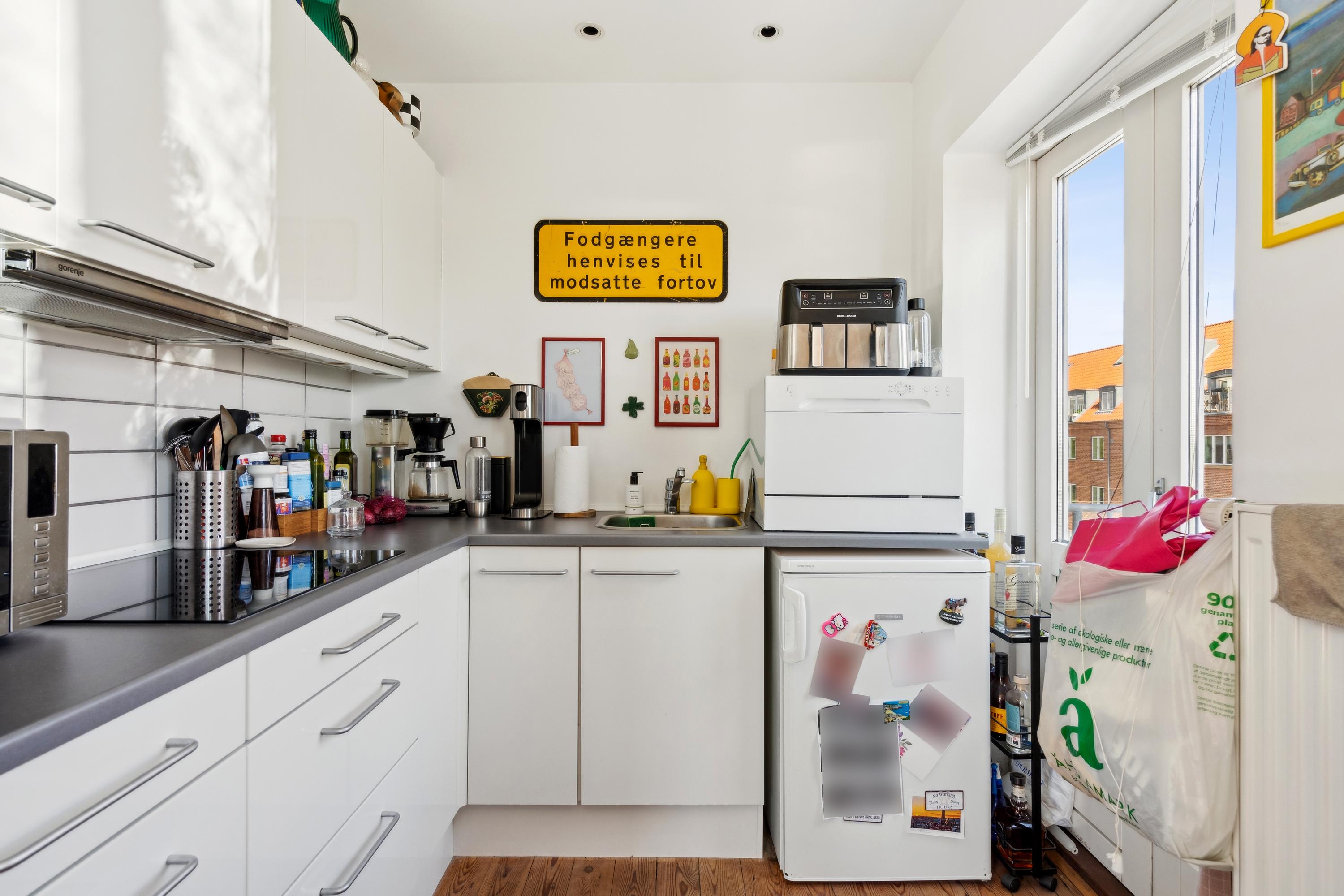 Rigtig flot 1-vær på Silkeborgvej, her er lækkert badeværelse med brus, hvide fliser, toilet og vaskeskab, bemærk her er badeværelset udvidet i størrelsen i forhold til lign. lejligheder i området. Flot nyt køkken med indbyggede spot i gipsloftet, også køkkenet er her lavet større end