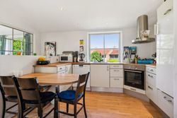 Køkkenet er blevet moderniseret med øje for både funktionalitet og æstetik. Her er der åbnet op mod resten af villaen, hvilket skaber en lys og luftig atmosfære. Loftet går helt til kip, hvilket bidrager til den rummelige følelse i hele huset. Den store opholdsstue fungerer som husets hjerte med plads til både spise- og sofaafdeling samt en hyggelig brændeovn, der sikrer varme og hygge på kølige aftener. Fra stuen er der direkte udgang til en dejlig aftenterrasse – perfekt til afslapning eller underholdning.