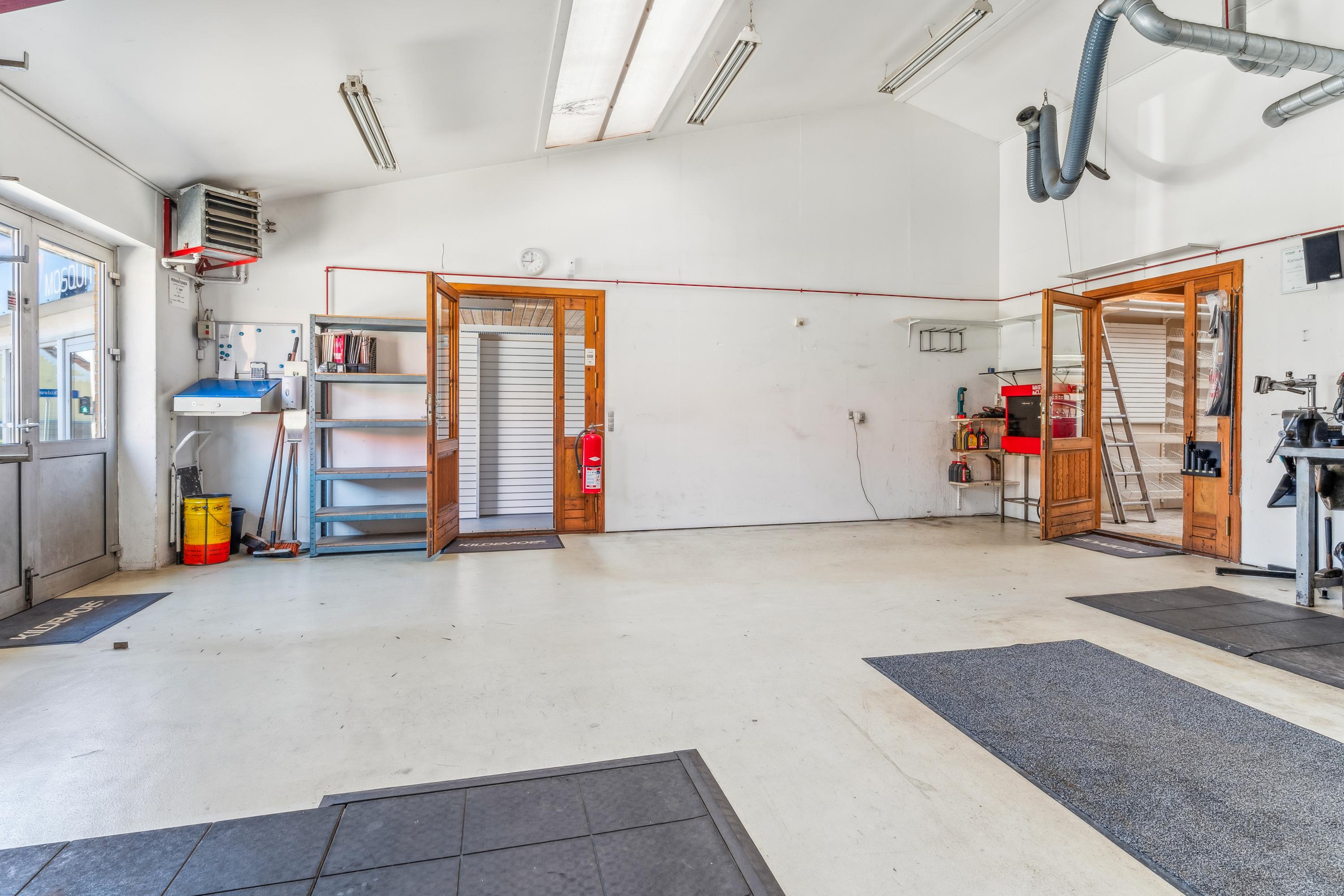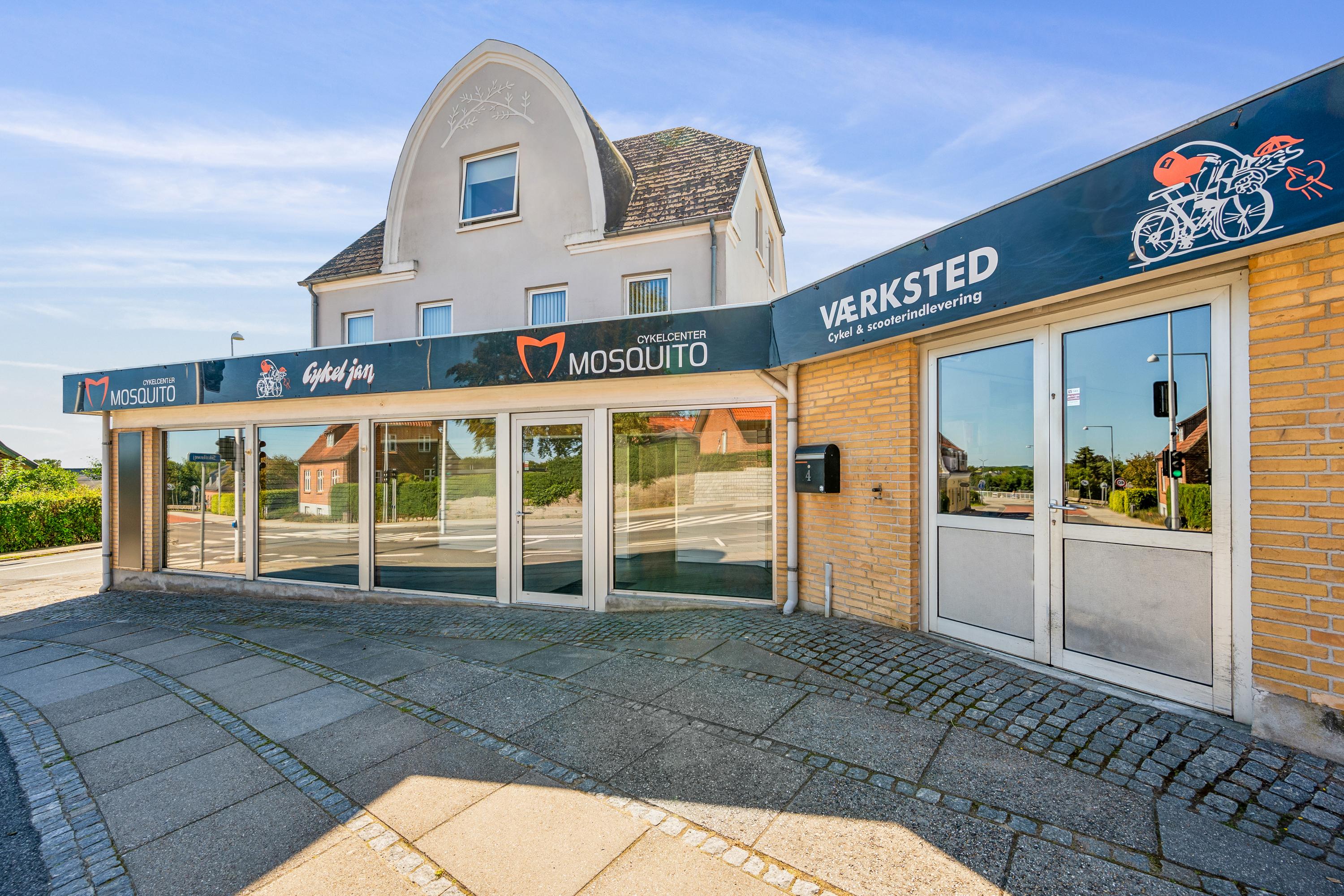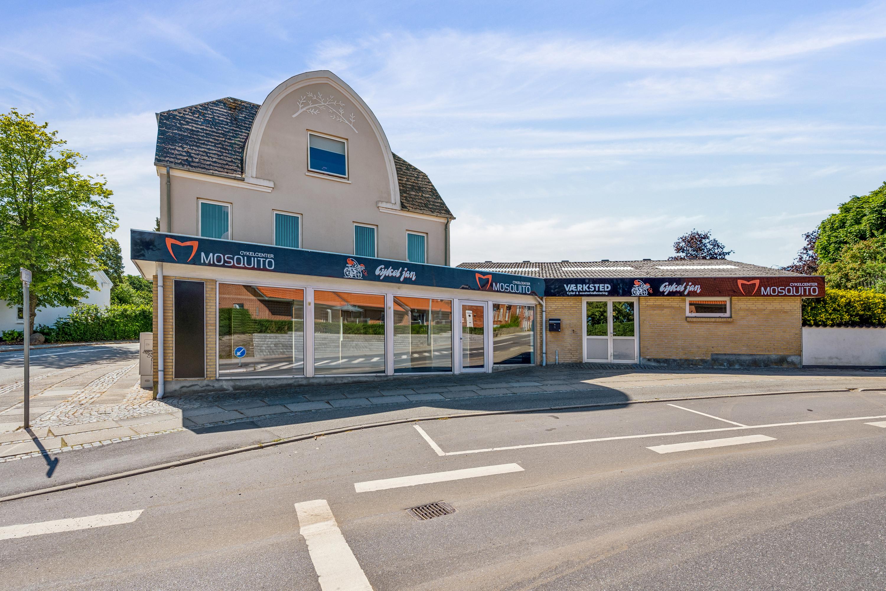 Her får du bl.a.: 135 m2 bolig på 1. og 2. sal, 251 m2 erhverv i stueetagen med butik og værksted/lager, 59 m2 dobbelt garage beliggende i forlængelse af erhvervsdelen og 46 m2 udhus, der er opdelt i flere