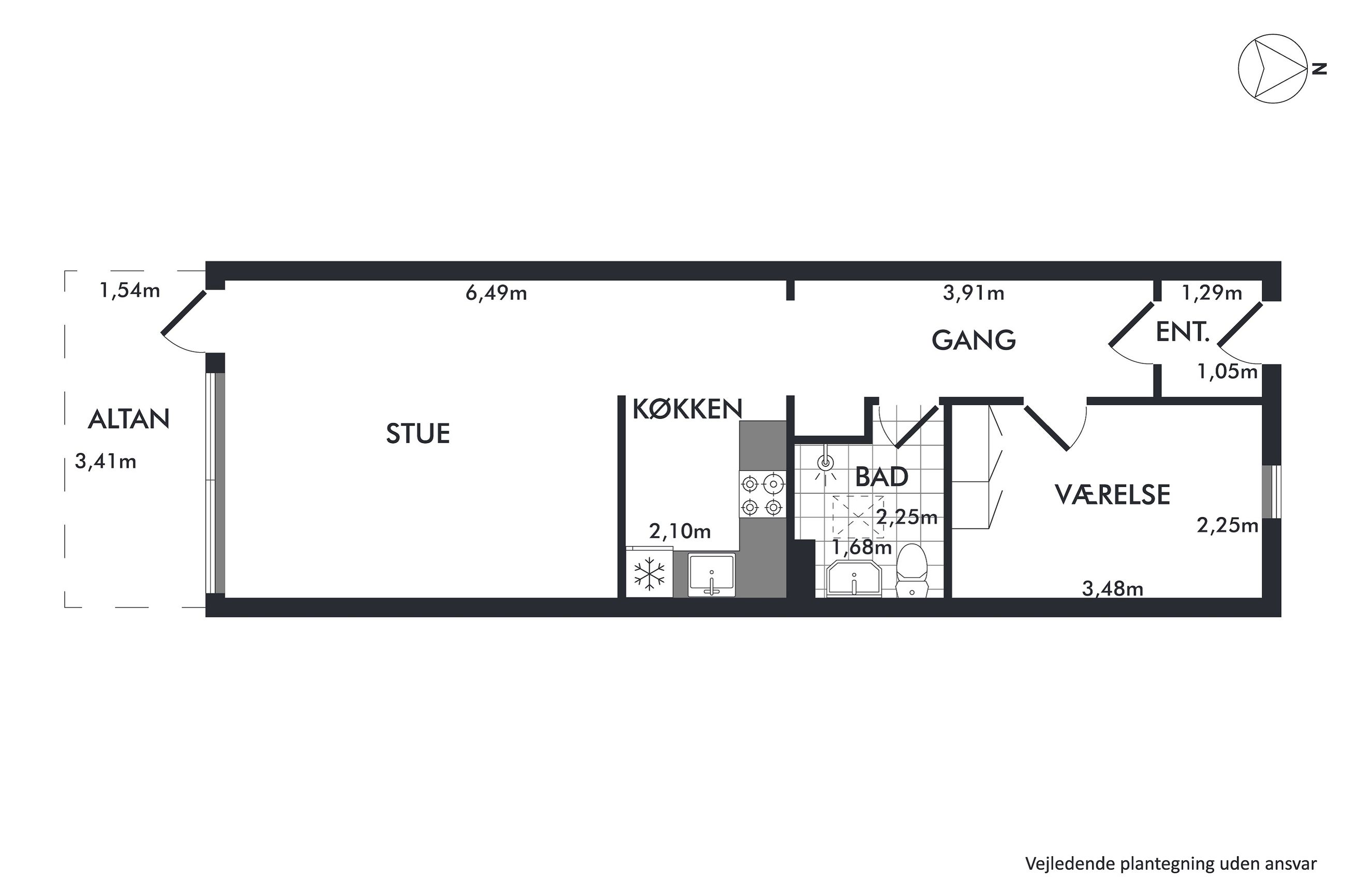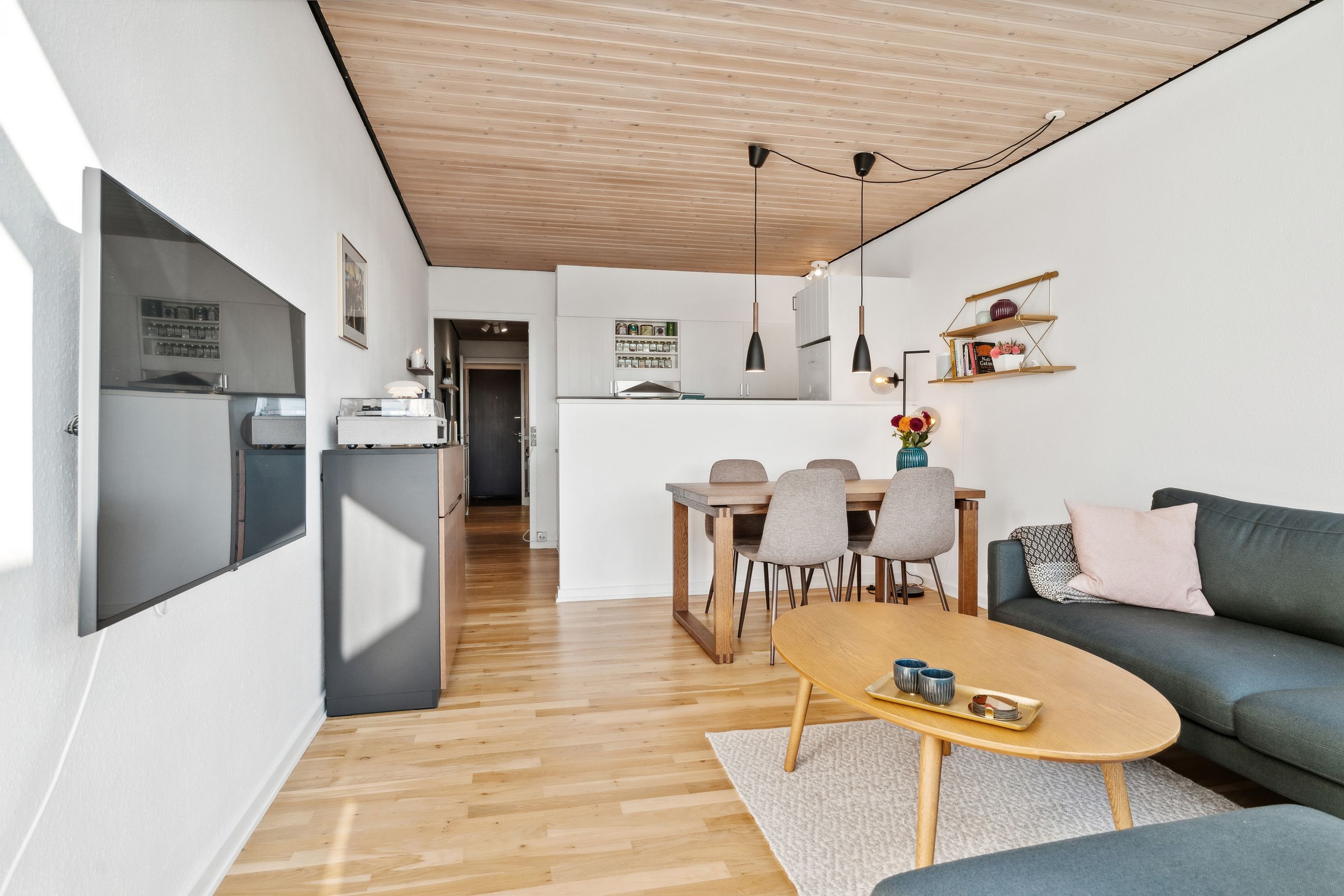Lejligheden byder på 47 veludnyttede kvadratmeter og fremstår indflytningsklar. Hjertet i lejligheden er det store, lyse køkken/alrum, som er pænt, funktionelt og har masser af skabsplads. Køkkenet og stuen er adskilt af en halvmur, hvilket gør, at man stadig kan have en samtale med sine gæster, mens man er i køkkenet. Derudover er halvmuren med til at skabe en følelse af, at stuen er et rum for sig selv. I forlængelse af den store, lyse stue har man direkte adgang til en privat, sydvendt altan, hvor du kan nyde solen i rolige omgivelser.