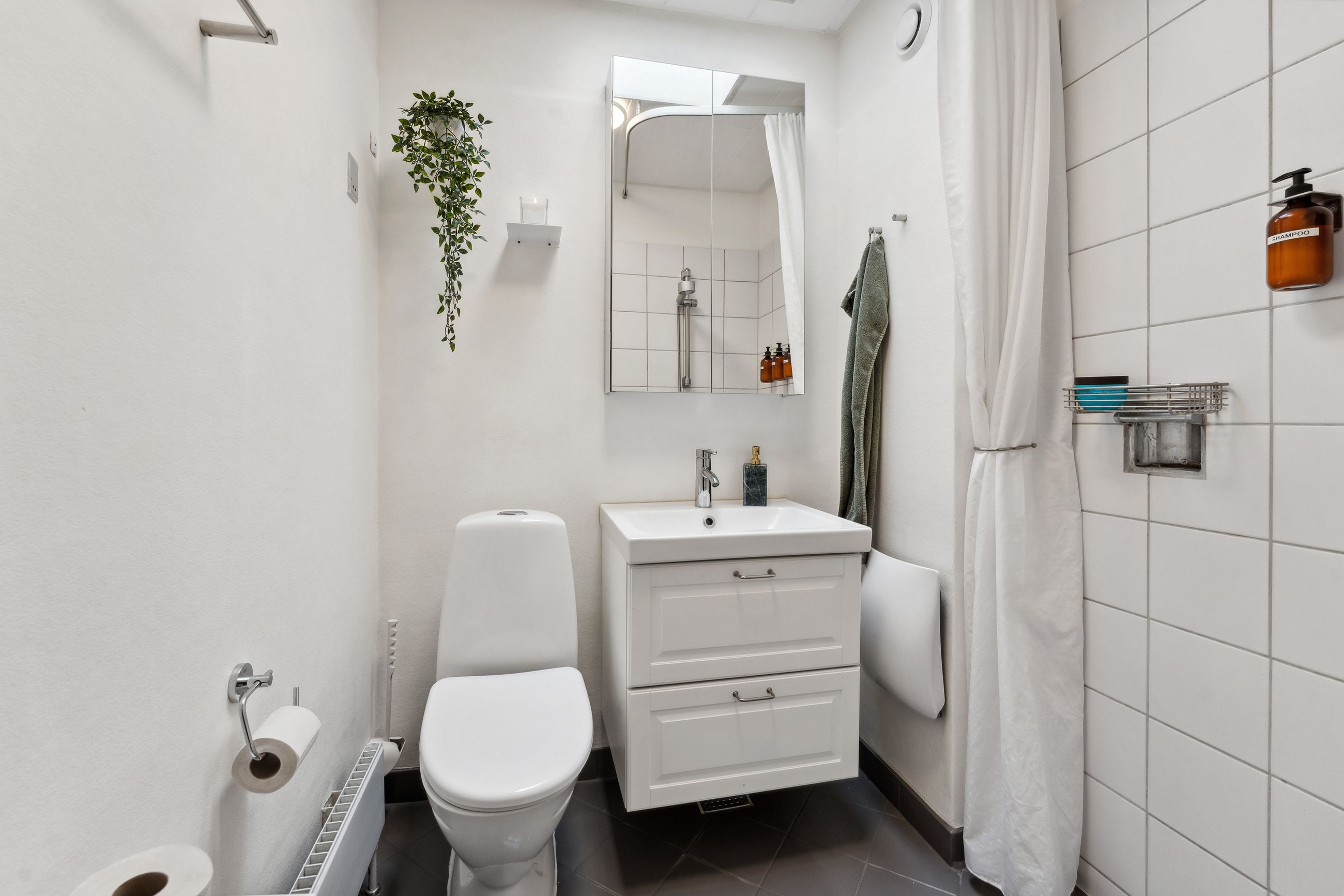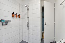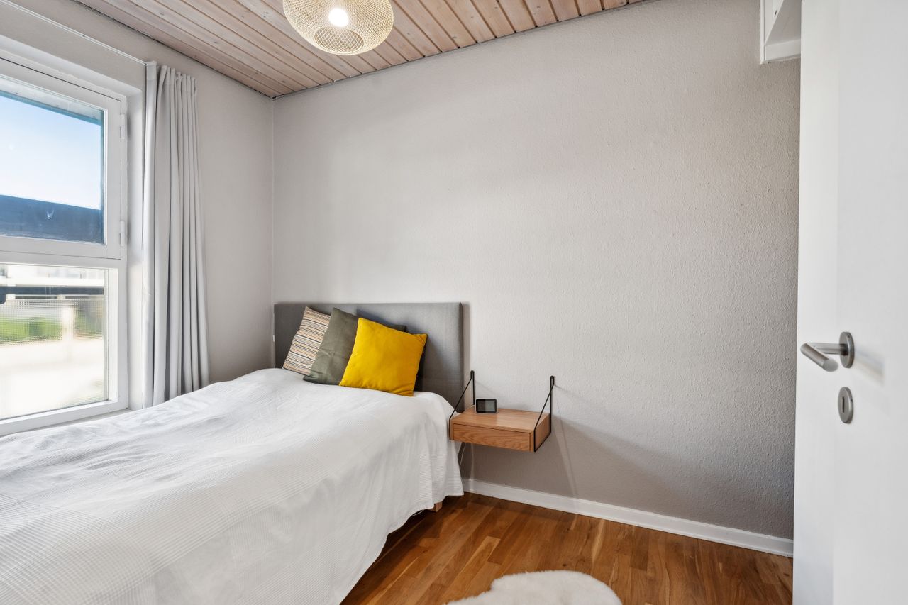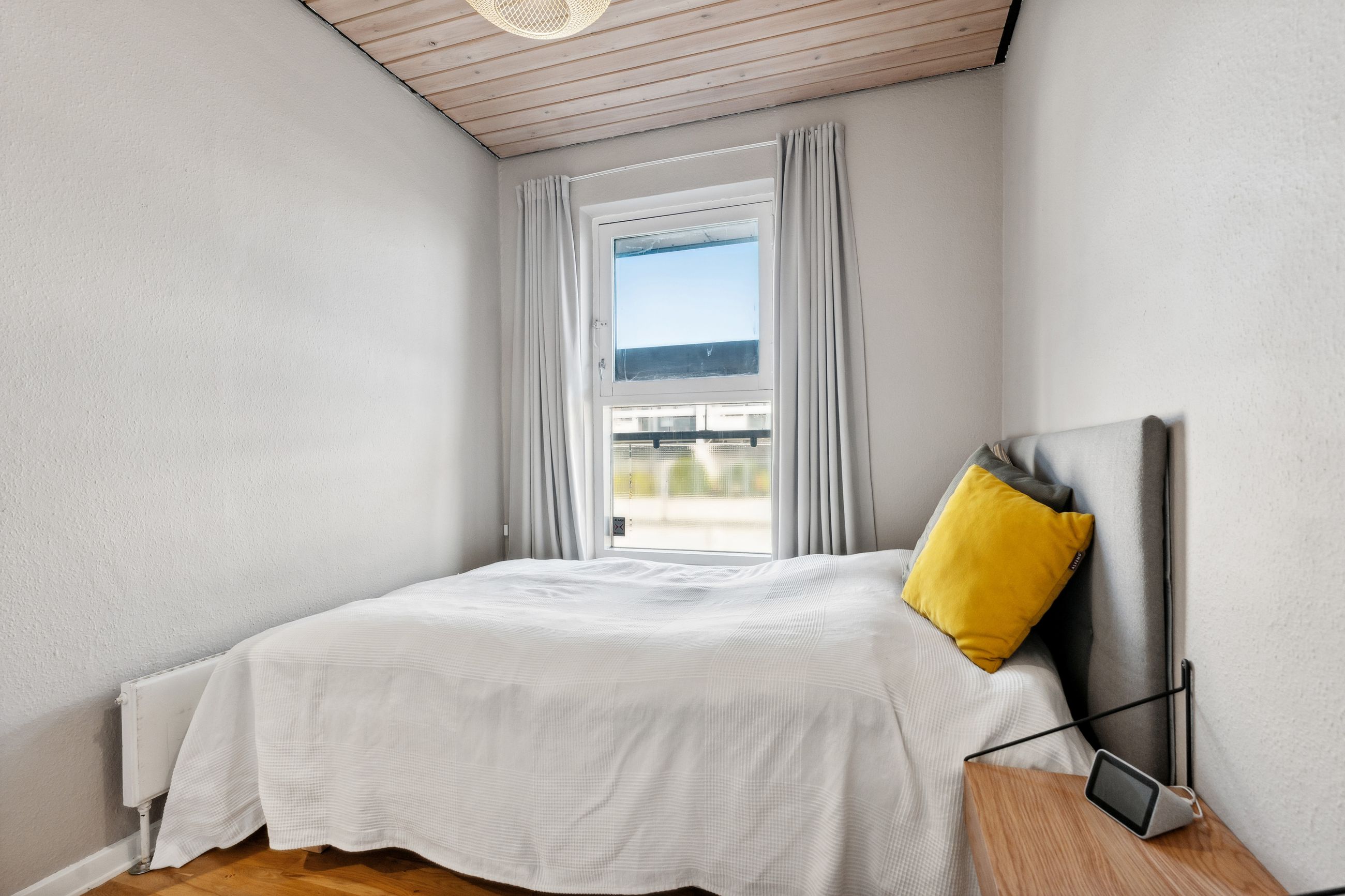 Soveværelset er godt udnyttet med indbyggede skabe, der giver god opbevaringsplads. Badeværelset er funktionelt og moderne, udstyret med bruseniche, håndvask, toilet og spejl og fremstår pænt.
