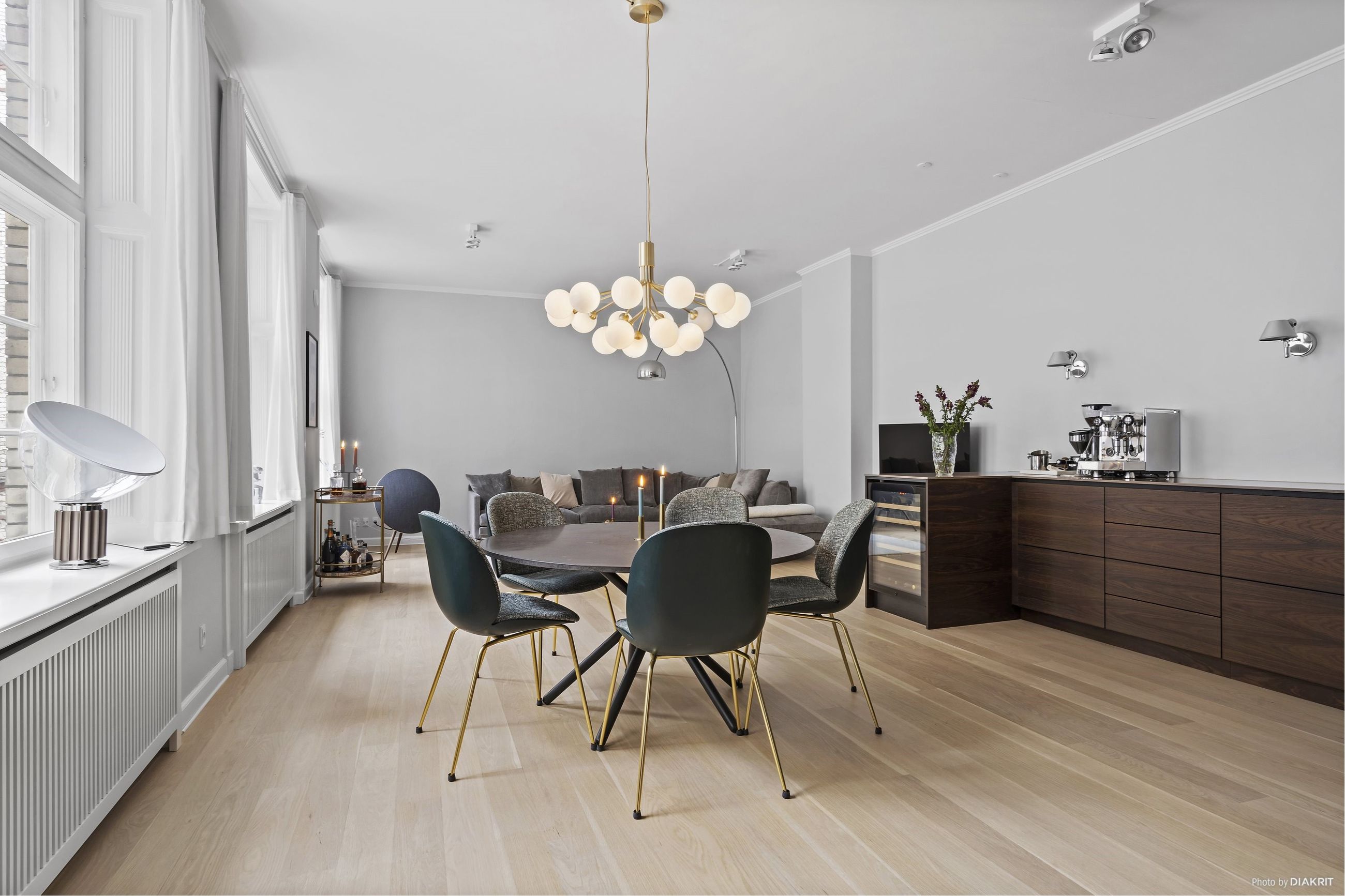Lejligheden i nummer 17 ligger som en stille landsby inde bag gadens facader. Ingen gadetrafik, ingen støj fra glade og højlydte mennesker. Og lejligheden, ja, pivlækker er nok en mindre underdrivelse. Tydeligt er det, at den er renoveret med fokus på kvalitet og respekt for historien. Den massive egetræsdobbelthoveddør forpligter, for den fortæller lidt om, hvad man kan forvente inden for. Copenhagen Furnishing har stået for renoveringen. Her er valg af møbler og armaturer i henholdsvis gæsteværelse, master bedroom, garderobe og køkken og badeværelse stemt så højt oppe på øverste hylde, at kun de færreste kender mærke og producent. Alt fra gadeentré til opgang og alle 112 m2 i lejligheden er renoveret helt i bund, det er plug and play, det er et farvel og tak til grålighedens ligemageri og goddag til en hverdag med borgerlig elegance og pæne manerer. Og fra den store fælles tagterrasse, midt i det centrale København, kan man nyde de lange sommerdage og aftener.